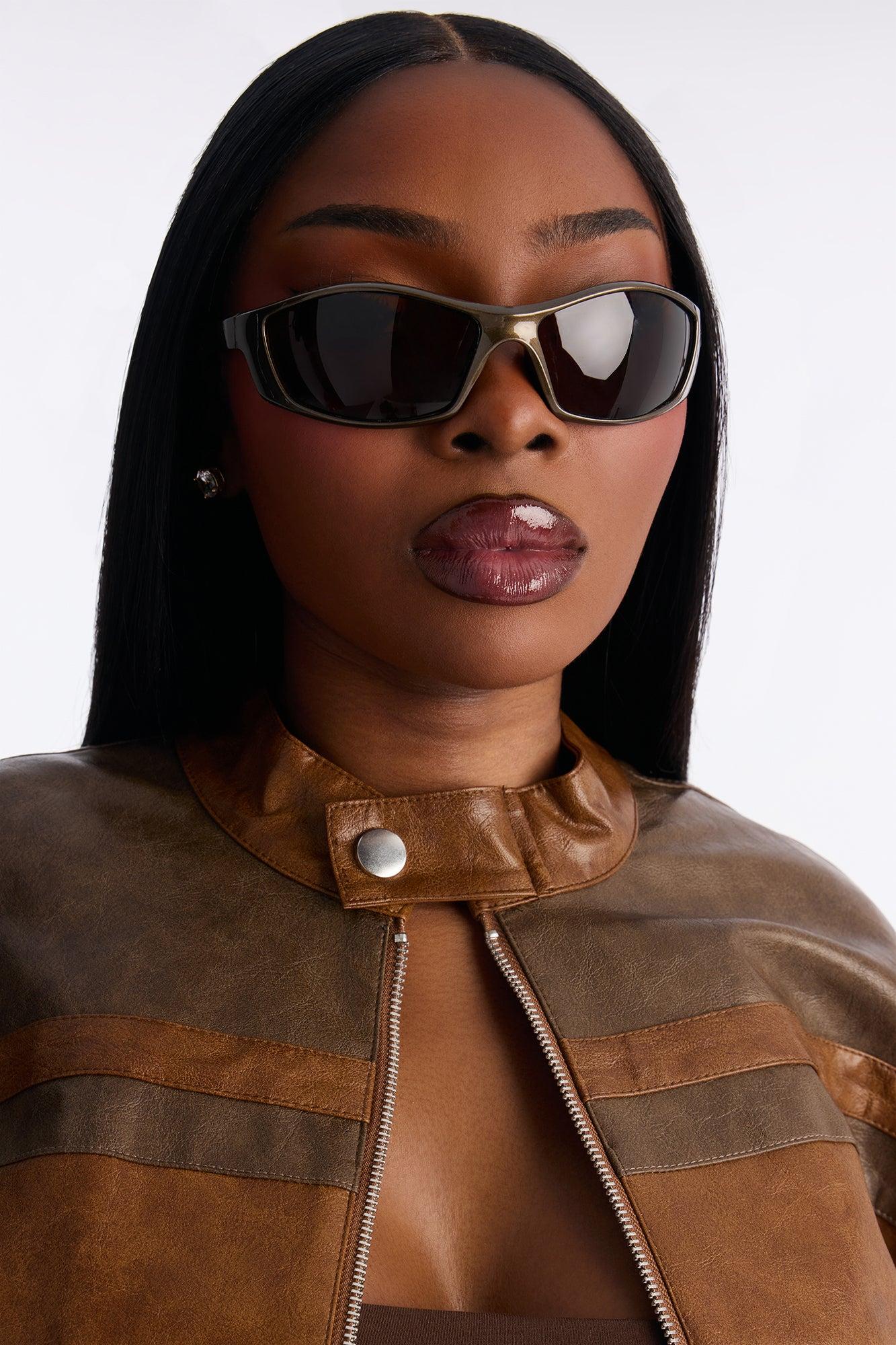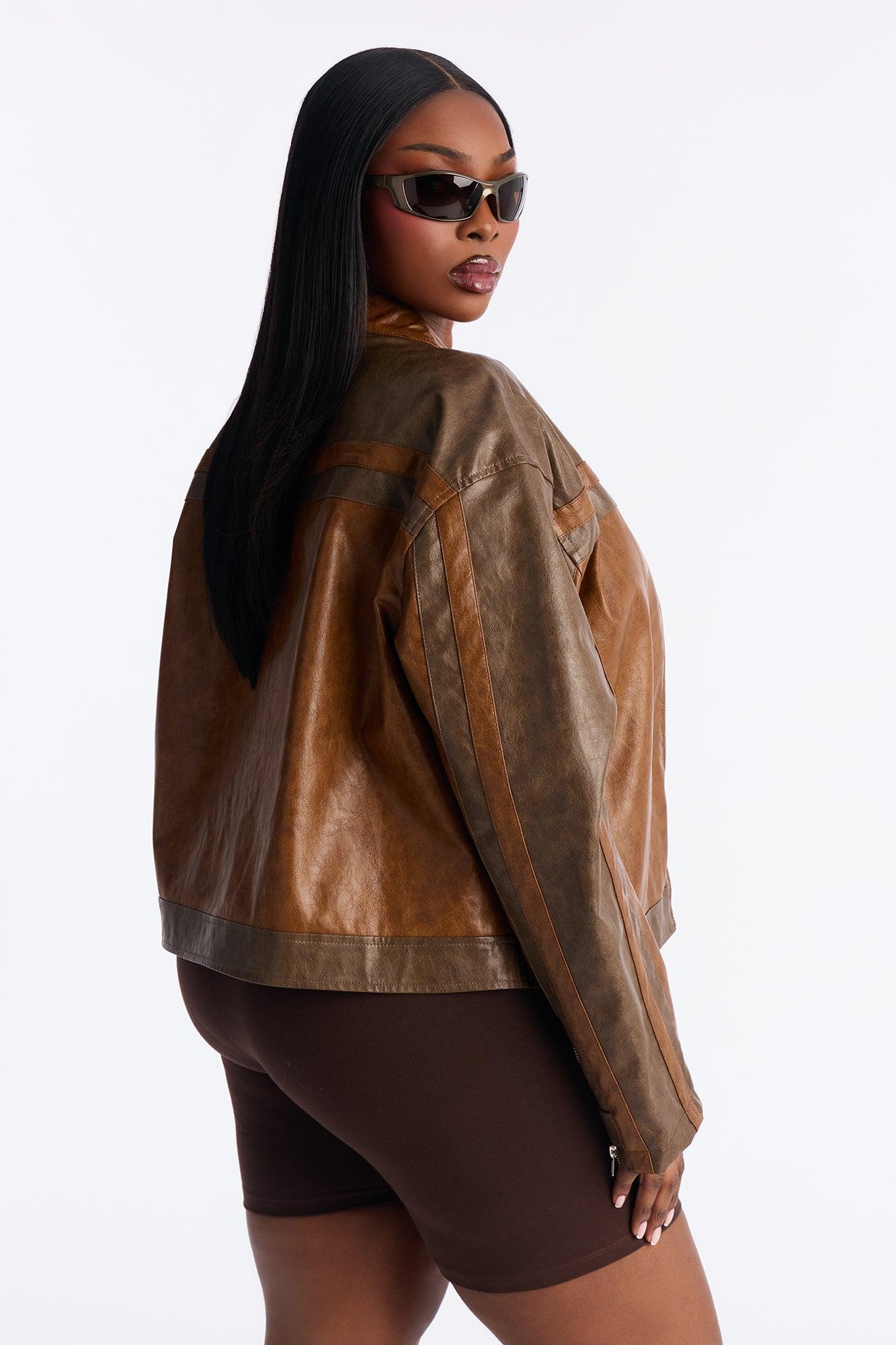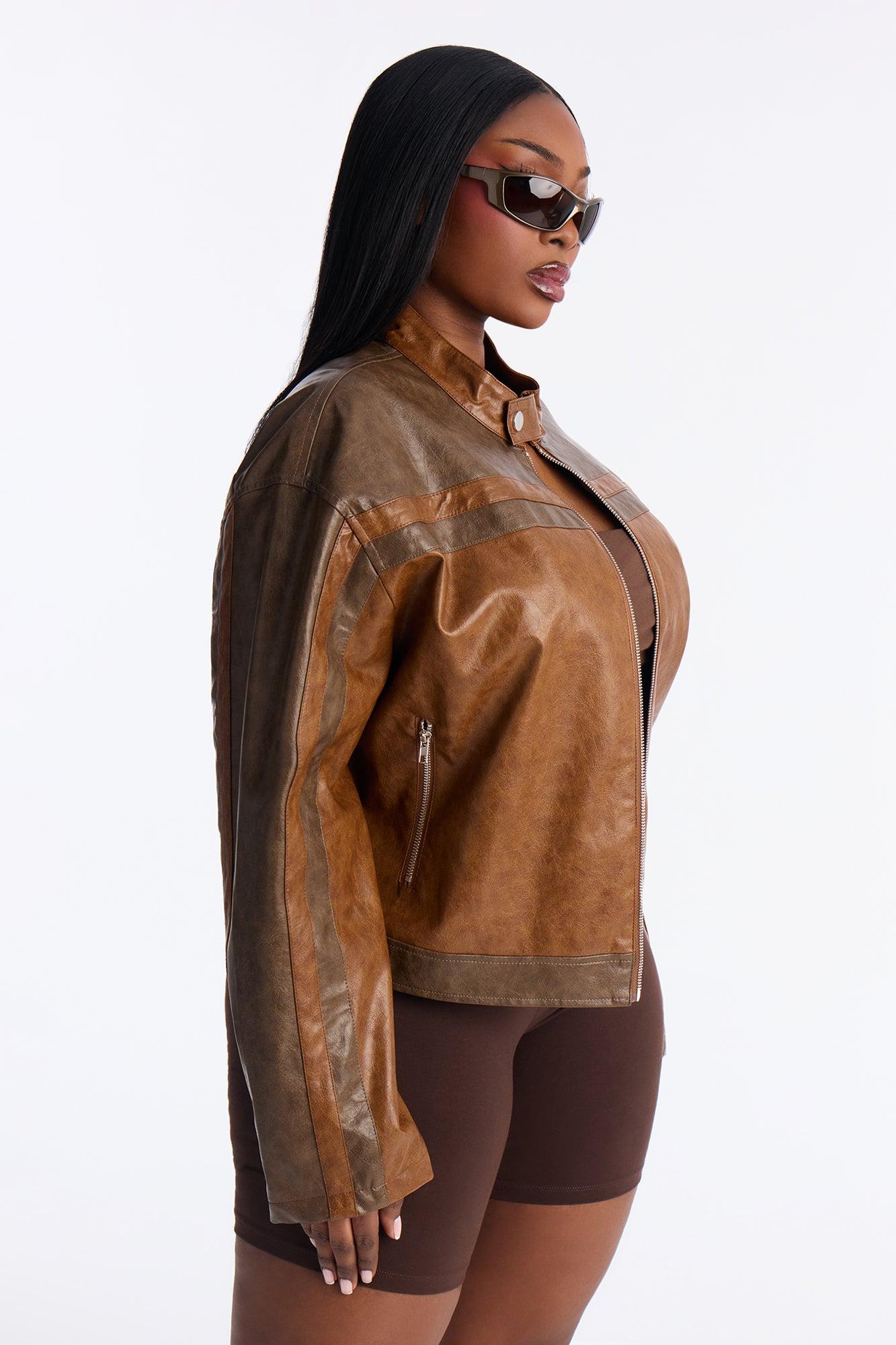 Available In Brown. Moto Jacket Collar Long Sleeve Faux Leather Fully Lined Self: 100% Polyester with Polyurethane Coating Lining: 100% Polyester Imported California Proposition 65WARNING: Cancer and Reproductive Harm - www.P65Warnings.ca.gov.