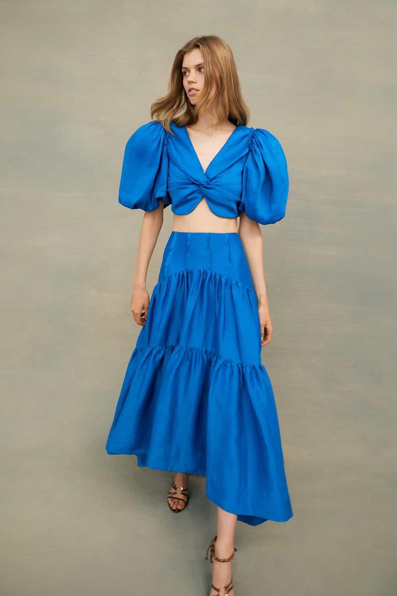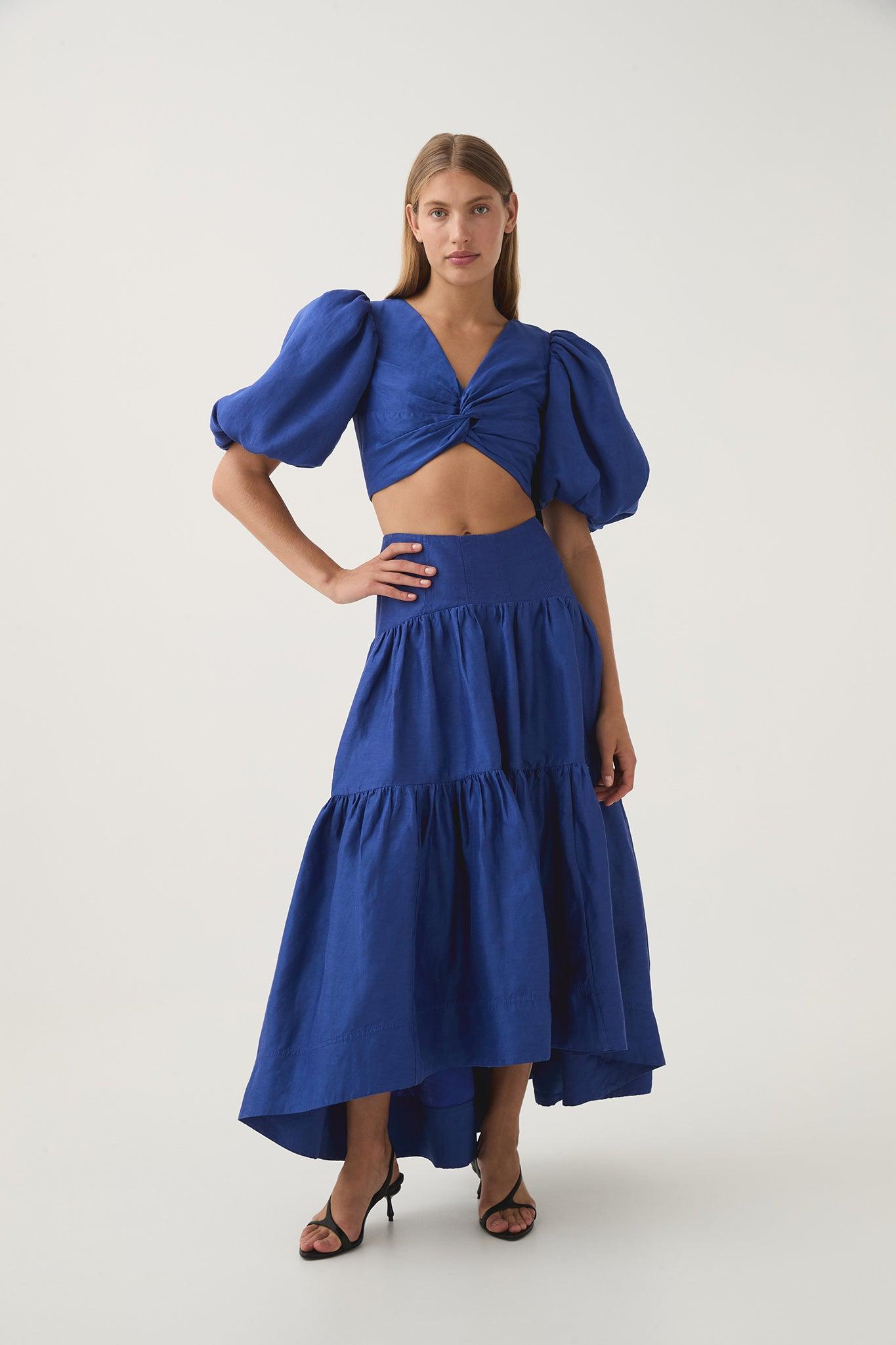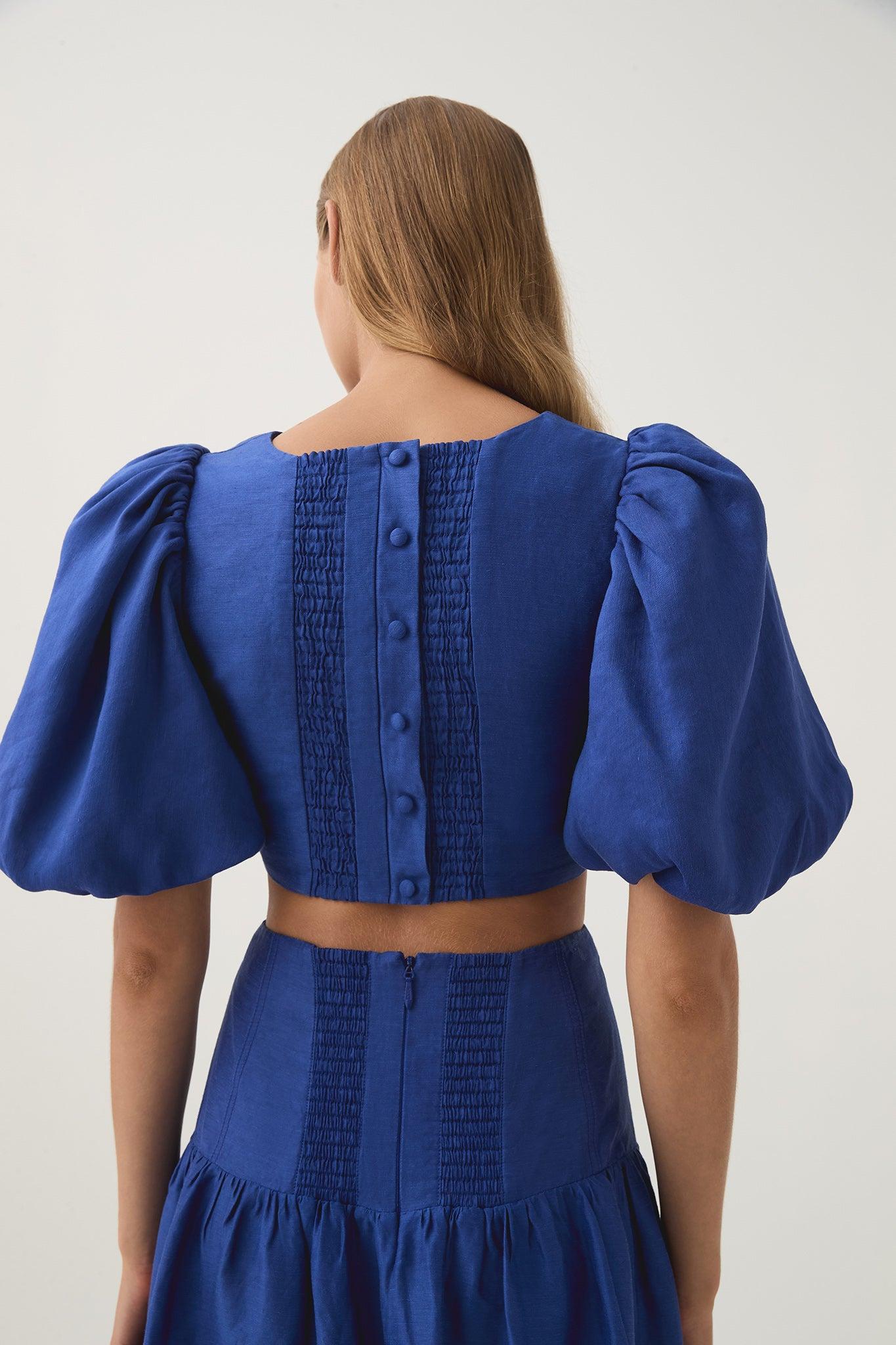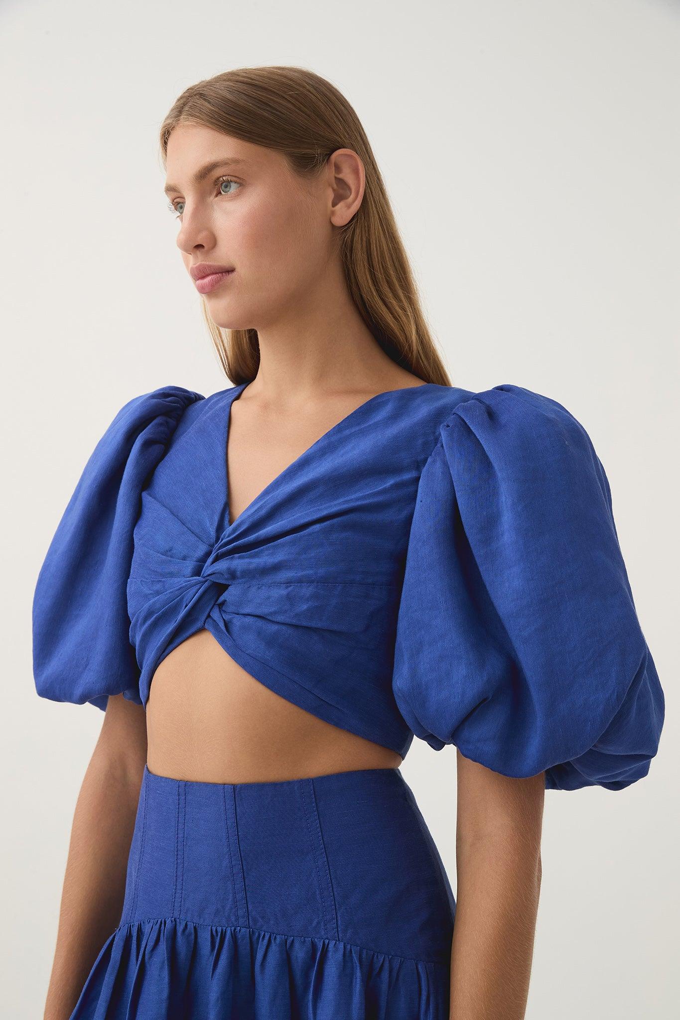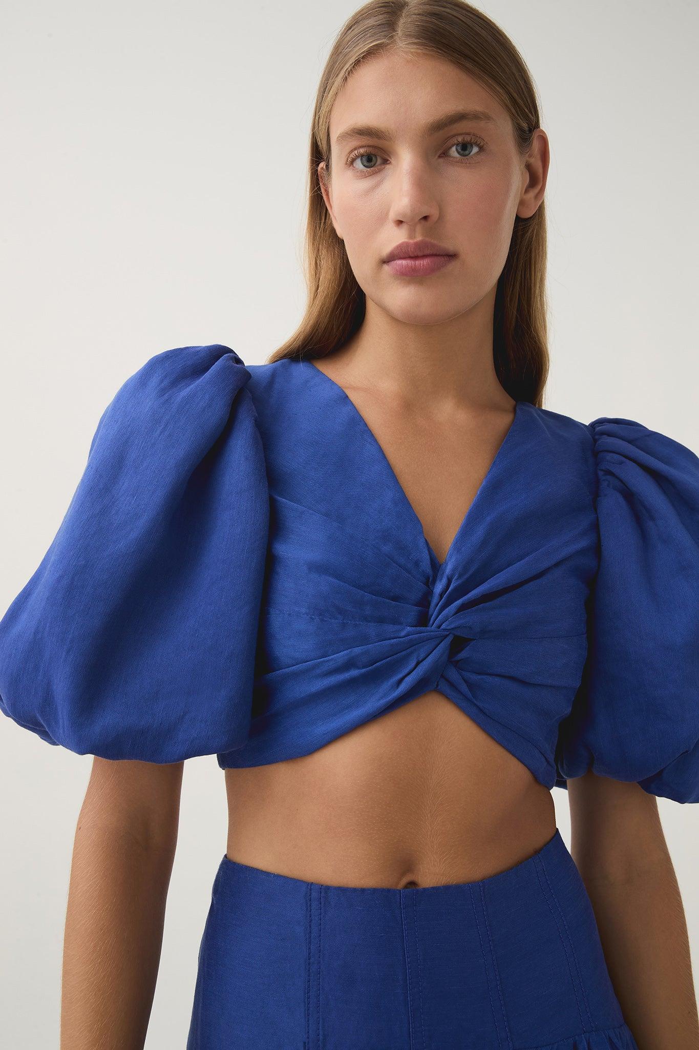 PRODUCT DETAILS V-shaped neckline Puff sleeve gathered at sleeve head Twist at bodice Zipper at centre back with zipper flap Darts at back waist Raw cut seams throughout Cropped style Shop All Tops SIZE AND FIT Model wears a size AU 8/S Model: 173cm/5'8 Bust: 79cm Waist: 61cm Hips: 86cm FABRICATION Main: 69% Linen 31% Viscose Lining: 100% Cotton Dry Clean Only