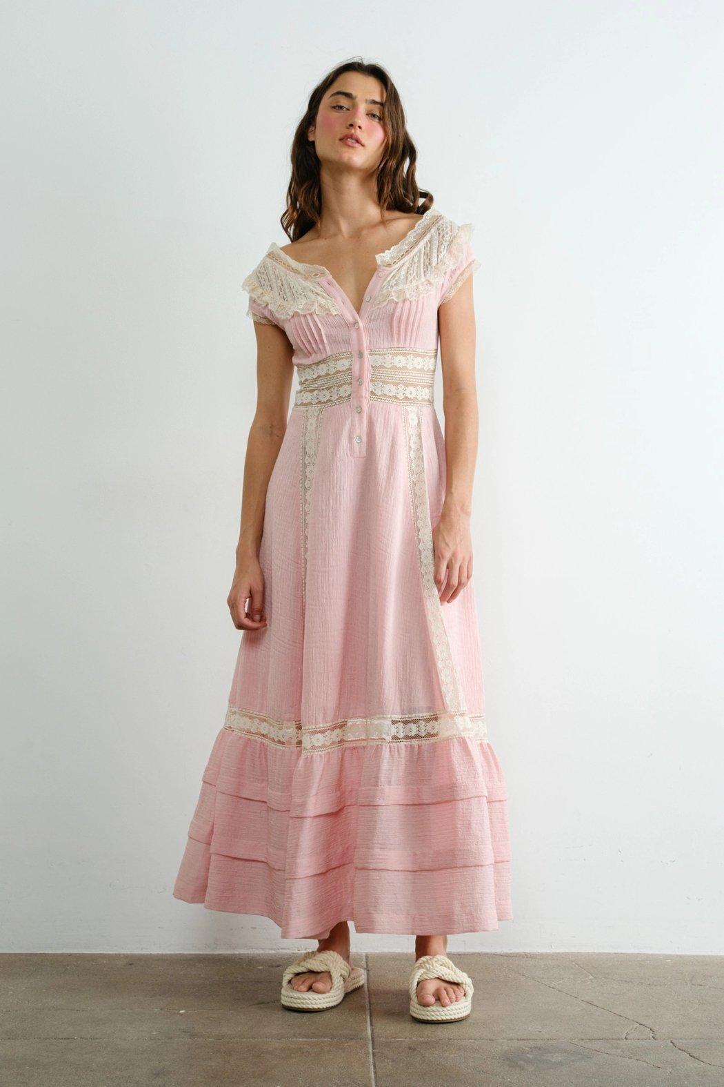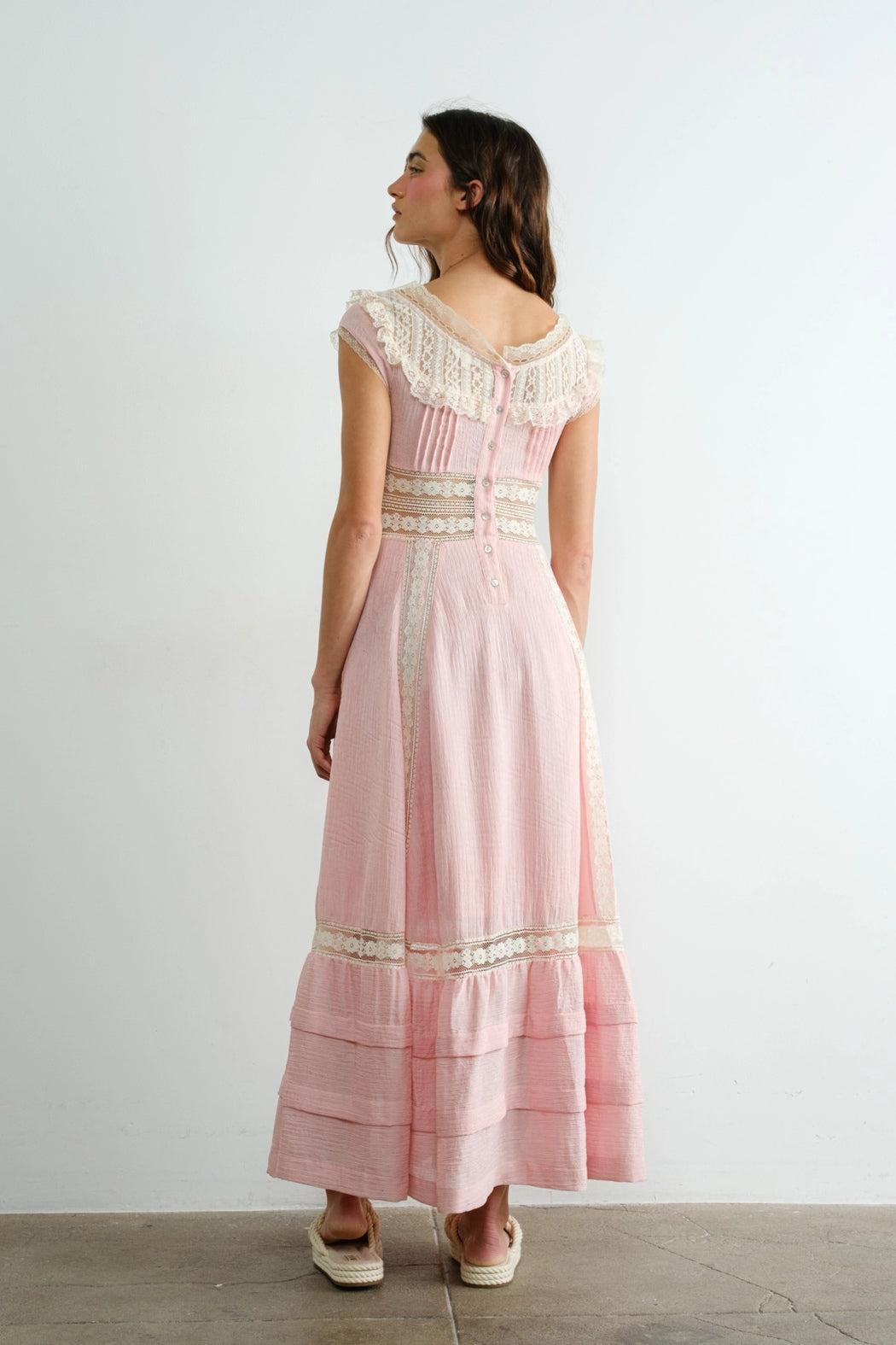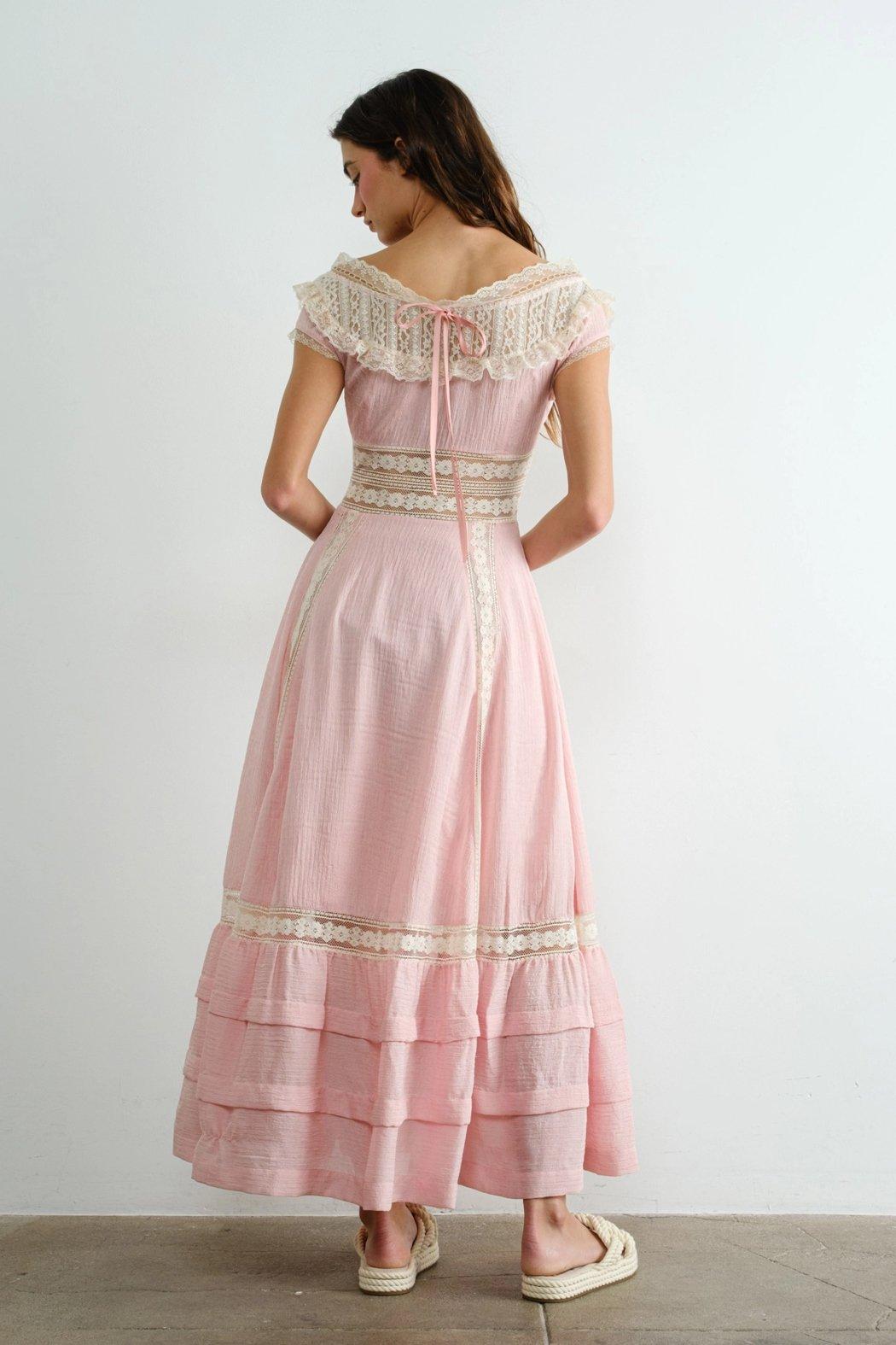 Features delicate lace details, pleated accents, and a flowy silhouette, perfect for an effortlessly elegant look. Designed with a functional button-down front, this piece can be worn both forward and backward, offering two unique styling options in one dress. The soft pastel hue, intricate lace trim, and ruffle-layered hem add a romantic touch, making it an ideal choice for any special occasion.