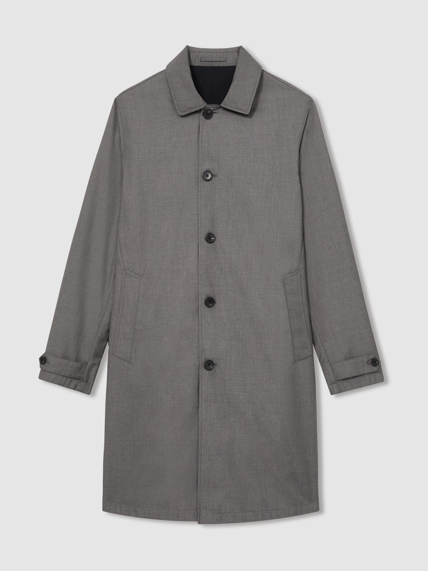 The weather-resistant Vital coat is a classic design reinvented with its modern reversible construction offering both a navy blue and grey colourway. Featuring a point collar, front button fastenings and slip pockets, it’s the perfect addition to your transitional, everyday wardrobe. Weather-resistant fabrication. Reversible. Point collar. Front button closure. Side slip pockets. Two-tone design.