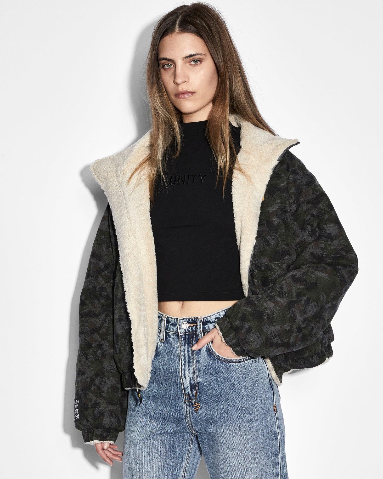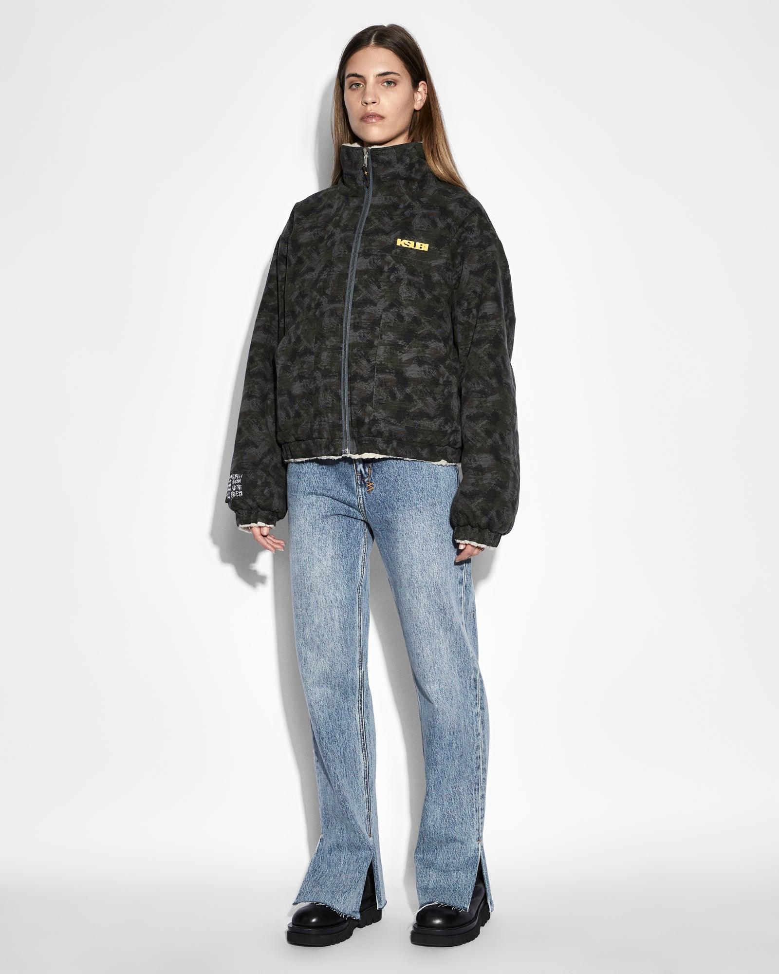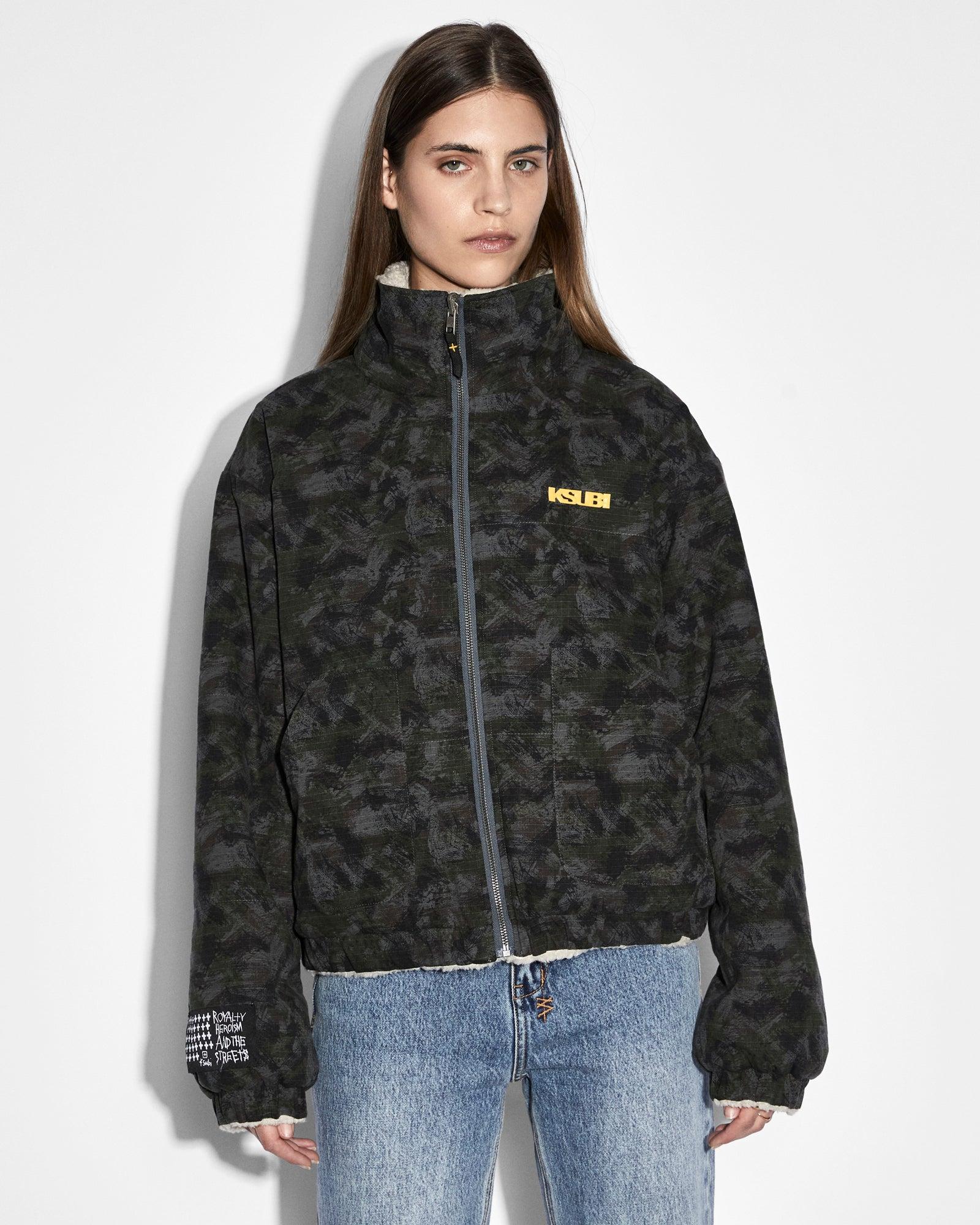 The Reversible Puffer Jacket Camo/Ecru is an oversized, zip through puffer jacket: one side is made from premium ripstop fabric with an exclusive camo print whilst the reverse side is an ecru fleece. This jacket is designed with a lightly padded body and sleeves featuring a Ksubi 'Sign of The Times' silicone logo print on the camo side and an embroidered logo patch on the ecru side. Dry clean only.
