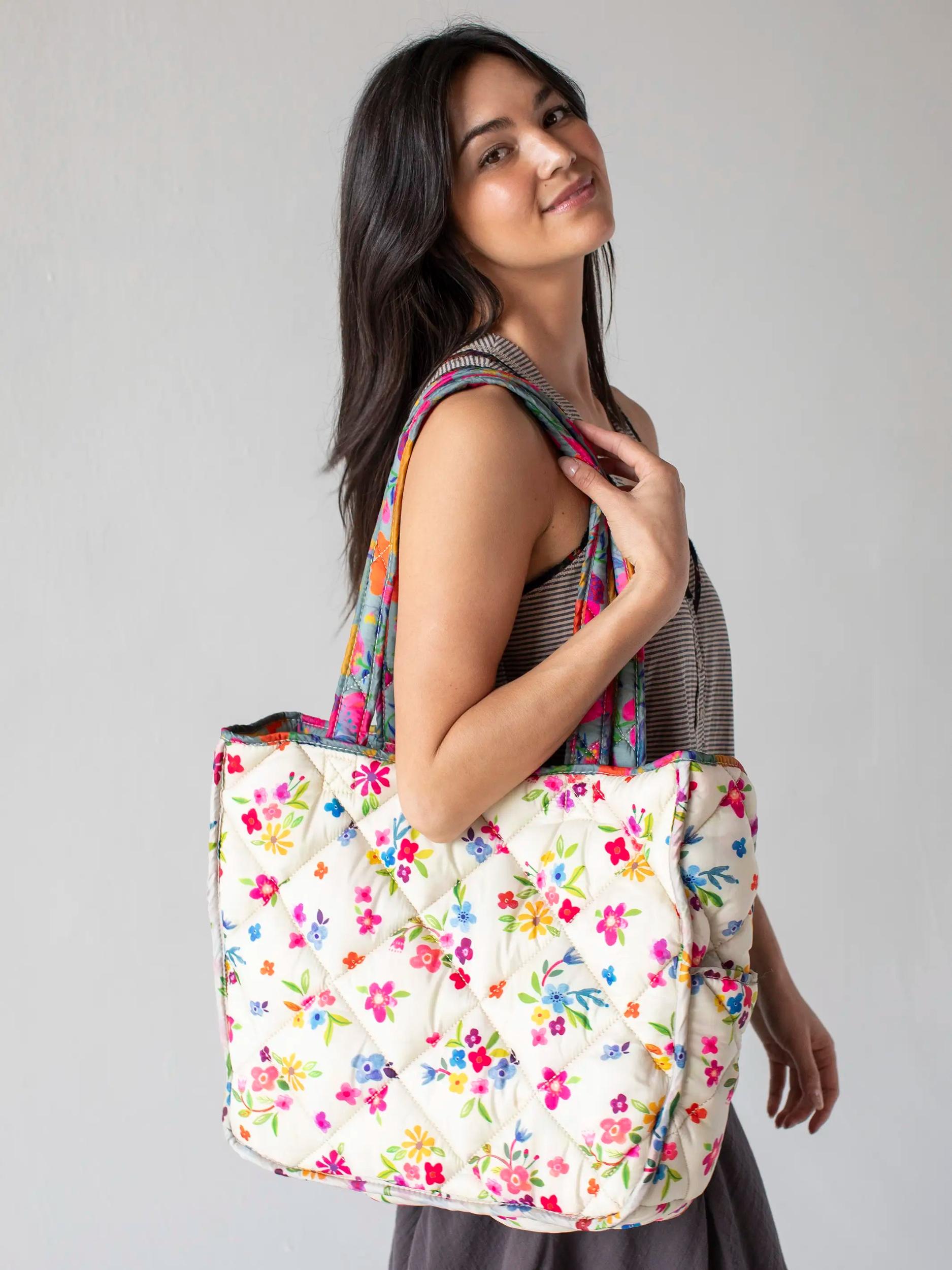 Reversible Puffy Tote Bag - Large Dusty Blue Floral