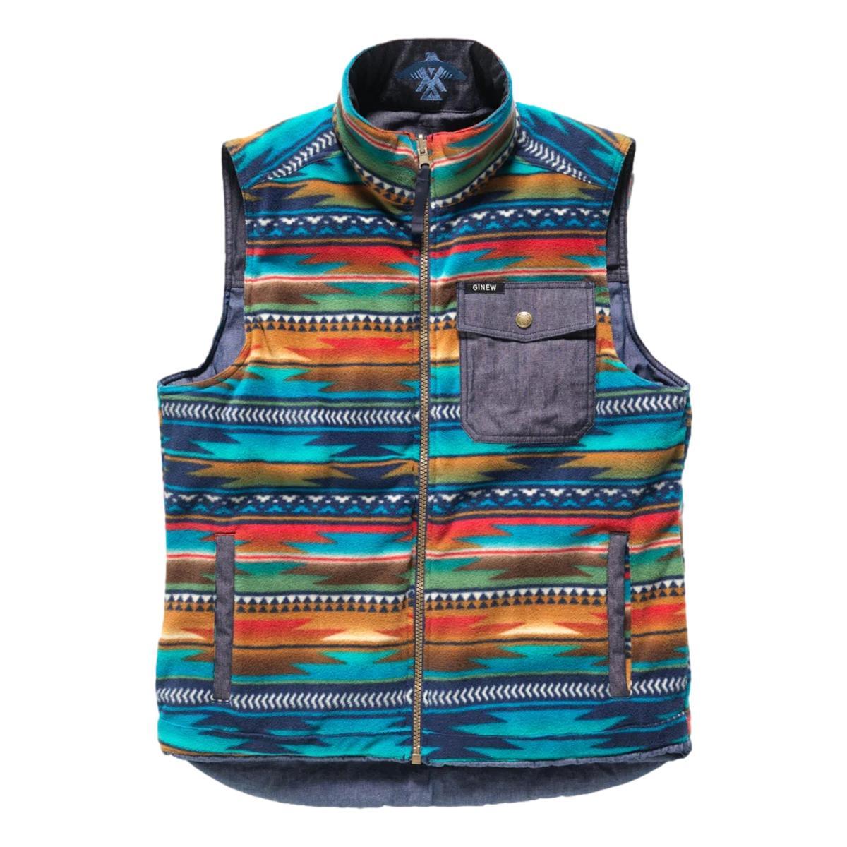 This vest will make you look twice. Two times the wearability: Two looks, two textures. One side is two-tones of denim and the alternate is a printed, insulating and breathable fleece. Both sides full zip and each has three pockets. The denim side showcases Ginew’s custom embroidered Ojibwe Thunderbird on the back collar. It is the perfect weight for multiple seasons without being bulky. Whether your vibe is denim or you want to rock some color, this vest has you covered. Denim 100% cotton indigo-dyed chambray, 6.5 oz Two tones of denim Denim side fades naturally over time Alternate side is printed, insulating fleece with some stretch for movement Fleece is moisture-wicking, water-resistant and breathable Fleece is 100% polyester Quilted baffled faux down fill Thunderbird embroidery at center back collar Each side has three pockets Full zipper both sides Made in Indonesia Small batch creation
