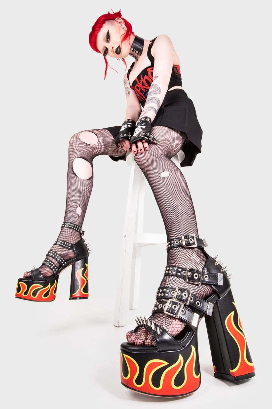 IT'S ALL IN THE DETAILS!Revin' Plaform Sandals in Black faux leather. These vegan Platform Sandals feature a flame print, silves spikes with a Platform sole and high heel, perfect for adding height and glamour to any outfit. Made with eco-friendly materials and 100% cruelty-free, these Sandals are as ethical as they are badass!- Platform Height: 2.5 inch- Heel Height: 5.5 inch - Open Toe- Flame print- Adjustable ankle straps- Silver spikes & studs- High Platform sole- Round toe - 100% vegan SKU: LMS 195 - BlackPU/Flame