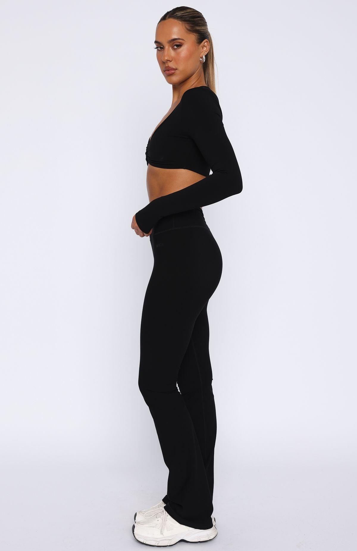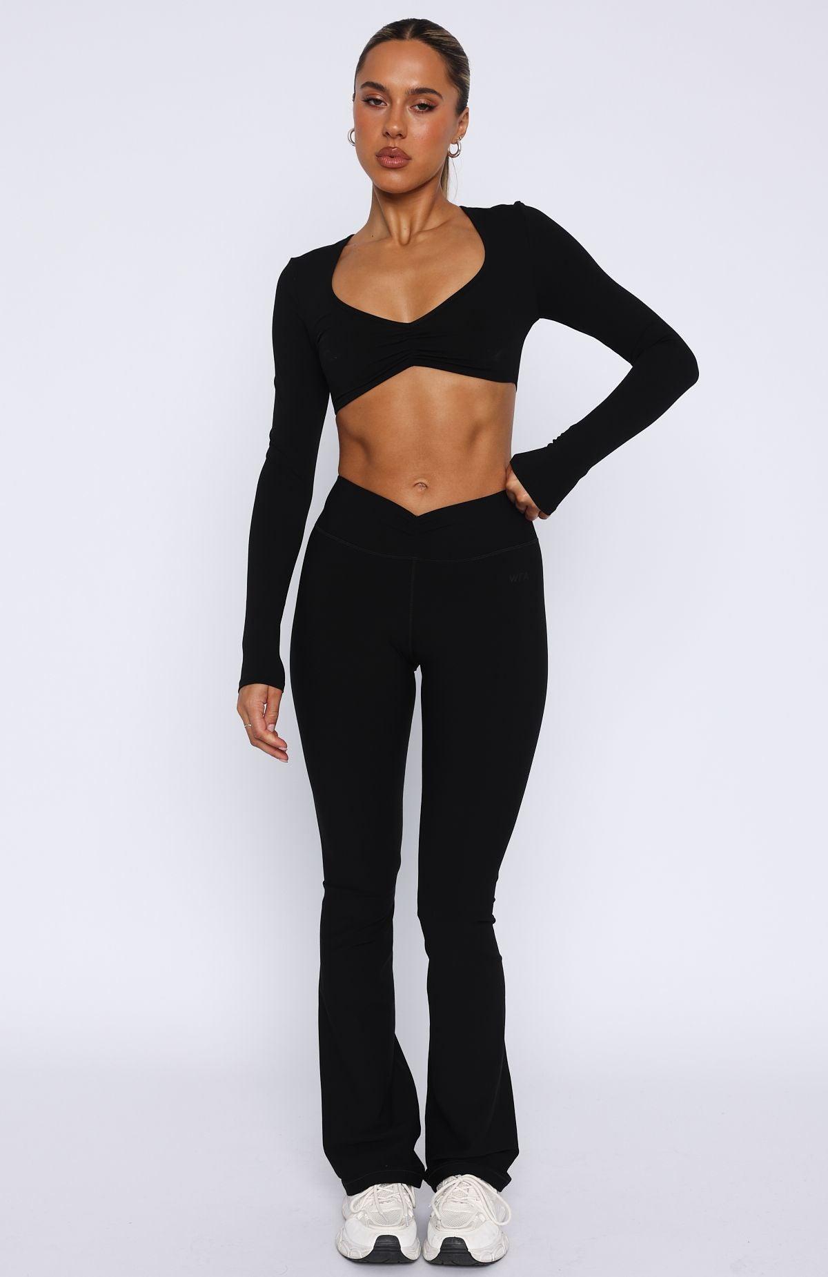WHITE FOX ACTIVE Maximise on comfort without sacrificing cuteness! The Revival High Waisted Flare Leggings Black feature a thick, high-waisted waistband with centre ruched detailing, full length, flared leg design, soft, buttery stretch material that moves with your body and front side logo detailing. 71% POLYESTER 29% ELASTANE Mik is 171cm & wears an XS