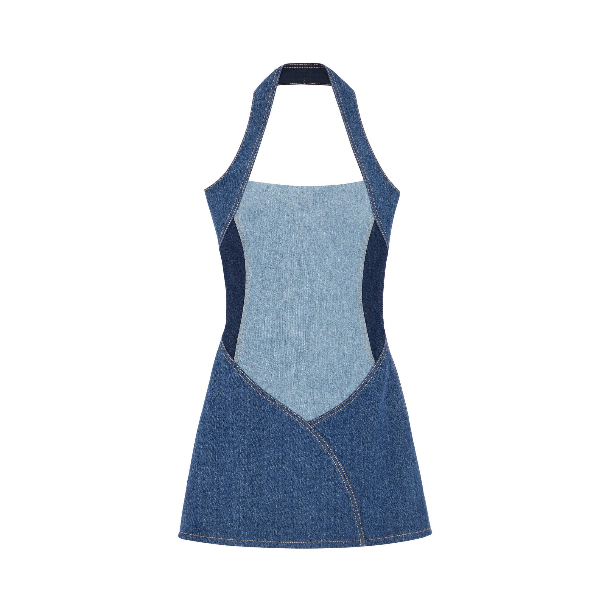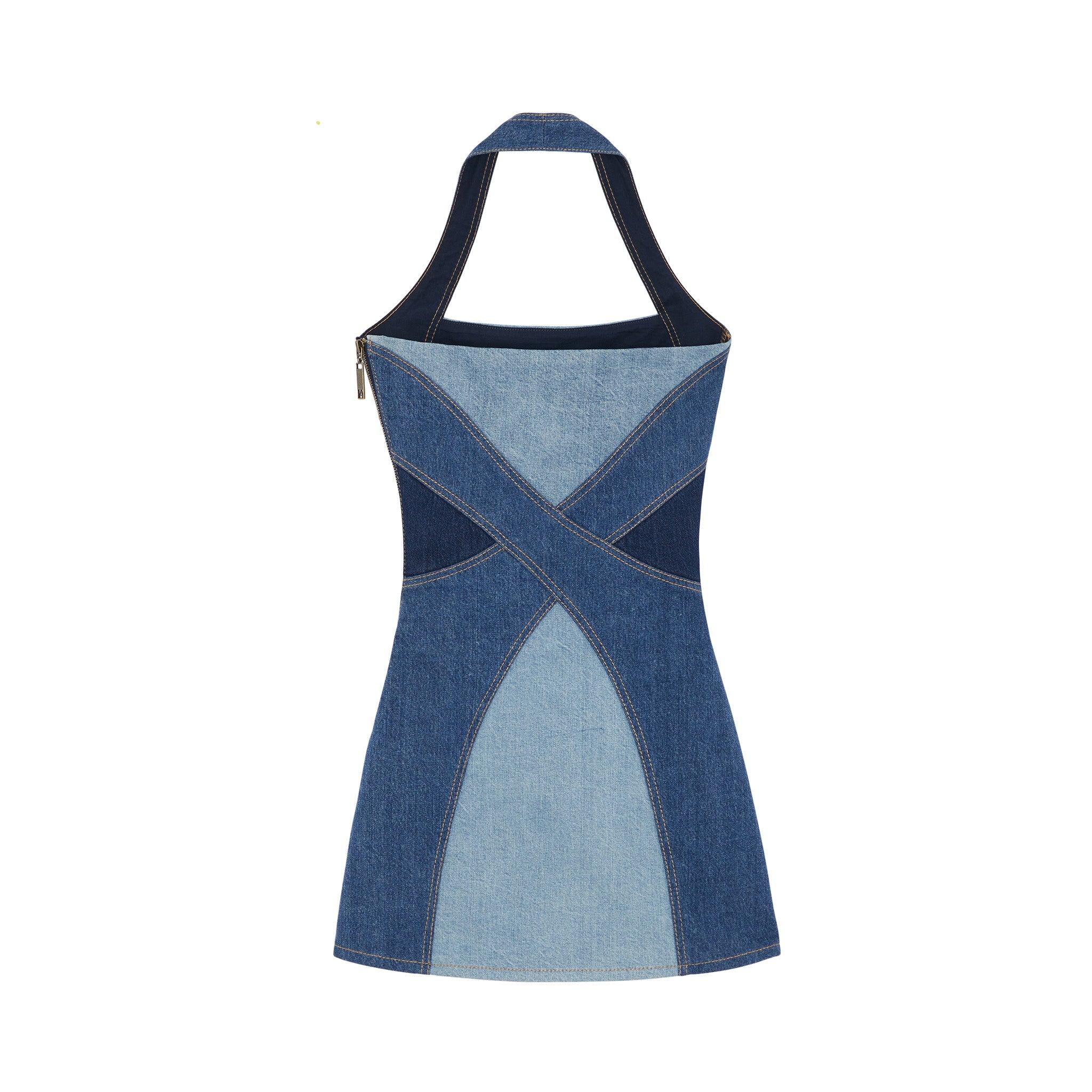 Description: The Rework Denim fitted mini dress presents a reimagined denim silhouette made from vintage denim and features a halter neck and crossover front panels. Sizing: Click here for size guide. For further sizing assistance please contact us on