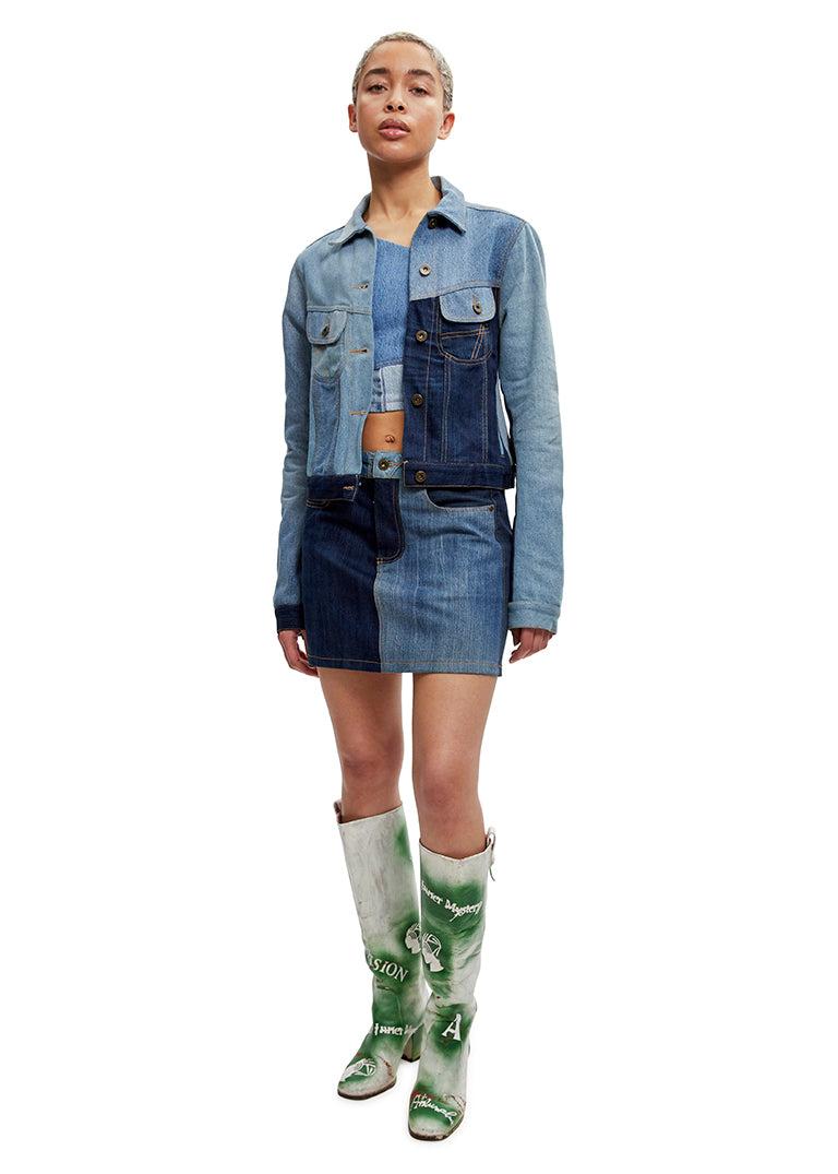 Description: The Rework denim skirt sits comfortably on the waist of the wearer and has been constructed using repurposed vintage denim garments in three different shades. The signature ‘A’ stitch can be found on the back pockets with antique brass Ahluwalia hardware throughout. Sizing: Click here for size guide. For further sizing assistance please contact us on