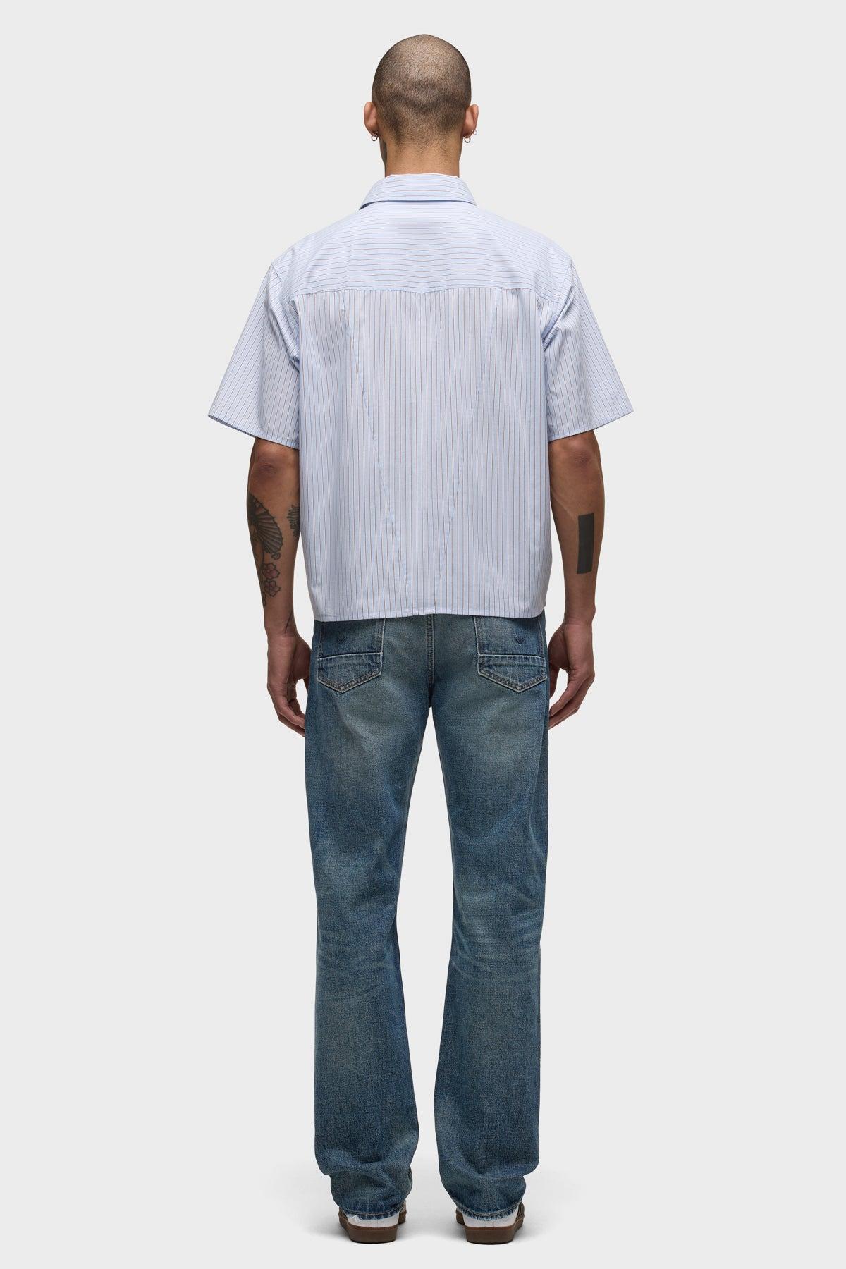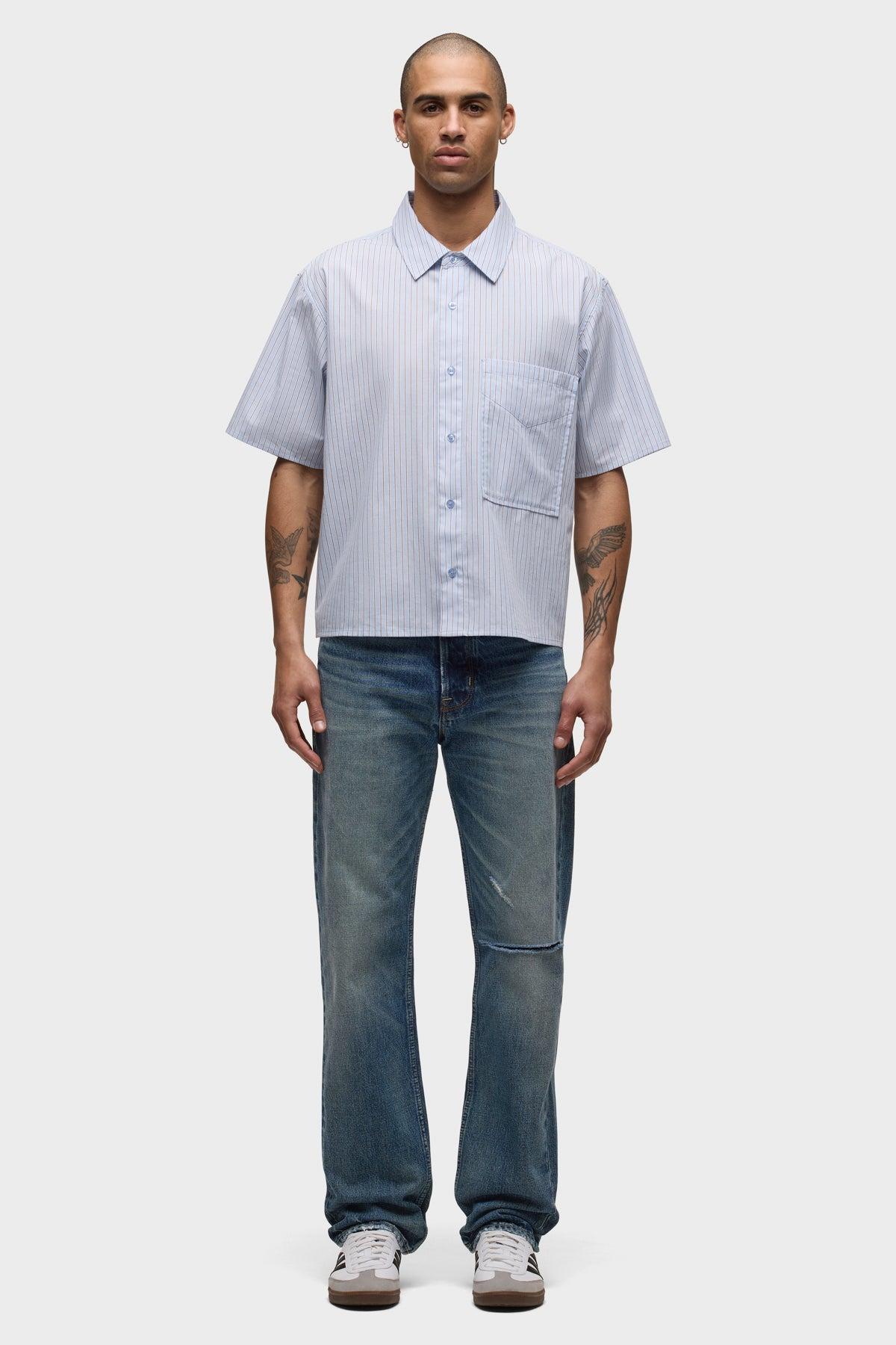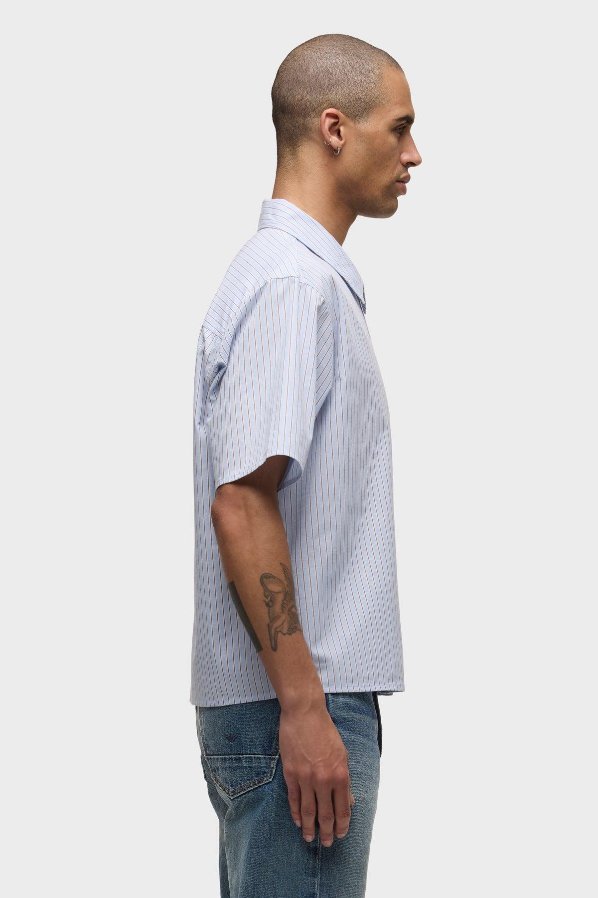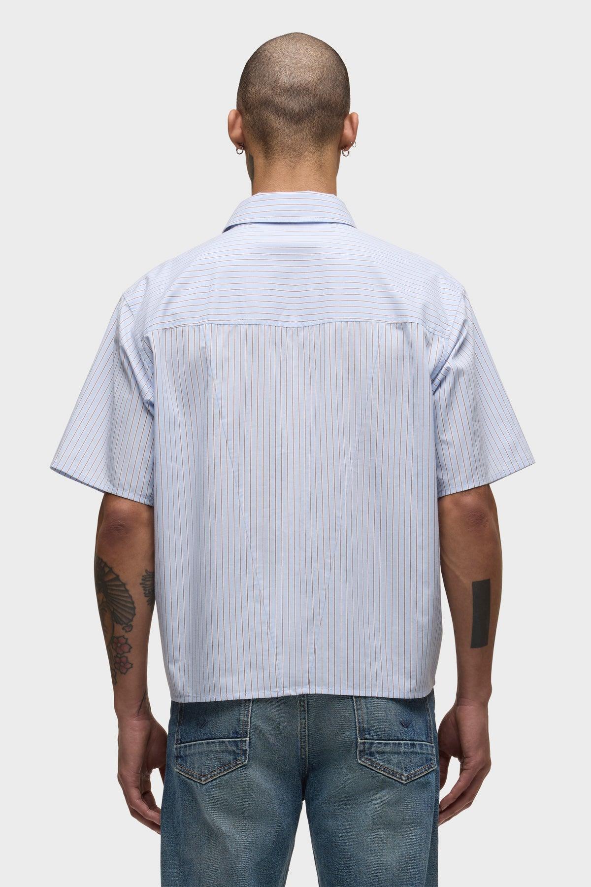 Description Our Rex Short Sleeve Shirt in Blue Stripe is cut from blue striped poplin. It features a pointed collar and stitched hem. Product Details Body Length: 27.5", Chest: 48", Sleeve Length: 10.75"Model Height 6’1"Model wearing size M/32Measurements based on size M/32 Fabric & Care Content: 100% Cotton Poplin Machine wash cold gentle cycle inside out Wash with like colors Only non-chlorine bleach when needed Tumble dry low Medium iron inside out if needed