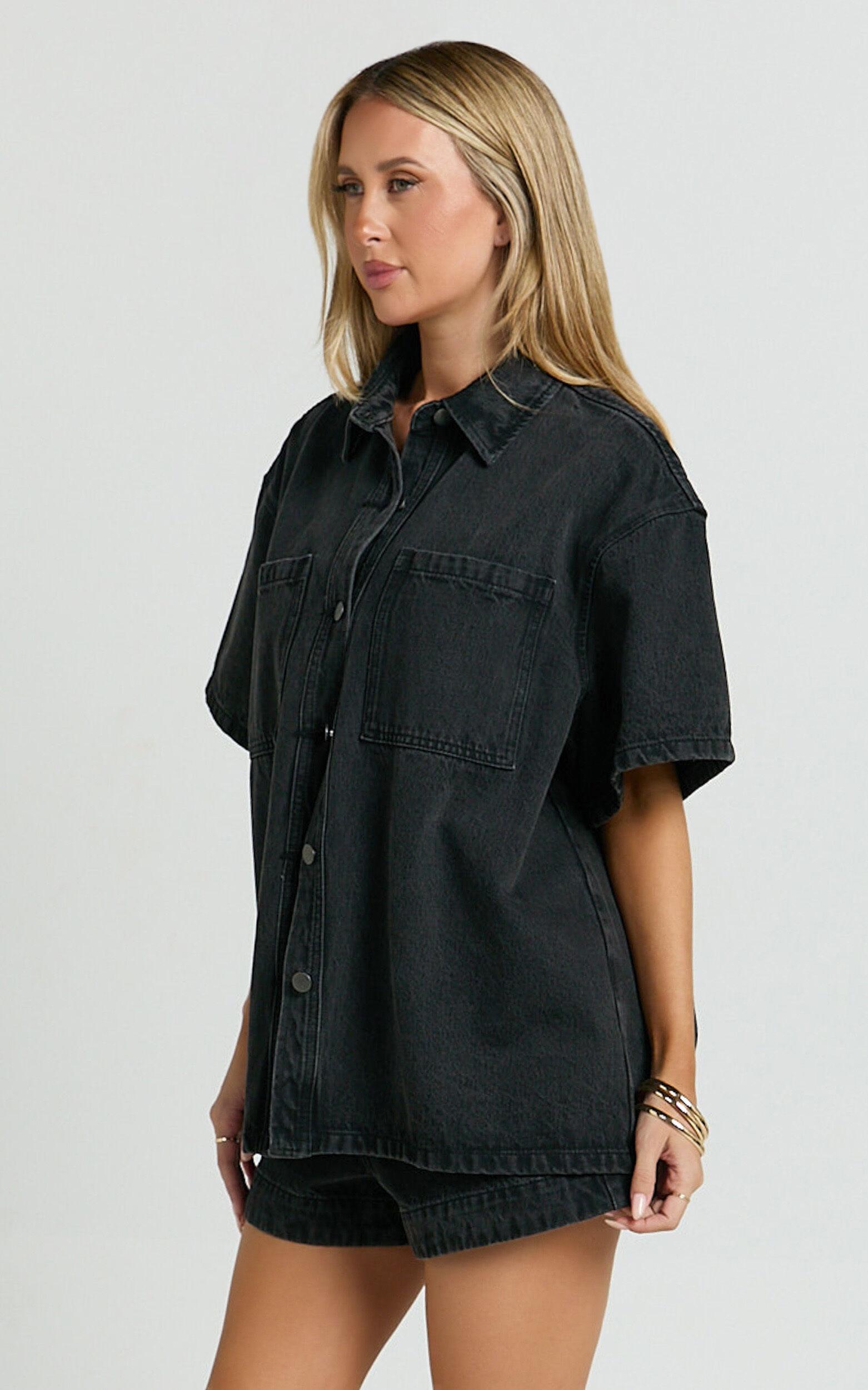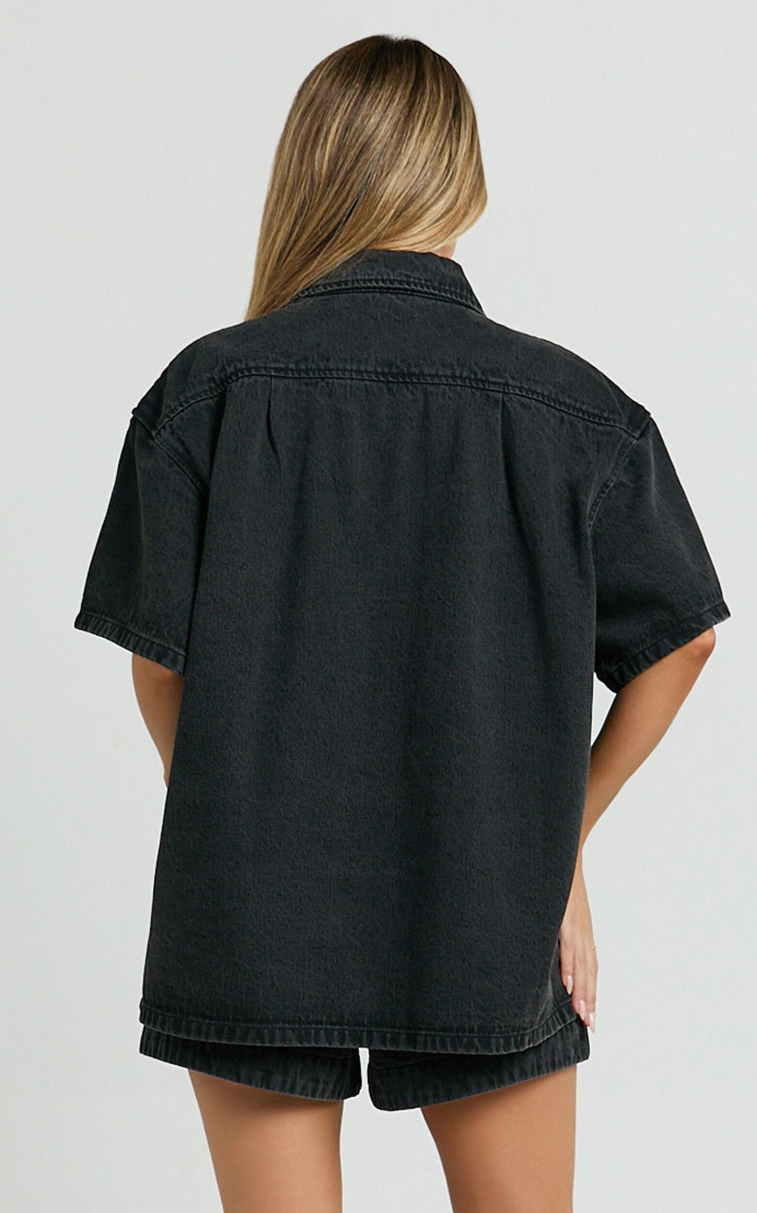 Rhianna Top - Oversized Recycled Denim Hardware Detail Short Sleeve Shirt in Washed Black