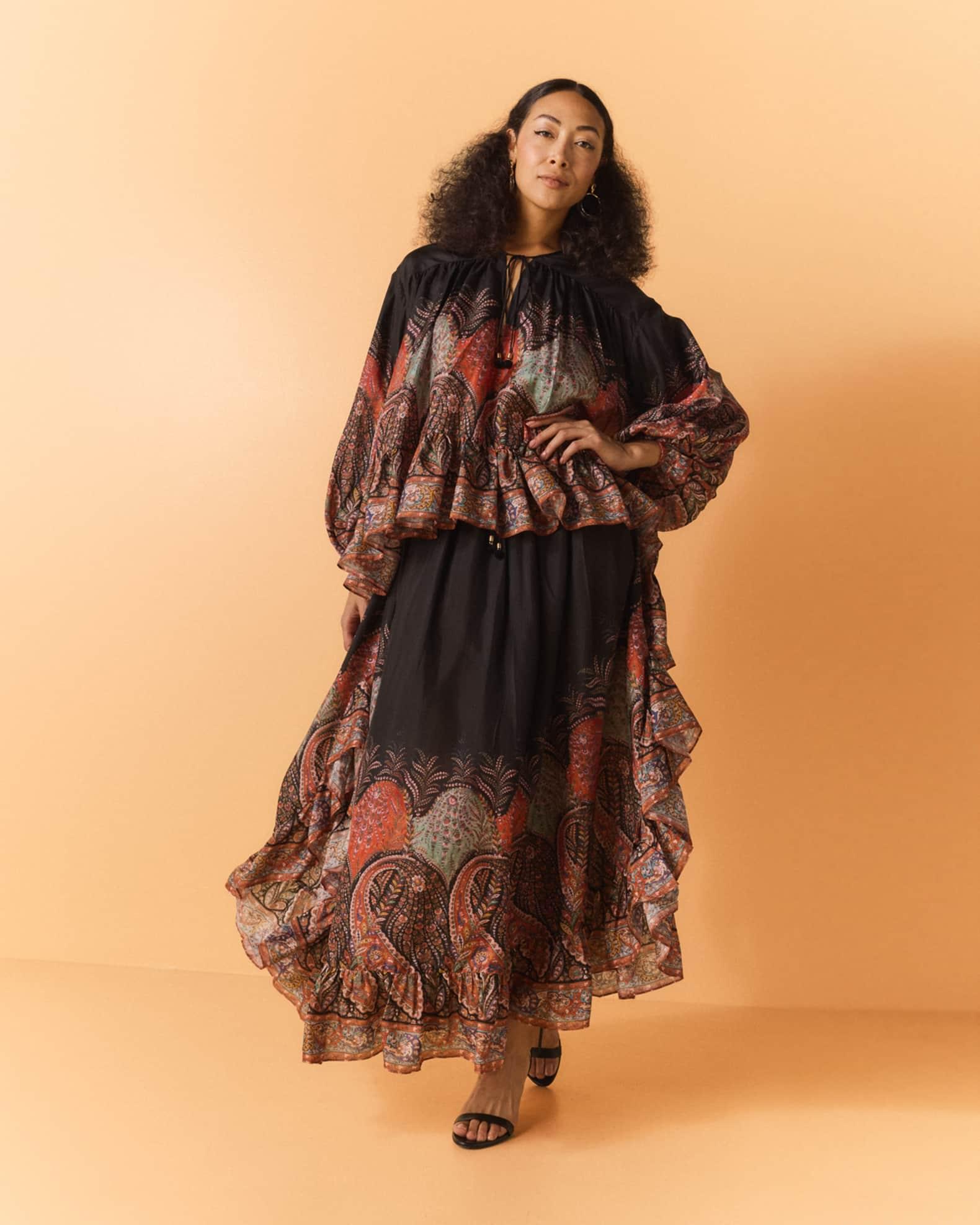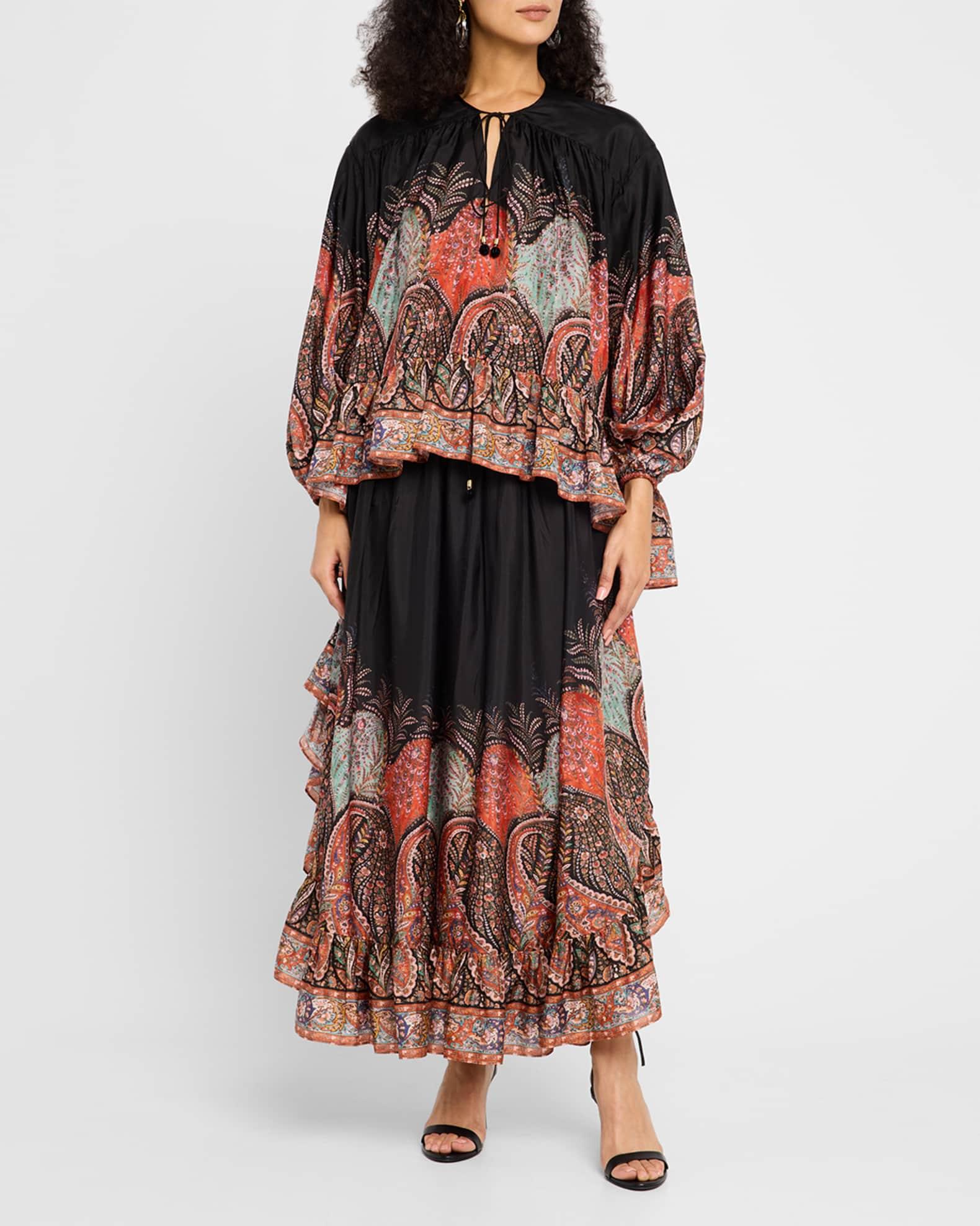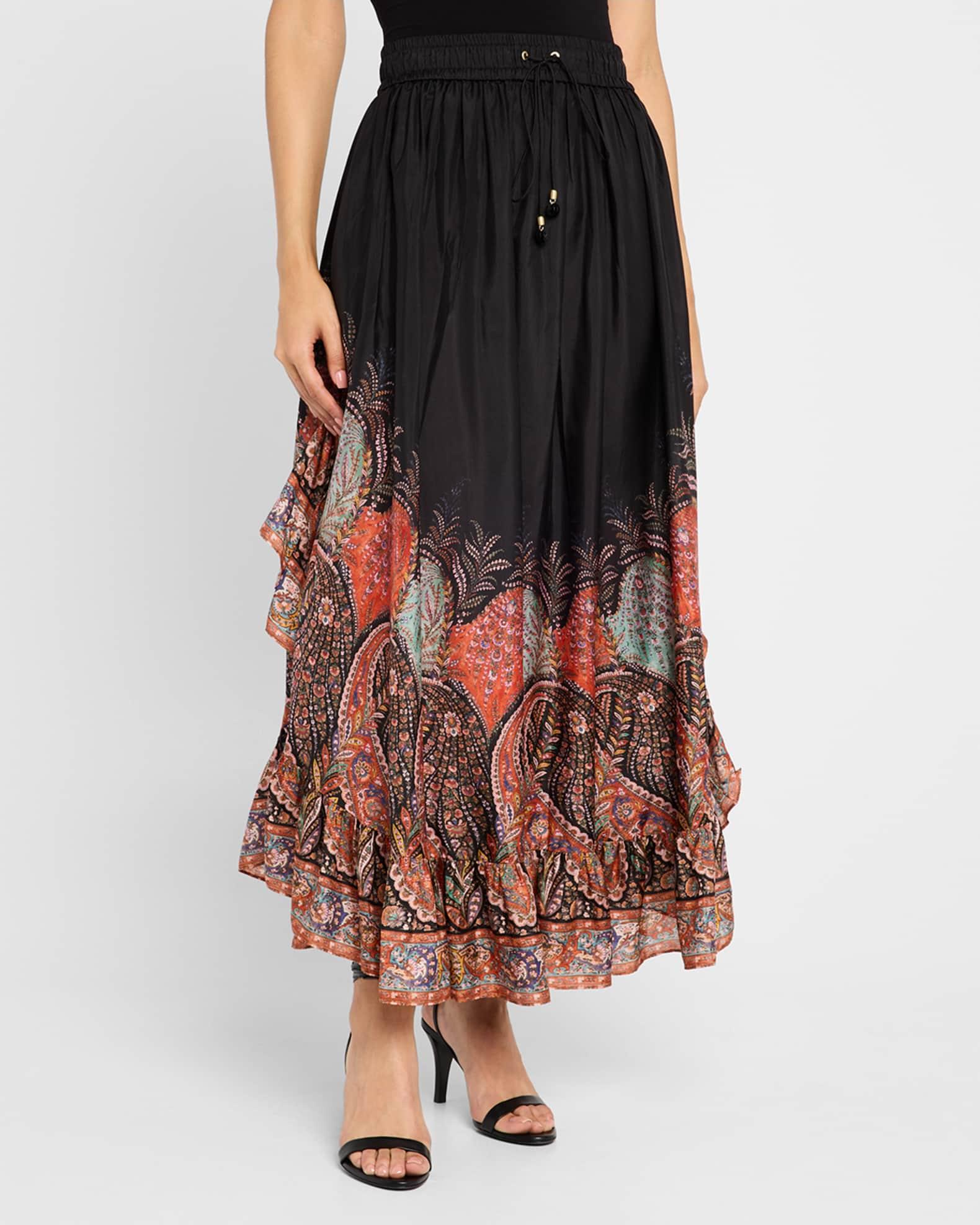 Zimmermann "Rhiannon" silk maxi skirt boasts a bold print Mid-rise; sits high on the hip Elastic drawstring waistband Side seam pockets A-line silhouette Tiered hem Pull-on style Silk Unlined Dry clean Imported Size conversion: 0 = X-Small, 1 = Small, 2 = Medium, 3 = Large