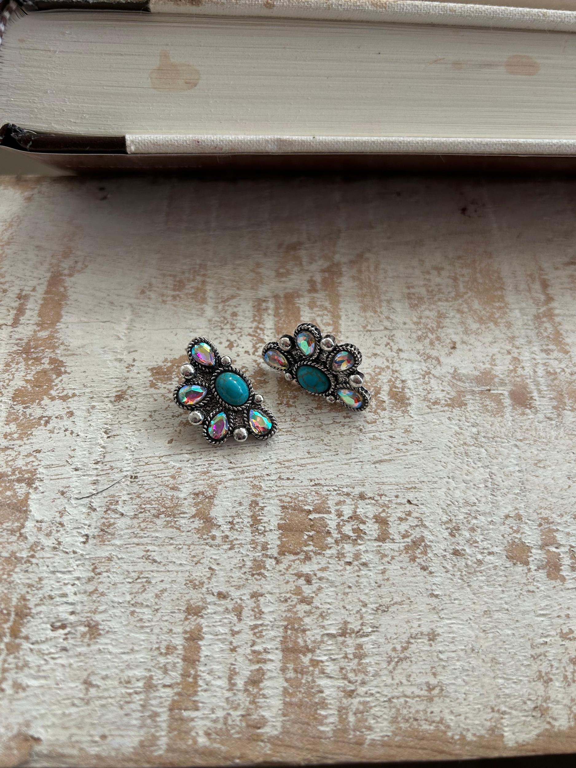 Rhinestone and Turquoise Half Cluster Earrings | Gussied Up Online Boutique Add a touch of western-inspired elegance to any outfit with our Rhinestone and Turquoise Half Cluster Earrings. Featuring stunning turquoise and sparkling rhinestone details, these stud earrings are sure to make a statement. Perfect for adding a pop of color and texture to your look.