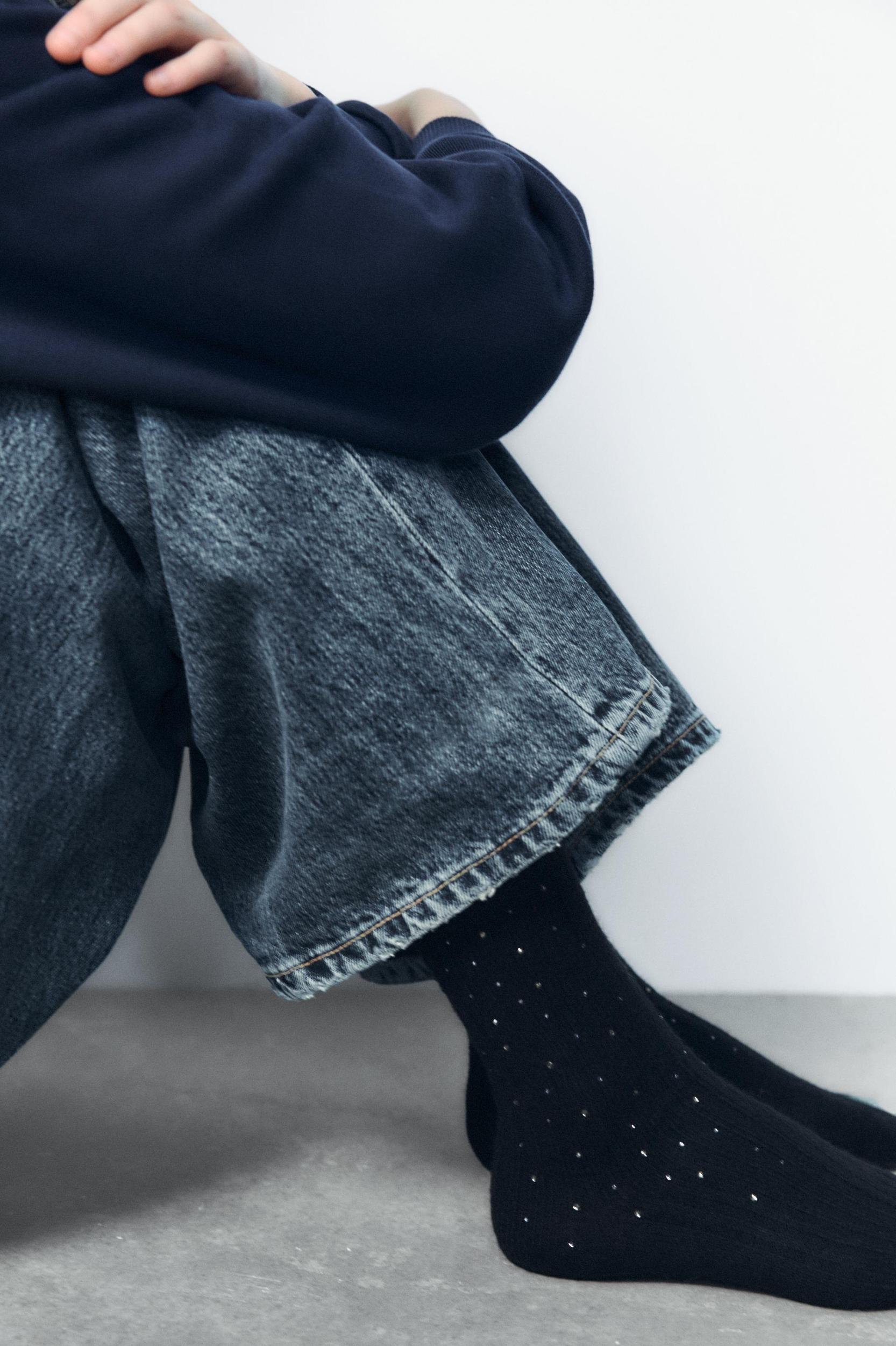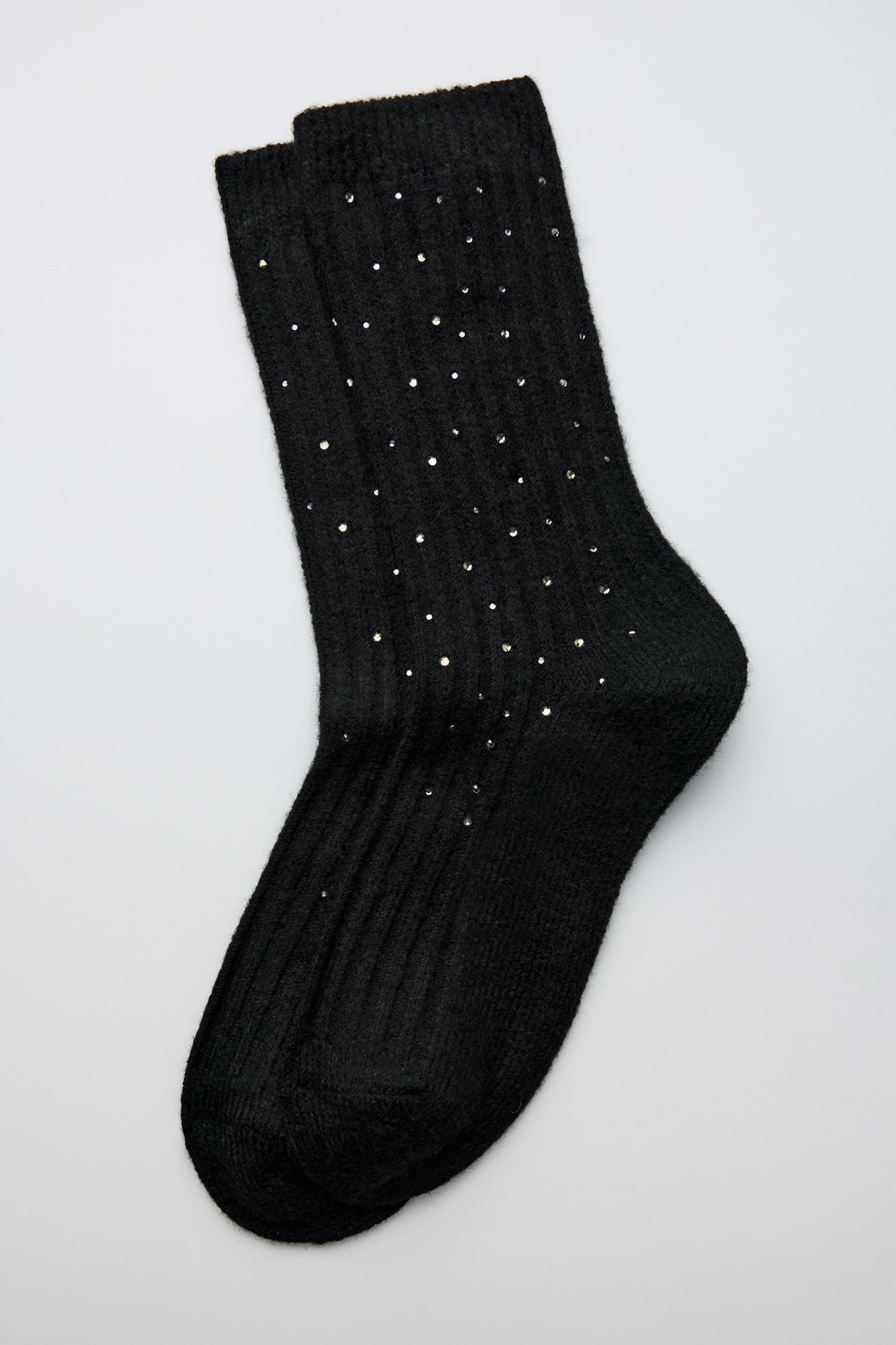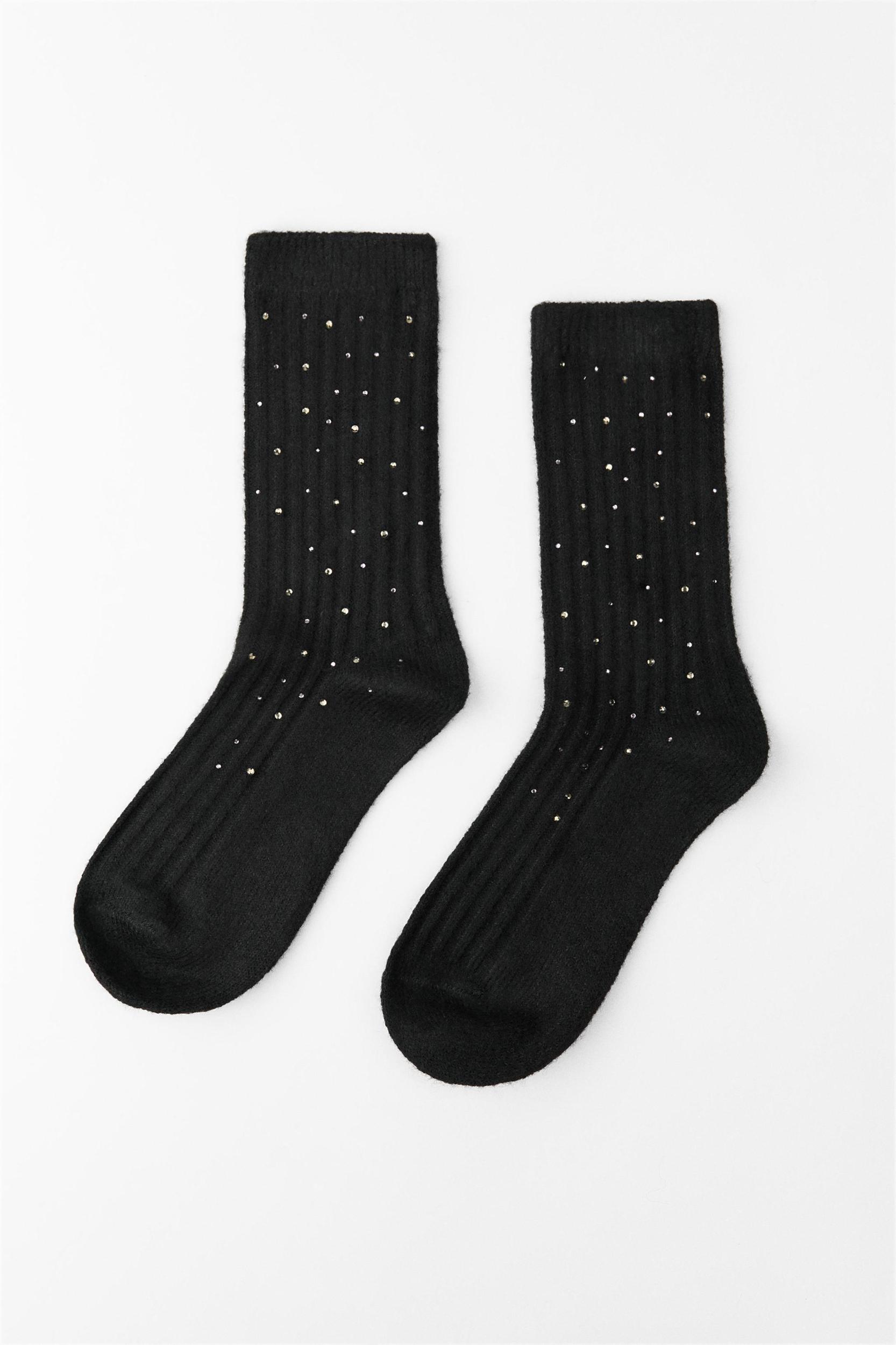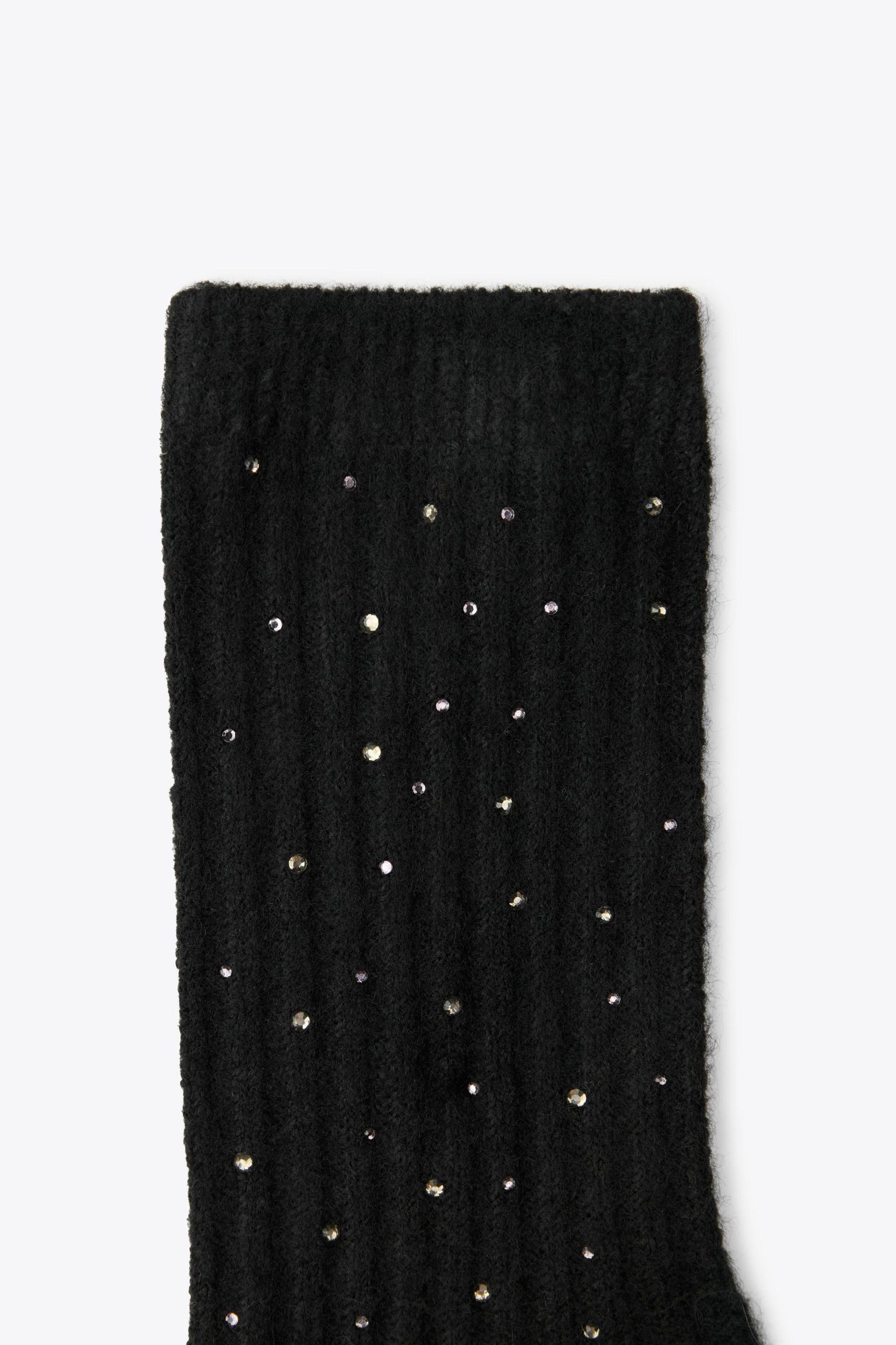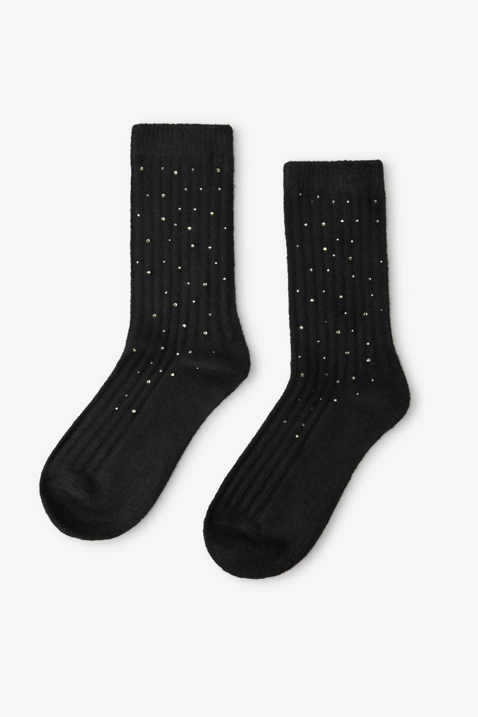 Long socks made of a blend of fabrics with 9% wool. Ribbed trim and rhinestone appliqué.