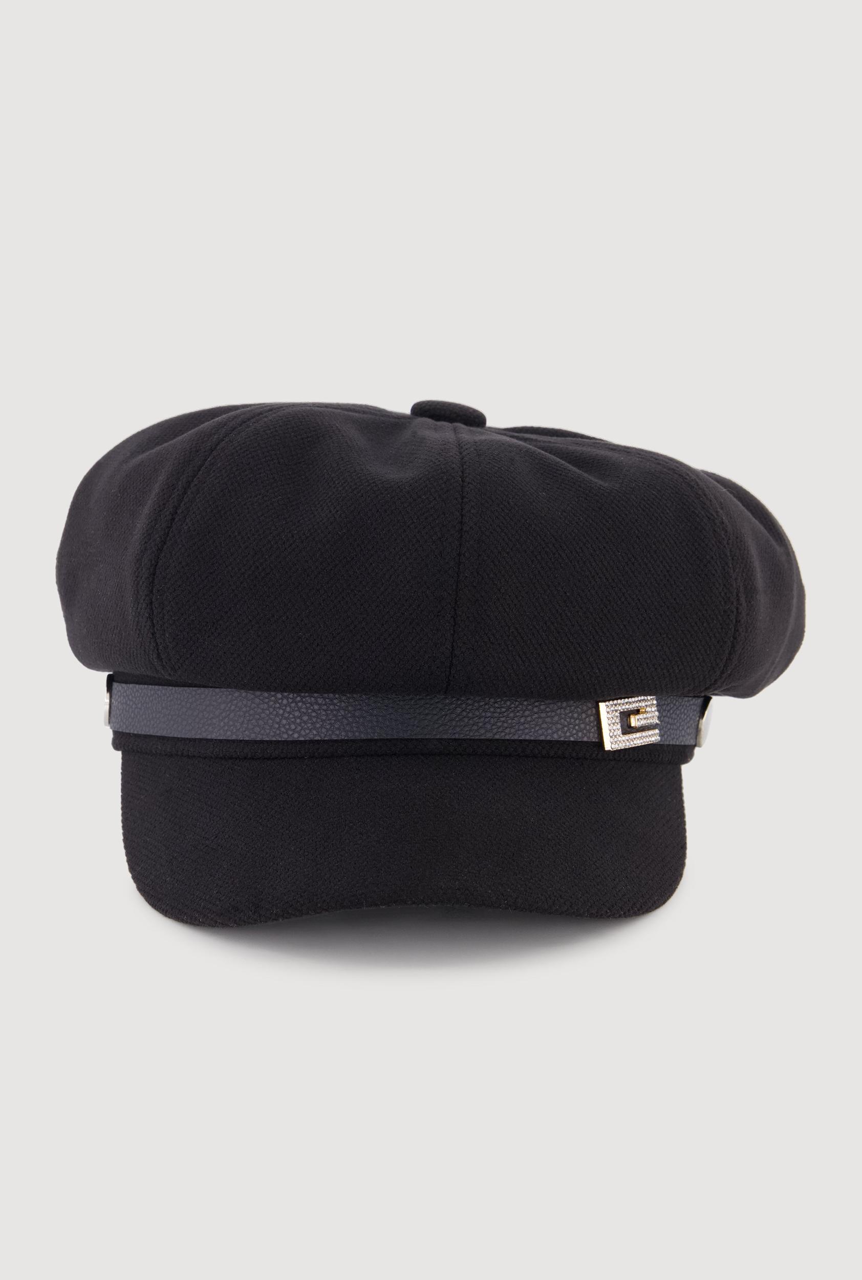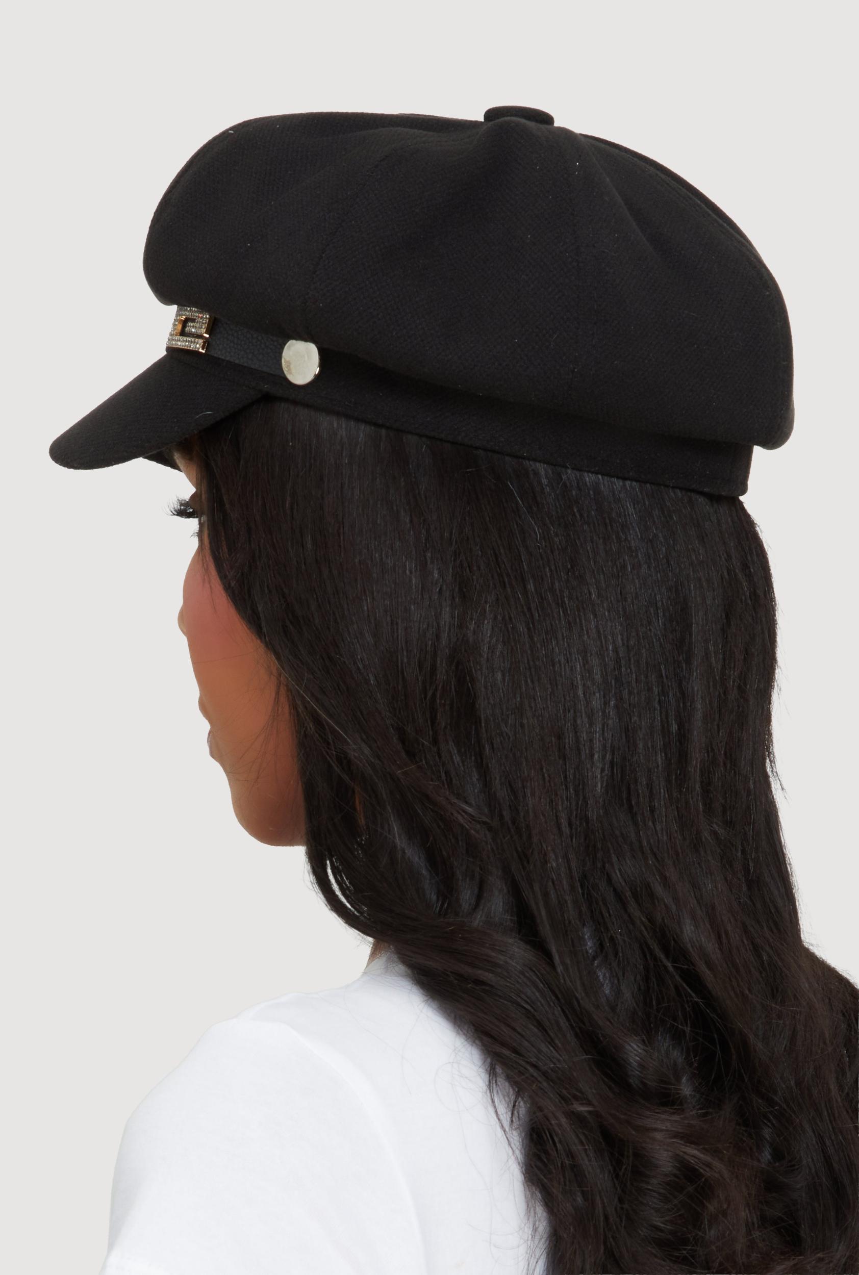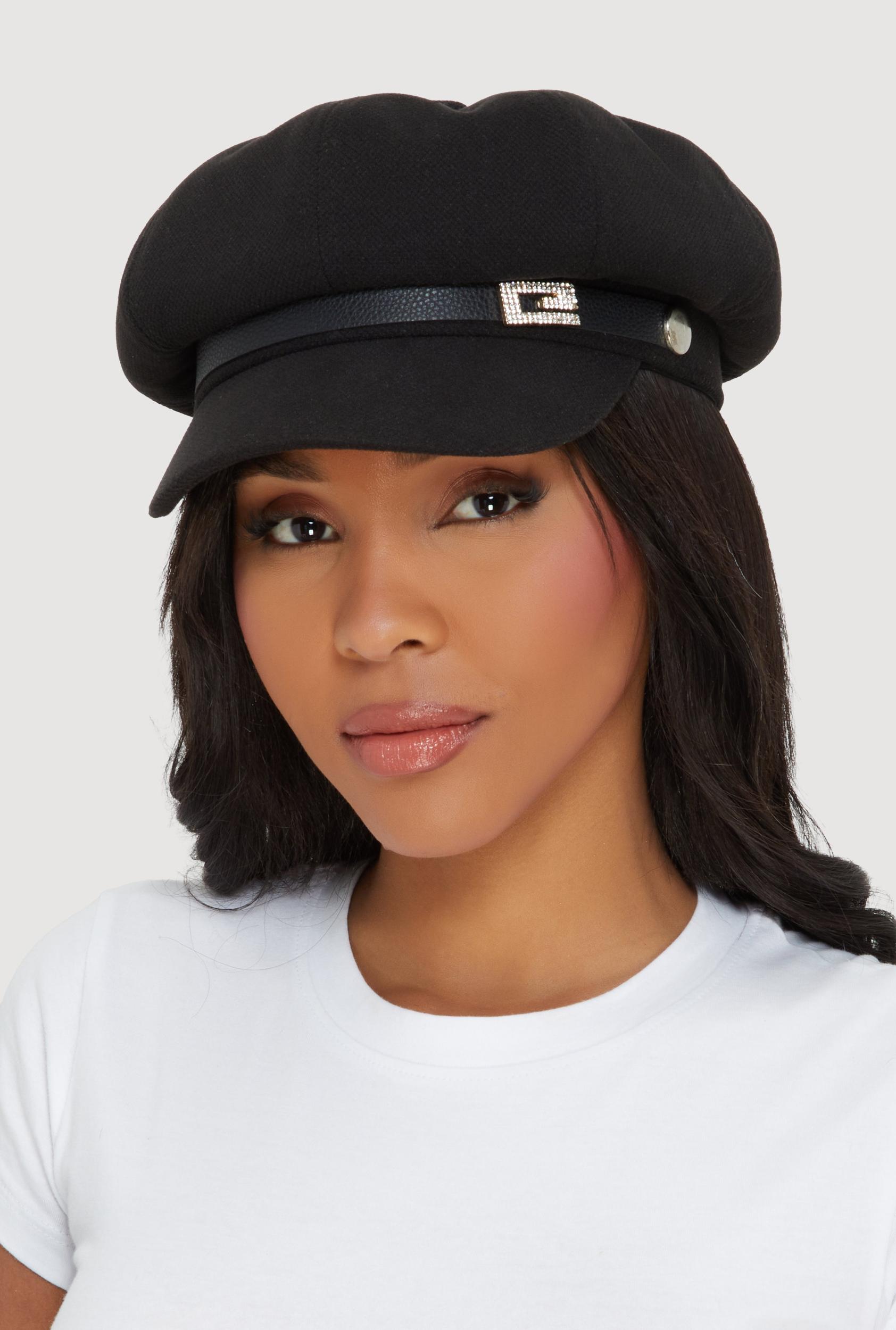 This stylish cabbie hat features a classic structured silhouette with a sleek faux leather trim that adds subtle edge. A sparkling rhinestone pendant detail elevates the look, making it a versatile accessory for casual outfits. Its 24 inch circumference ensures a comfortable fit for everyday wear. Faux leather trim for a modern twist on a timeless shape Rhinestone pendant adds a touch of sparkle without overdoing it Structured fit holds shape while staying easy to wear MeasurementsCircumference: 24 inContent and Care Material: 65% Polyester, 35% Cotton Country Of Origin: China Rainbow Item Number 1129074396472 BLACK - 1129074396472001