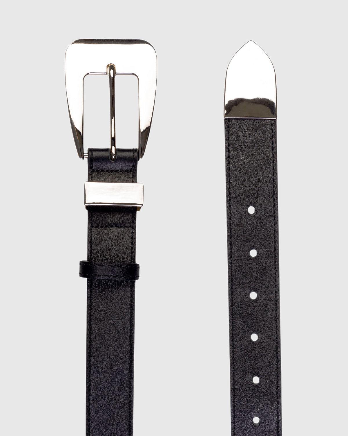 Silver plated brass elongated shaped buckle. Secured on a smooth buffed leather strap.