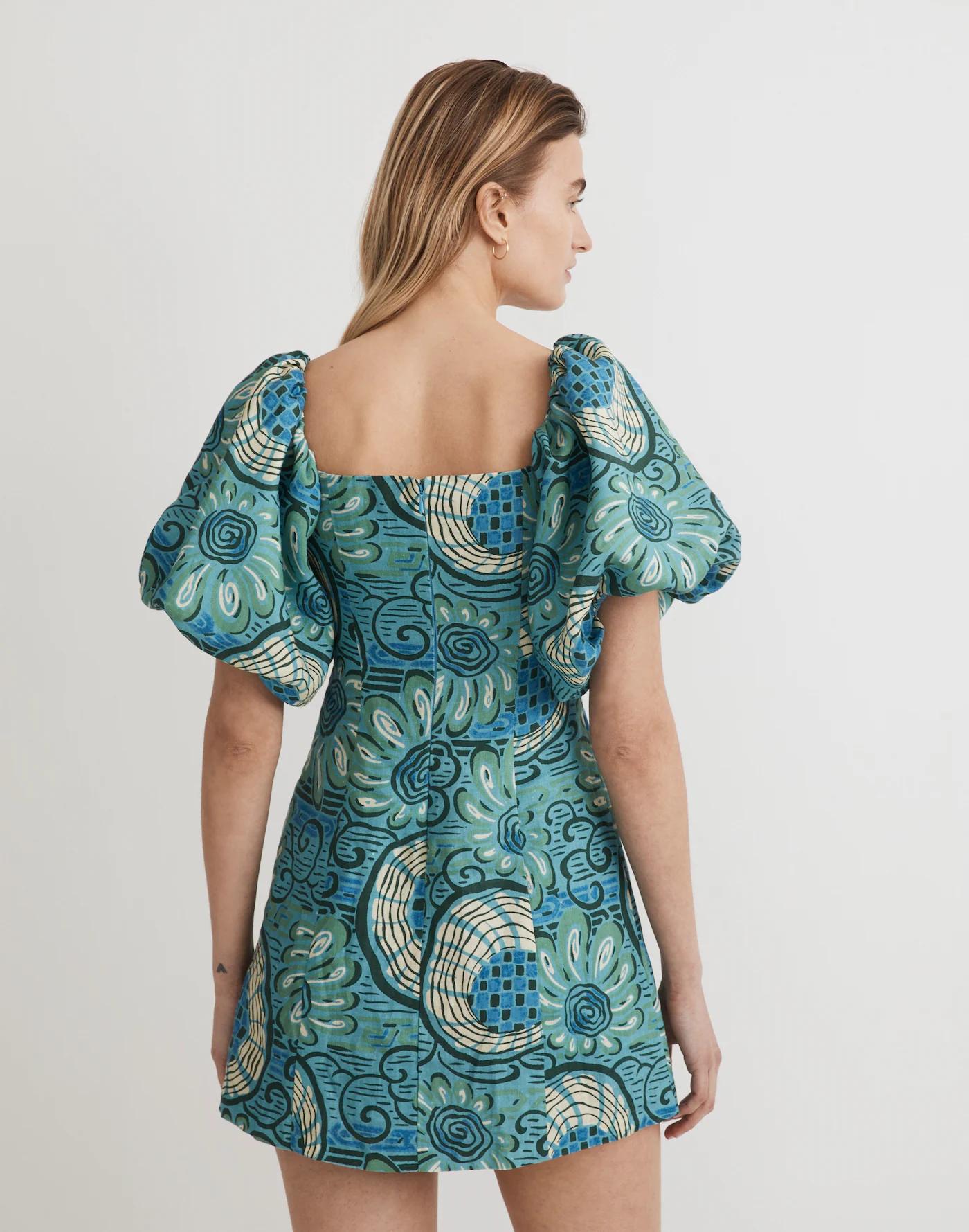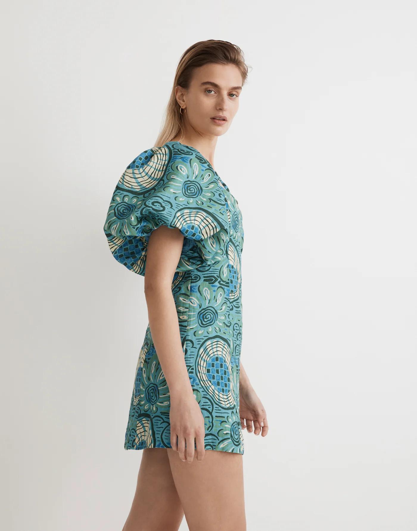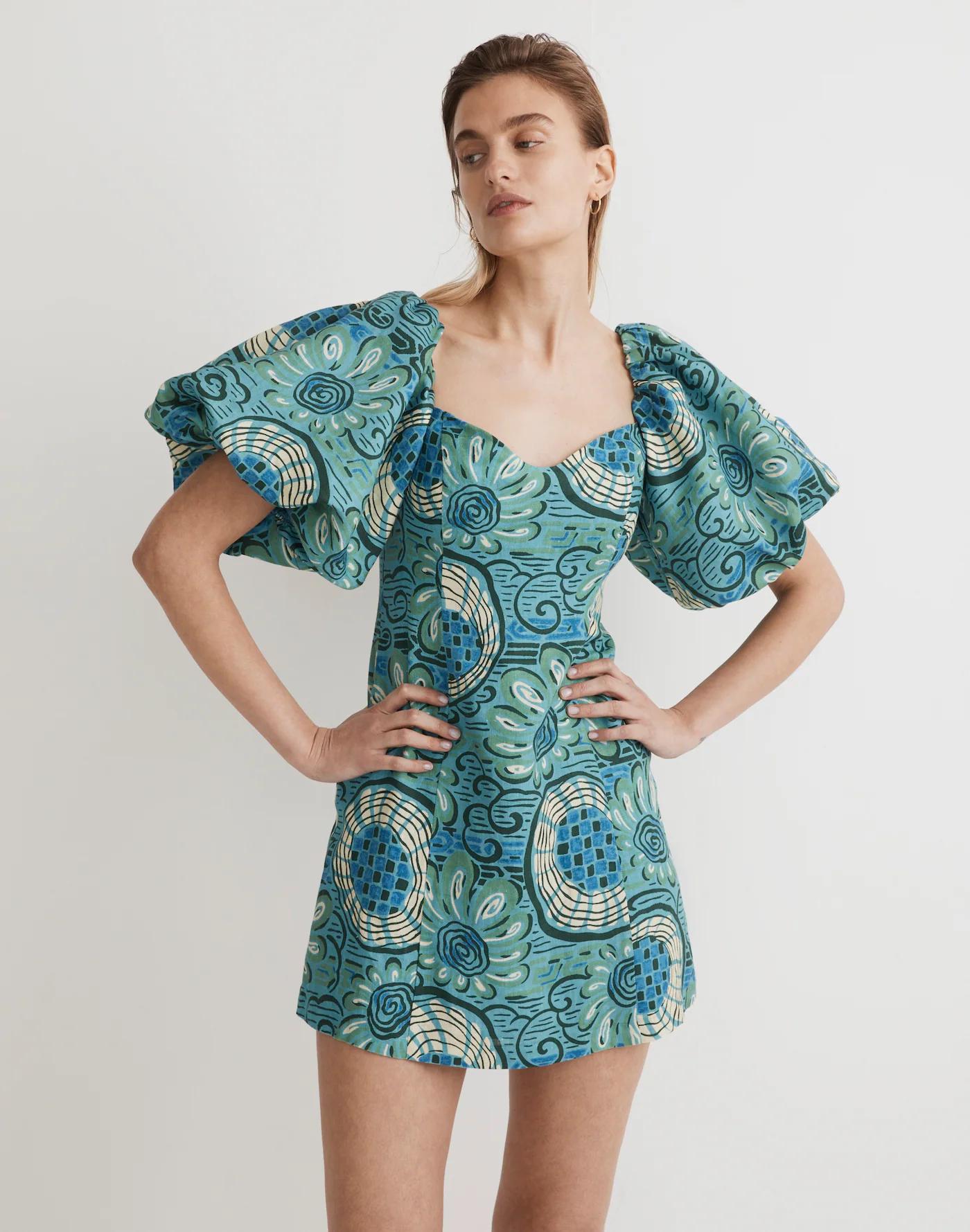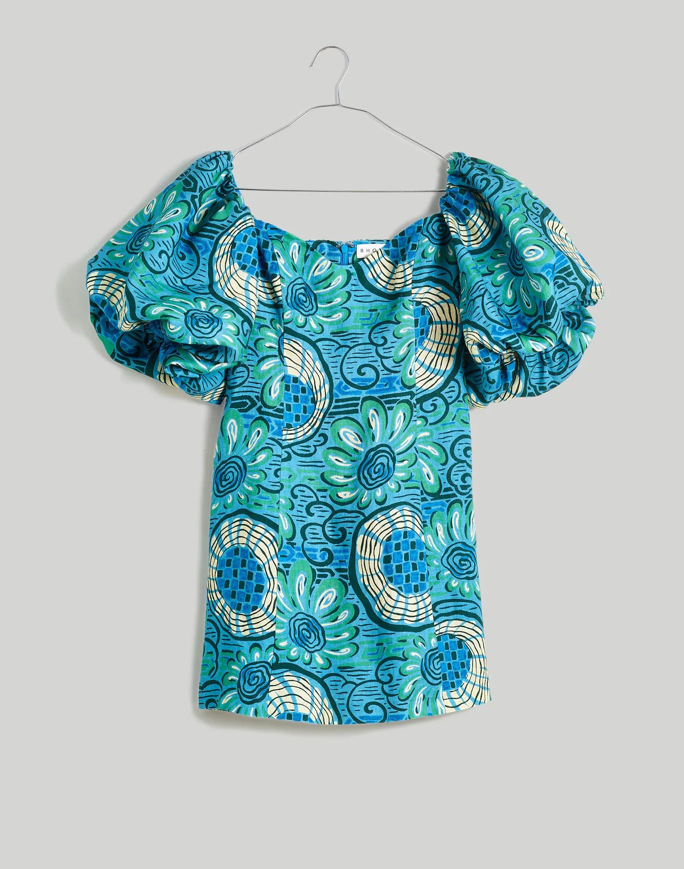 Taking inspiration from handmade vintage prints and the concept of feminine joy, Phoebe Vickers and Purna Khatau infuse something special and soulful in every Rhode design. An off-the-shoulder mini dress with dramatic balloon sleeves, this bold number is sure to make a statement.
