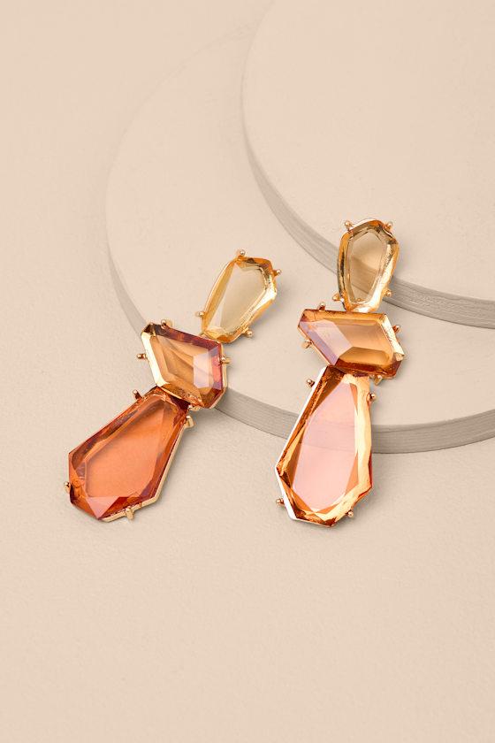 With a striking presence and an elegant drop silhouette, these Boho-chic earrings always draw in compliments. Light-catching, tan-hued rhinestones in organic shapes fall from small to large, all housed in gold-toned settings.