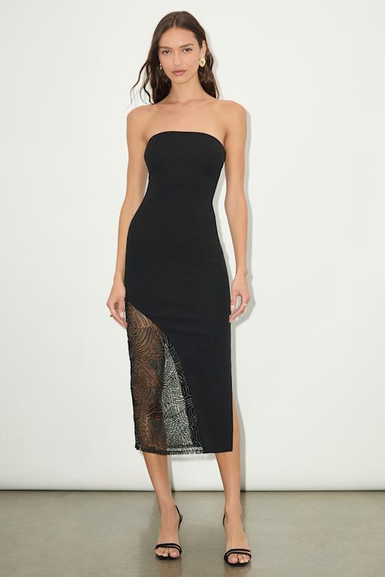 A head-turning mystique comes naturally when you slip on this figure-flattering crepe knit dress, designed to draw in countless new admirers. The strapless, darted bodice continues into a bodycon midi skirt, elevated by a sheer panel at the side featuring abstract embroidery. Flirty side slit at the hem allows for effortless strutting. Hidden no-slip strips and hidden back zipper/clasp.
