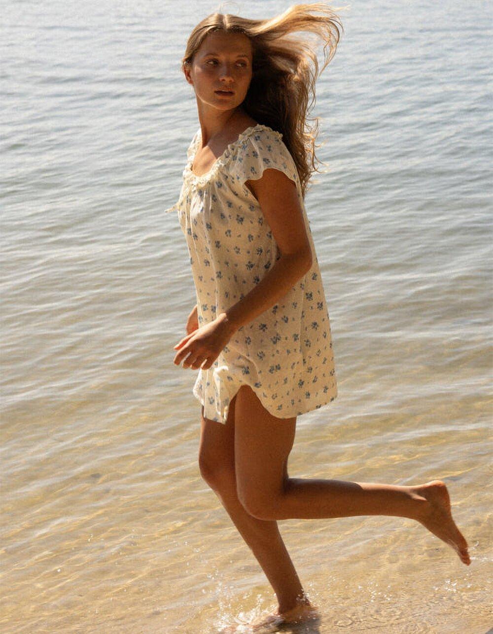 Rhythm Dahlia Frill Mini Dress. The Dahlia Frill Dress in Sky is a floral mini crafted from lightweight textured fabric. With ruffled neckline and flowing hems, it’s a playful dress for warm coastal afternoons. Lightweight, slightly textured ditsy floral fabric. Flowy hem and arm detail. Ruffled neckline. Mini dress style. 70% Cotton 30% Rayon. Machine wash. Imported.