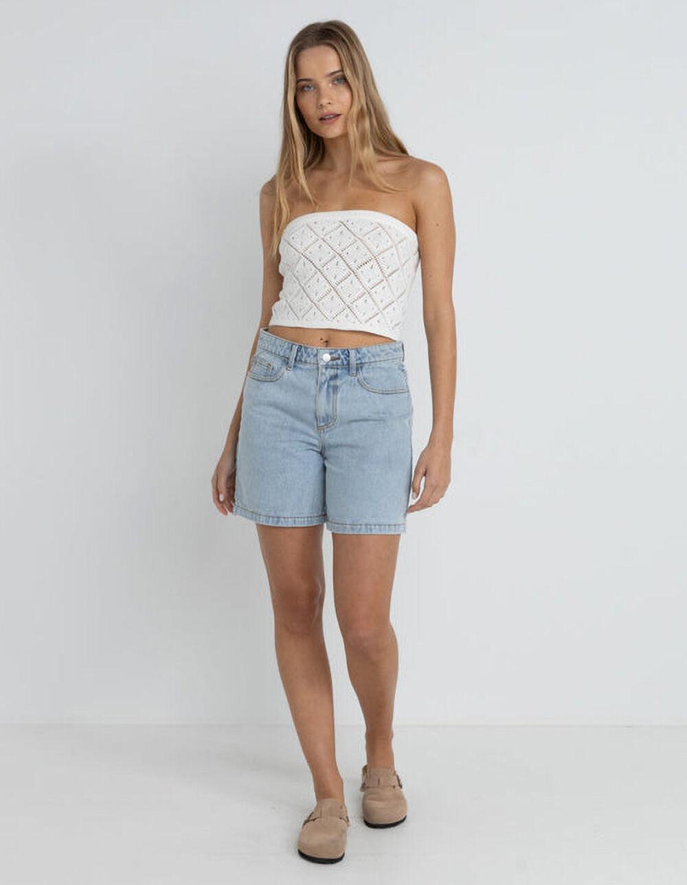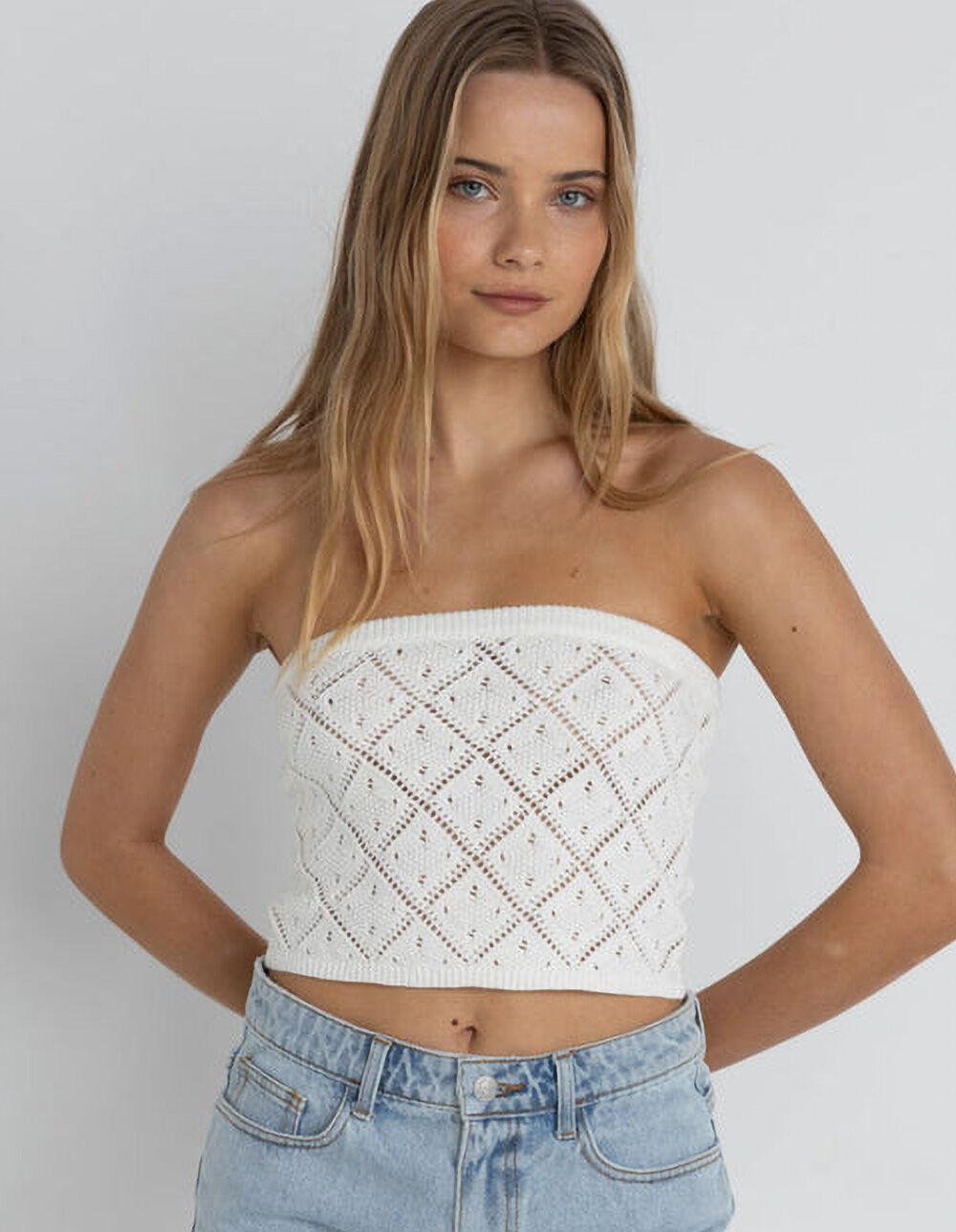 Rhythm Islander Tube Top. The Islander Strapless Knit Top in White blends elevated style with functional wearability, crafted from cotton. A versatile essential designed for everything from beach days to off-duty afternoons. Fitted. Cropped length. 100% Cotton. Machine wash. Imported.