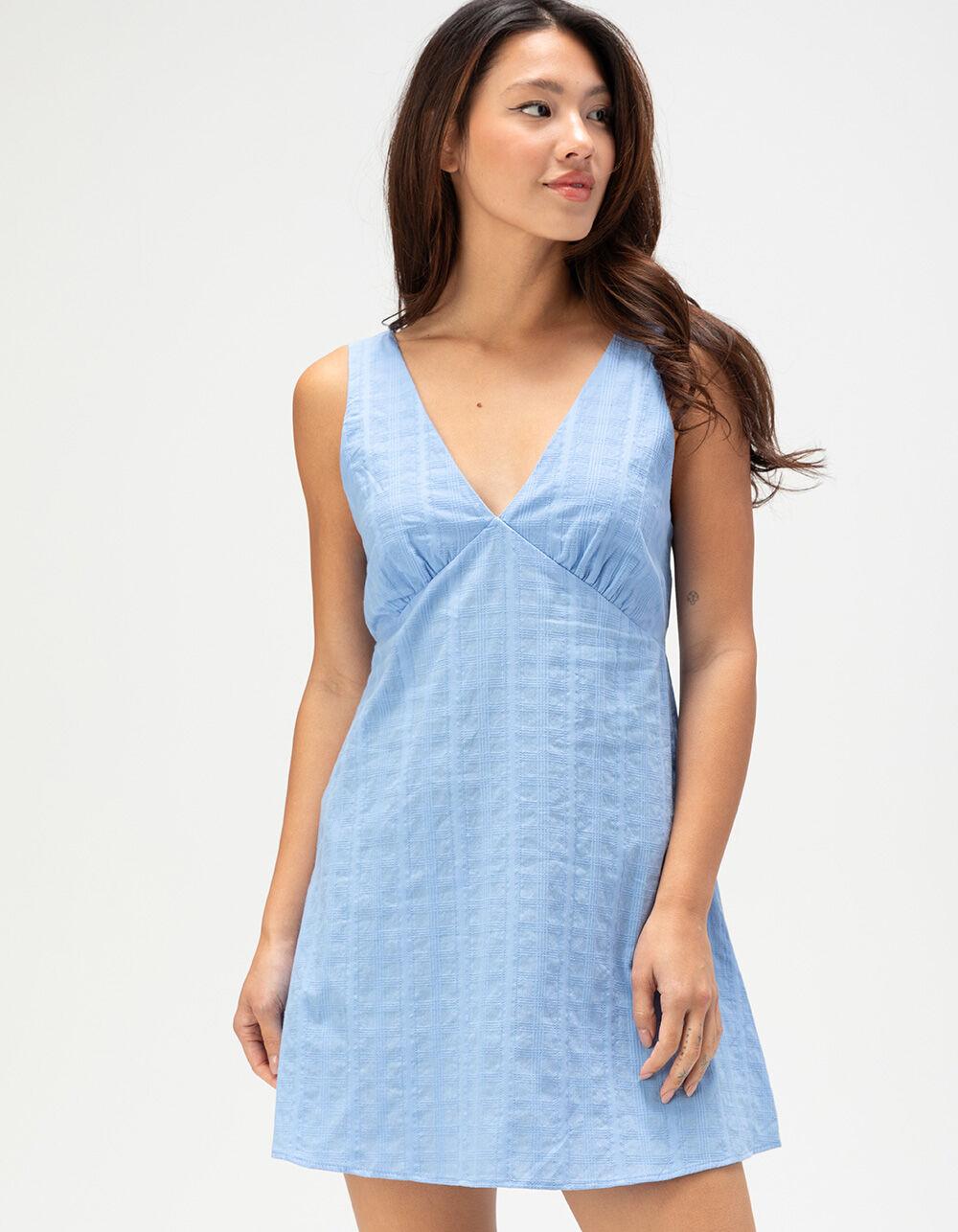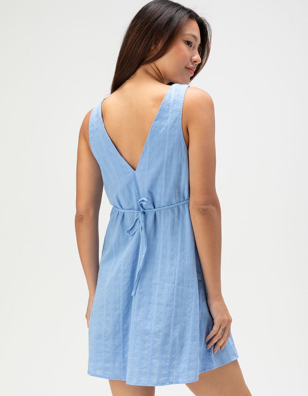 BLUE. Rhythm Tyler Mini Dress. Celebrate the freedom of coastal days with the Cornflower Blue Tyler Mini Dress, featuring wide straps and a relaxed fit. The textured check and deep V neckline capture the essence of carefree days by the beach, with an adjustable back tie ensuring a perfect blend of comfort and playful elegance. Approximate length: 32". 100% Cotton. Machine wash. Imported.