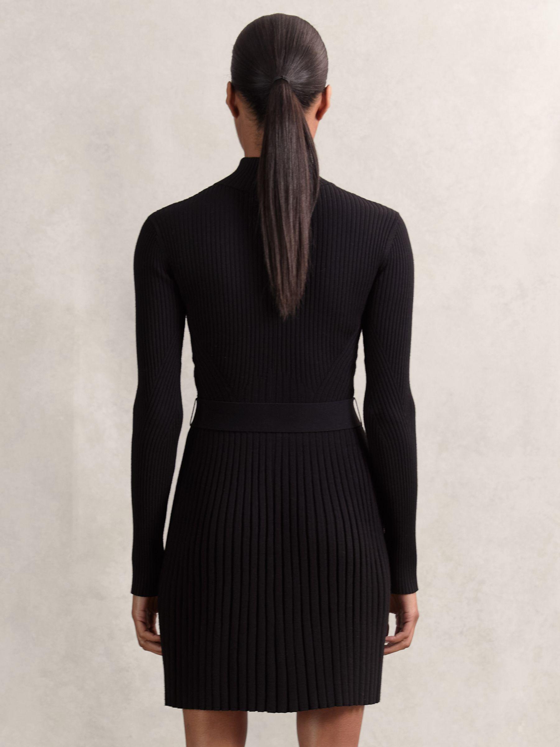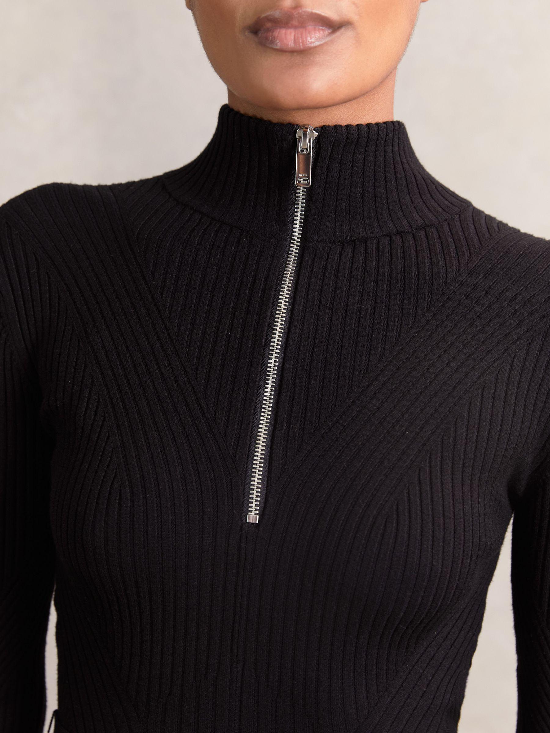 Rib-Knit Belted Half-Zip Flippy Dress in Black