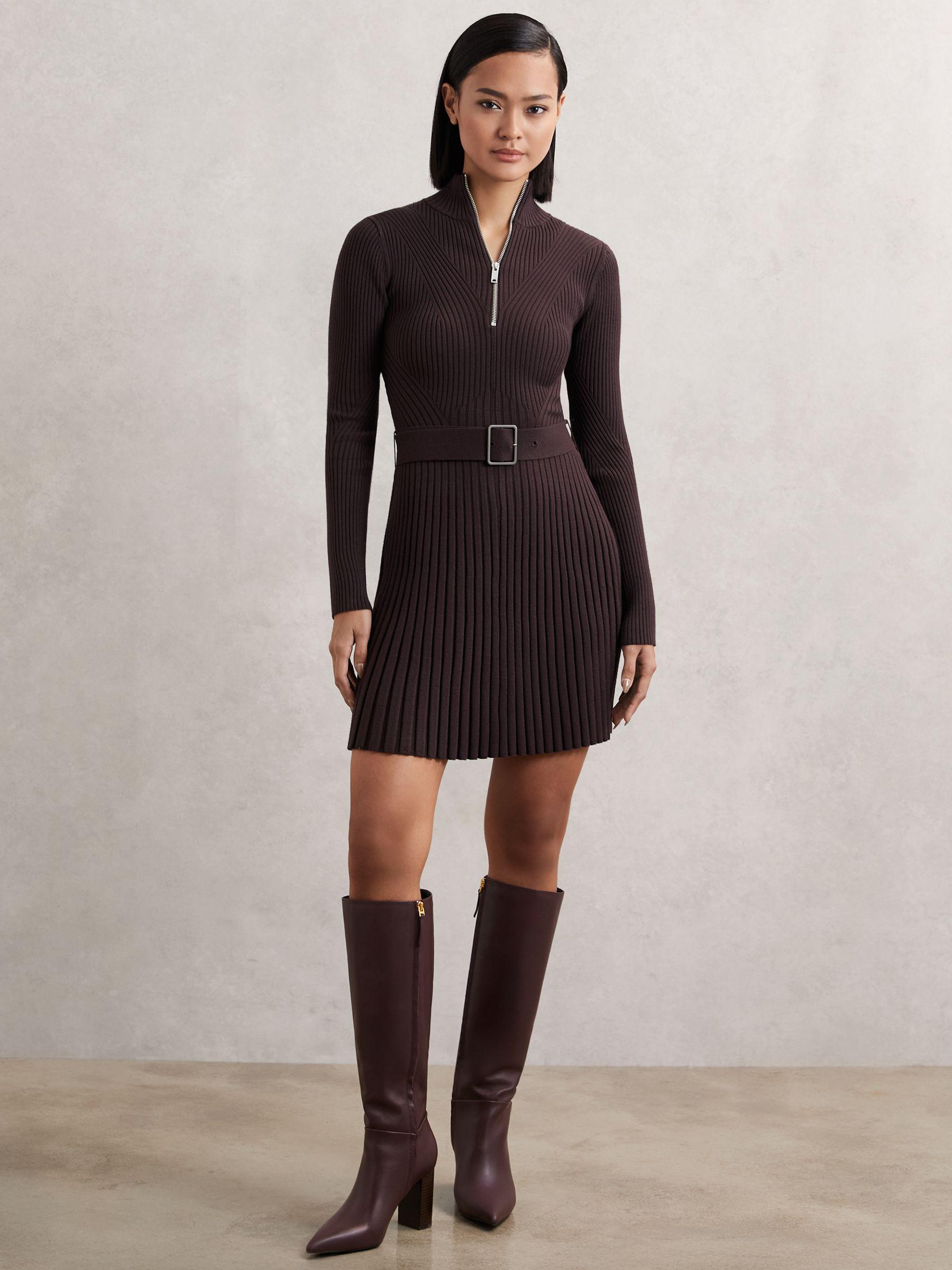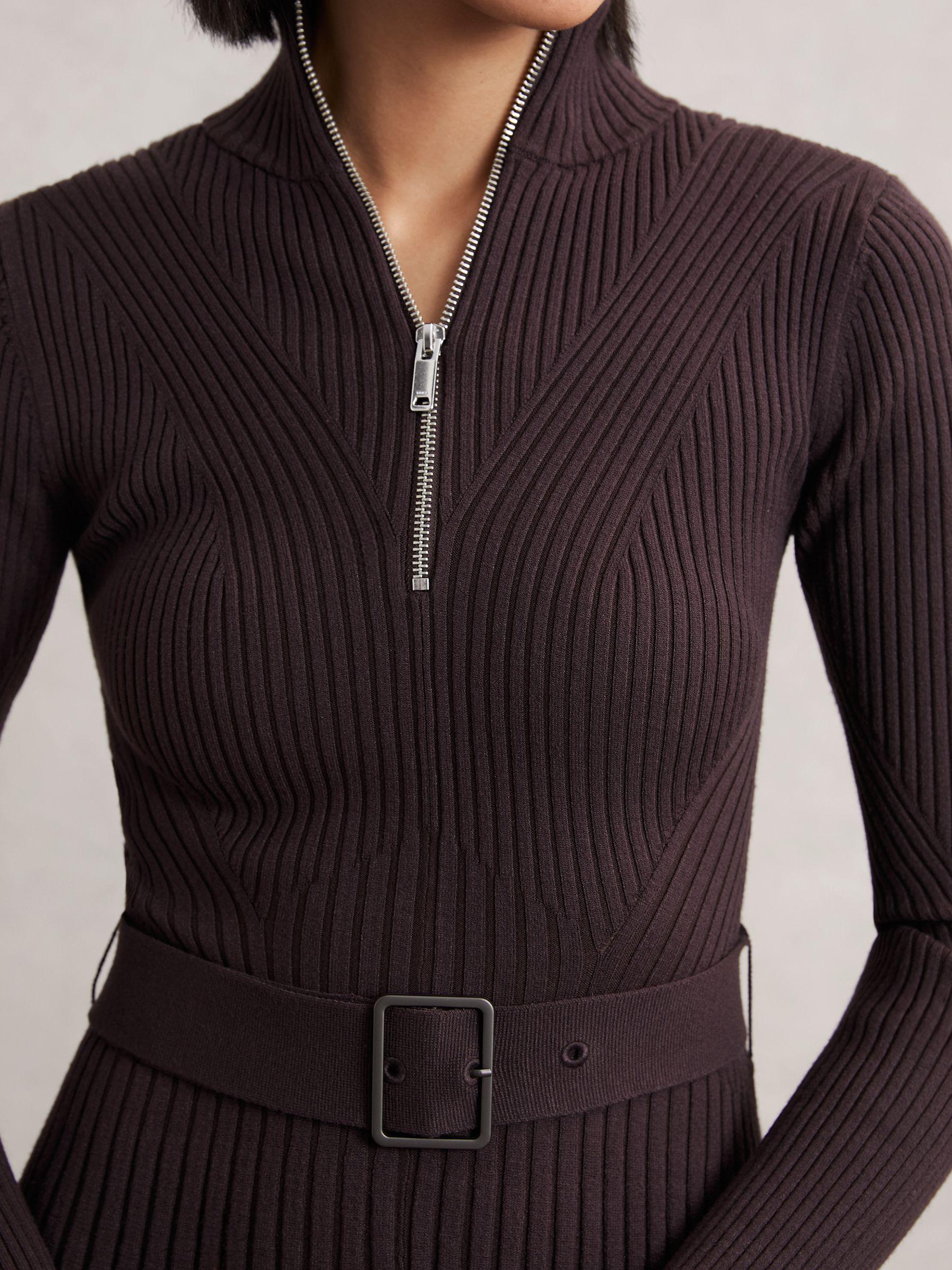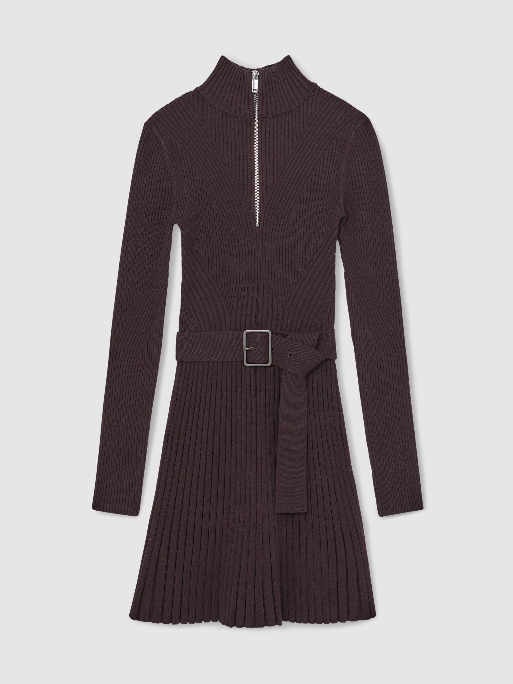 Rib-Knit Belted Half-Zip Flippy Dress in Plum Purple