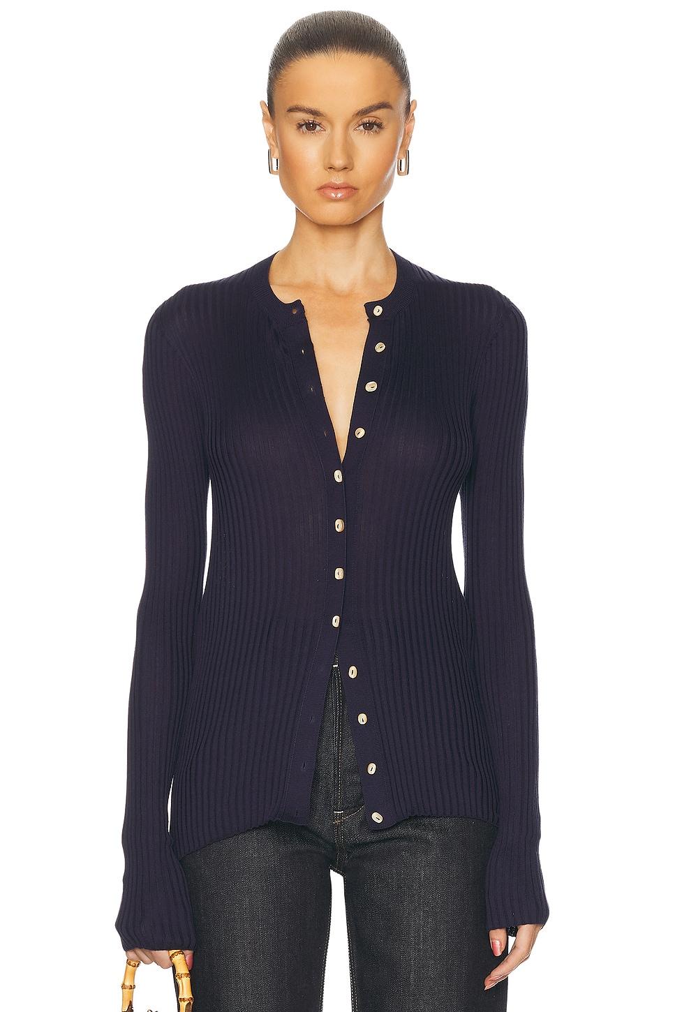 knit cardigan100% silk / Made in Italy / Dry clean only / Front button closure / Lightweight ribbed knit fabric / Our Style No. JILS-WK54 / Manufacturer Style No. J04HP0006-J16137-402 / Model is wearing size 36.