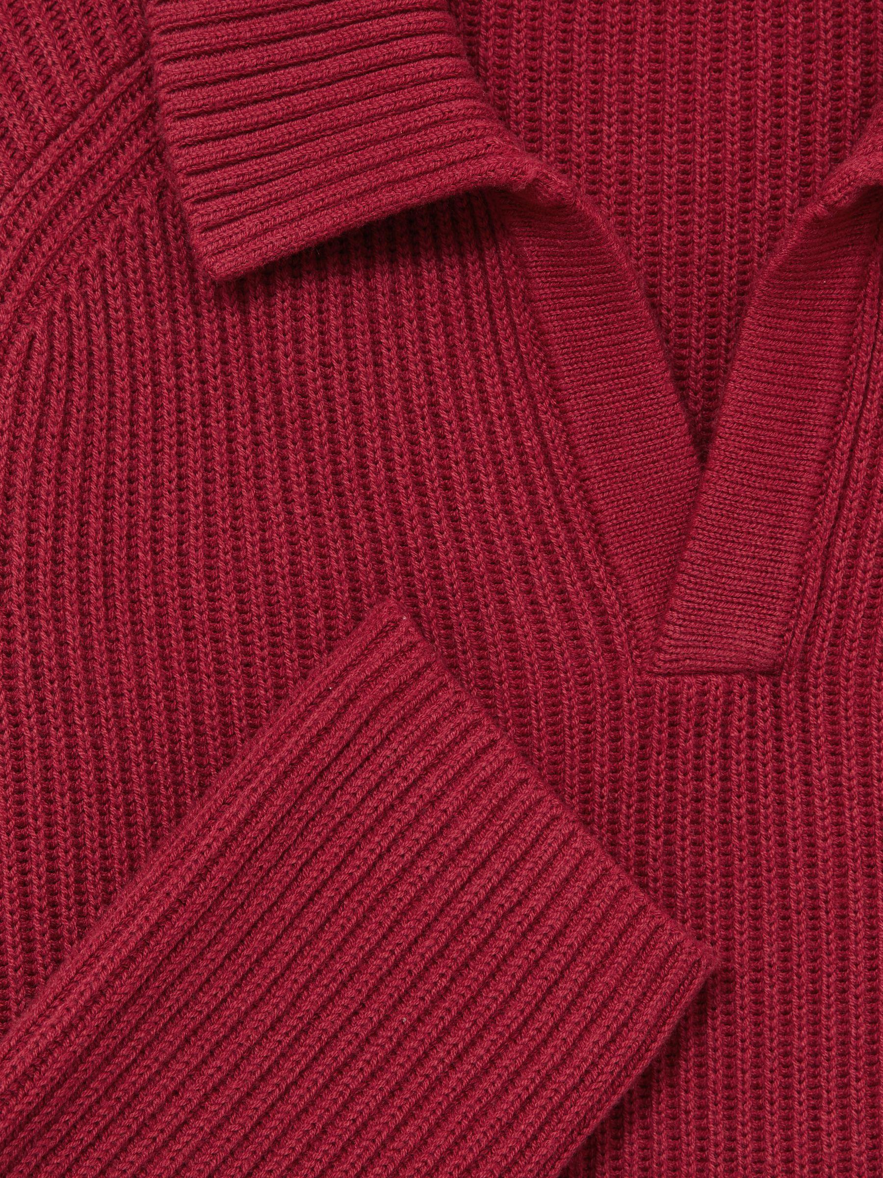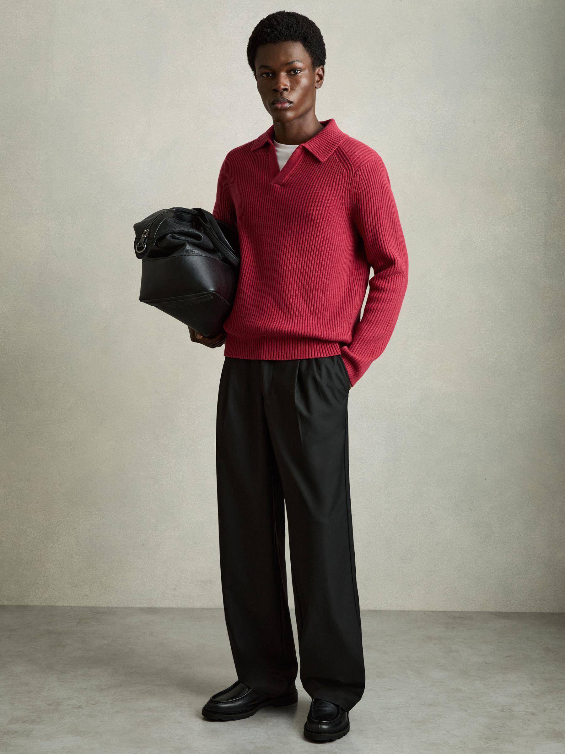The Kingston polo shirt is crafted from a cotton blend enriched with wool, offering warmth and softness. Its chunky rib-knit texture lends a tactile, modern appeal, whilst an open collar adds a relaxed edge. Saddle sleeve detailing enhances its contemporary design. Cotton blend with wool. Chunky rib knit. Open collar. Saddle sleeve detailing. The model is wearing a size M. Measurements of model: 6ft1/185cm.