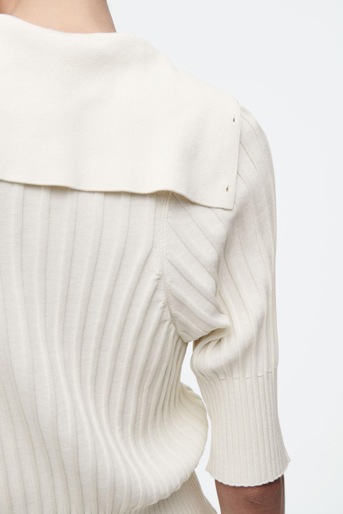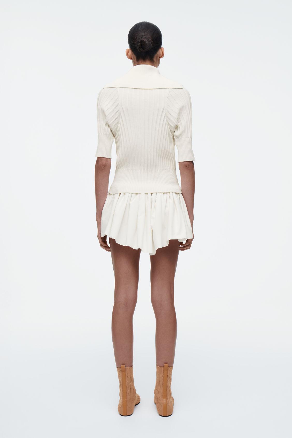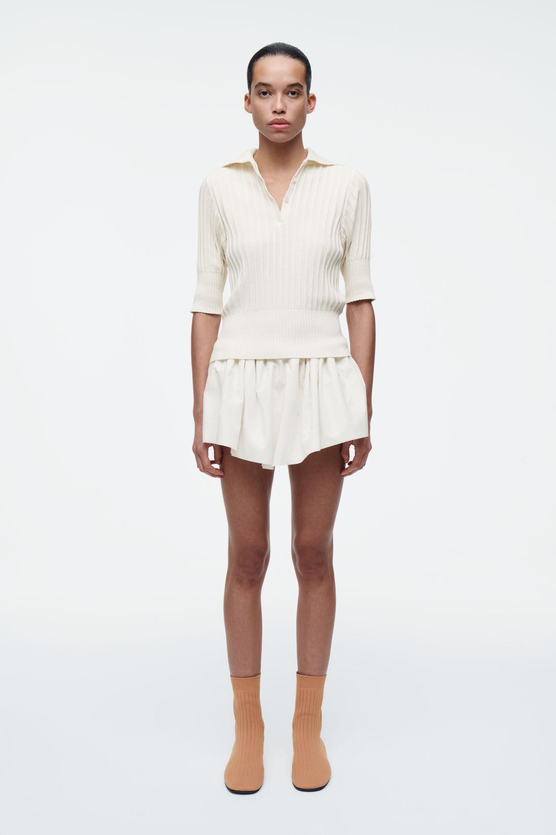 The COS SS25 runway collection builds on the house codes of lasting design and exceptional craftsmanship. Proposing a refined take on the classic polo, this top is made from a blend of premium mulberry silk and soft cotton that's ribbed for a tactile finish. It's offered in a subdued ecru tone and features tonal buttons and an oversized collar that can be worn as a rollneck or folded effortlessly over the shoulders. Style it as a coord with the matching micro shorts. Slim fitButton closure Shell: 55% Mulberry silk, 45% Cotton. Excluding trims / Machine wash Back length of size S is 55cm / Model wears a size S
