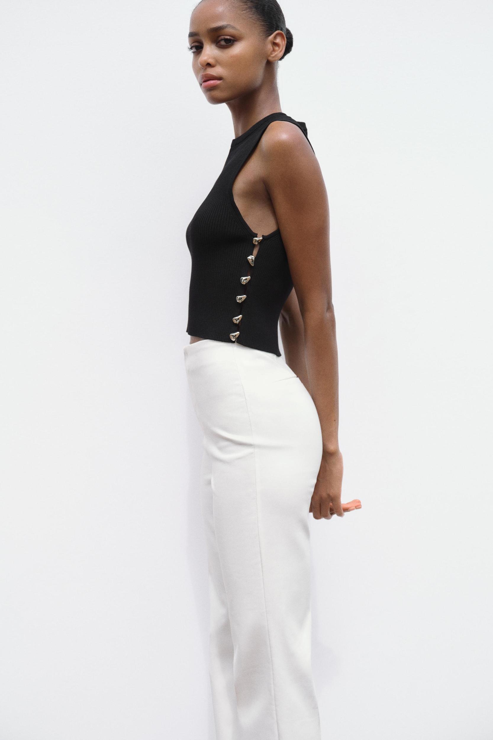 Sleeveless round neck crop top. Side detail with irregular metal buttons.