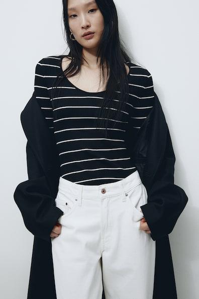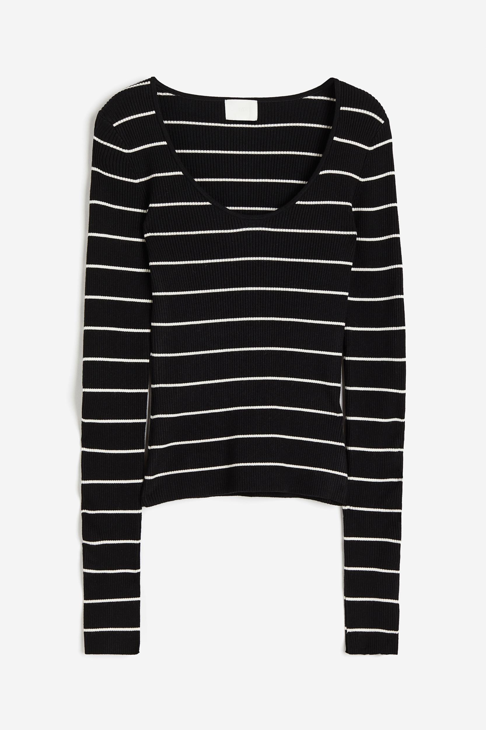Fitted top in a soft rib knit. Scoop neck and long sleeves with slit at cuffs.