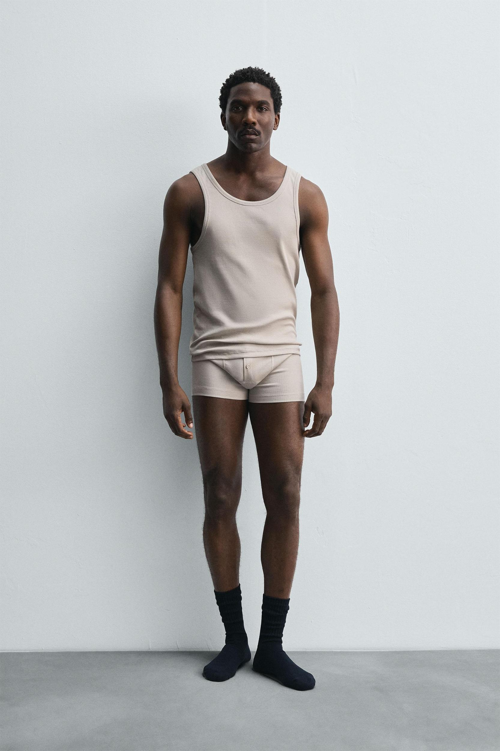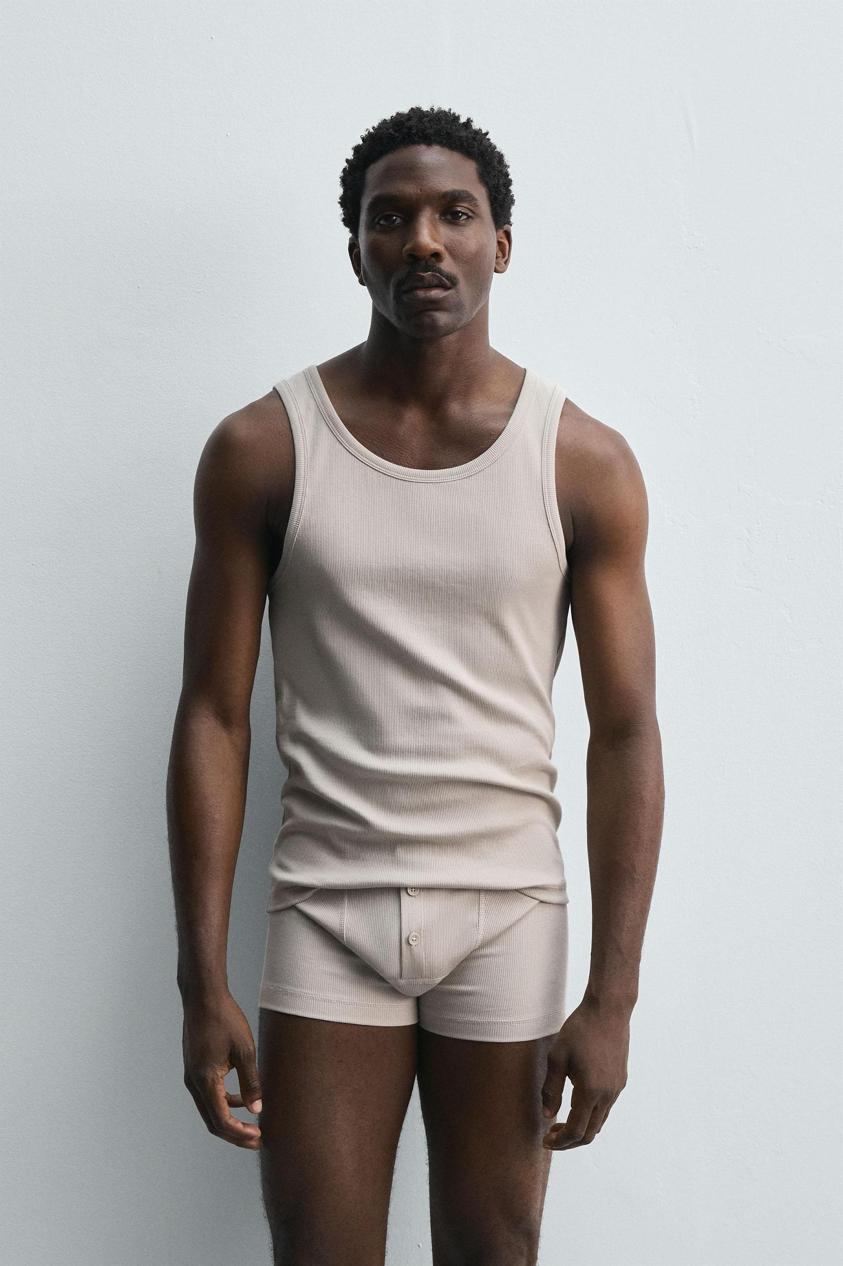 Pajamas made of cotton fabric with elasticity. - Slim fit T-shirt. Wide round neck and sleeveless. - Short boxers. Elastic waistband.