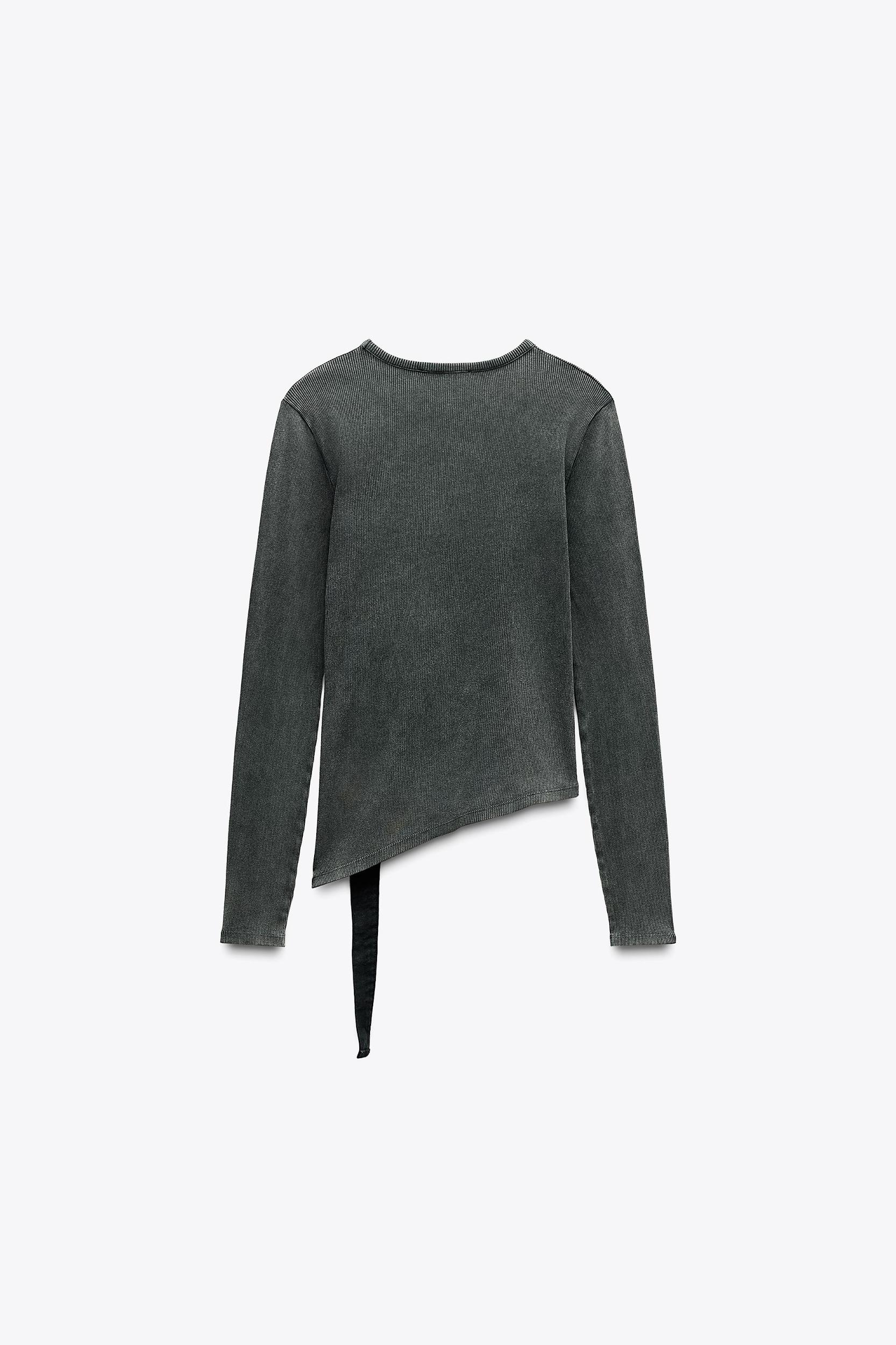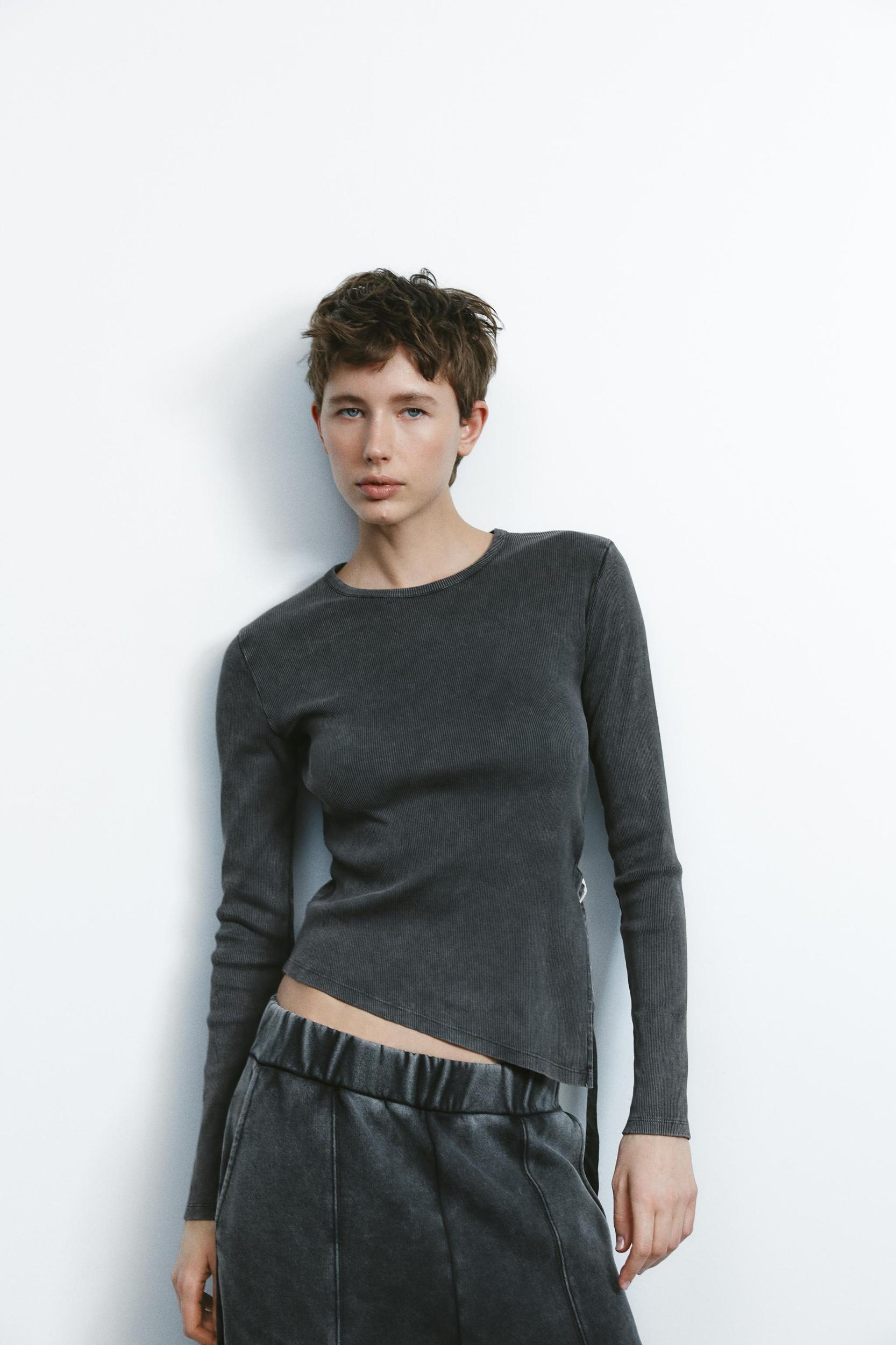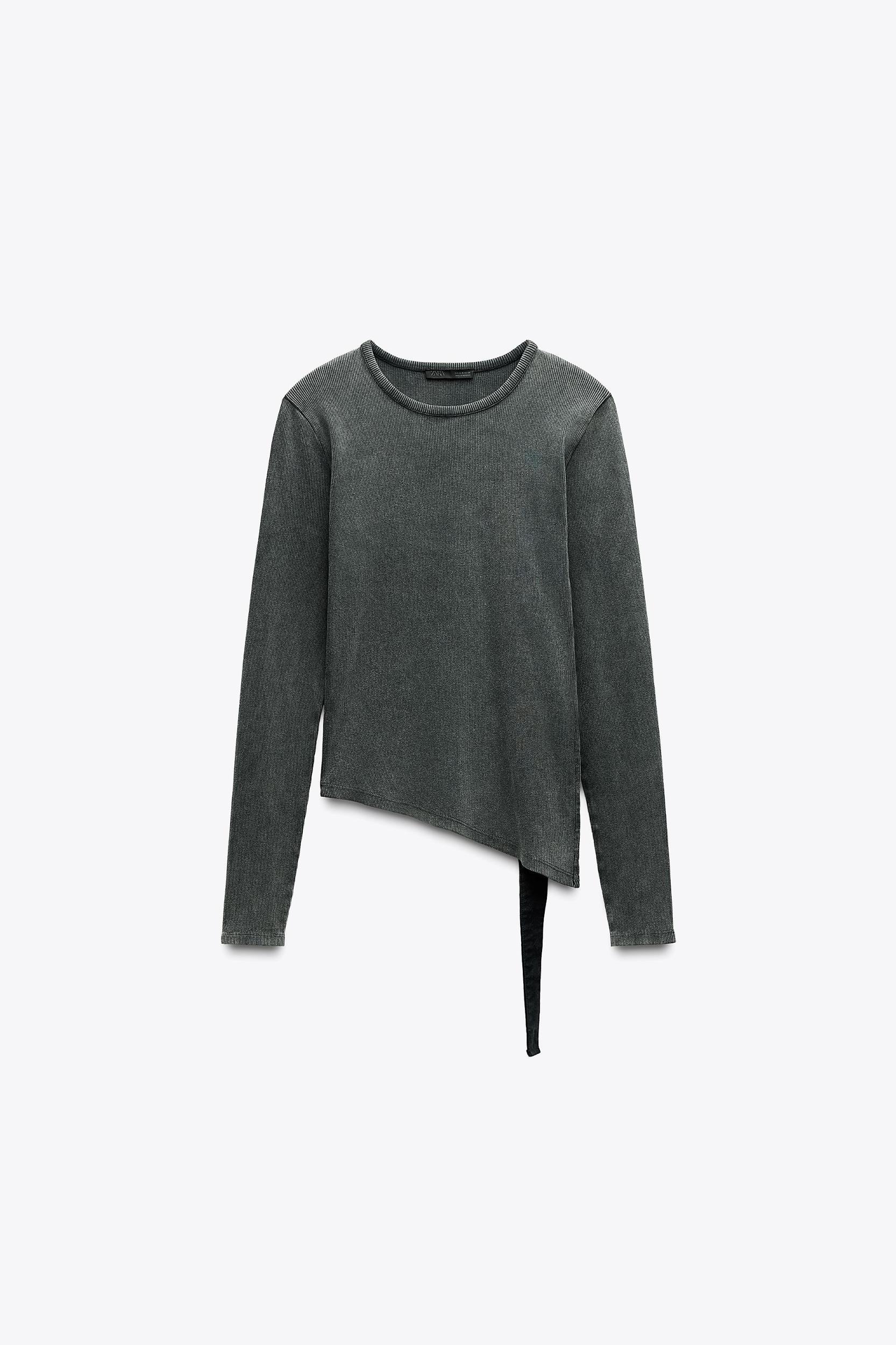 Washed effect T-shirt. Round neck and long sleeves. Self-fabric belt with metal buckle. Asymmetrical hem.