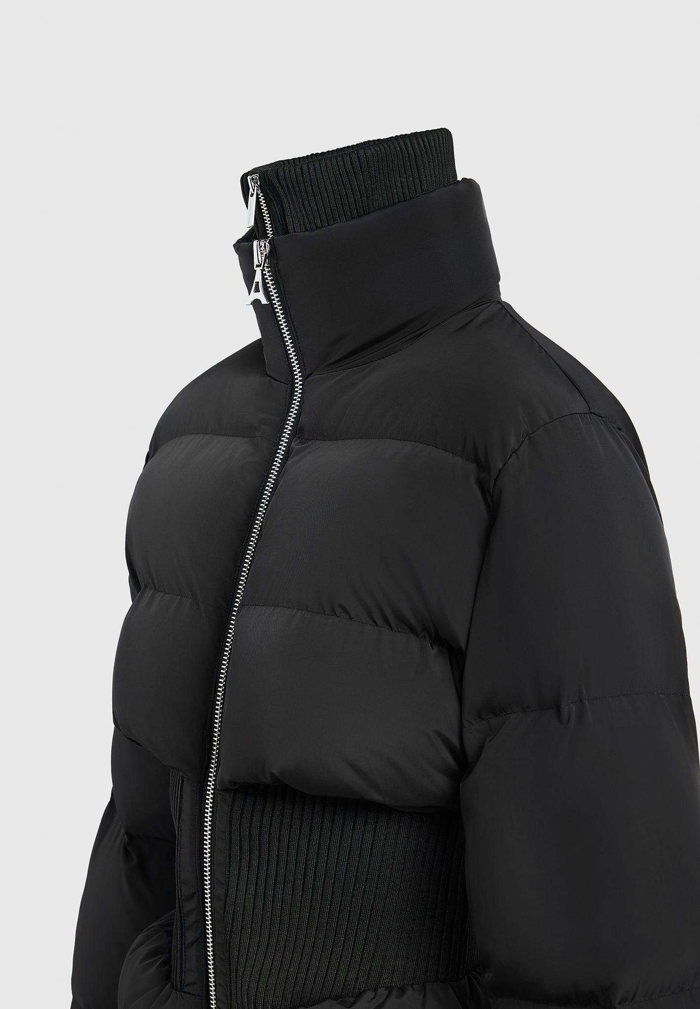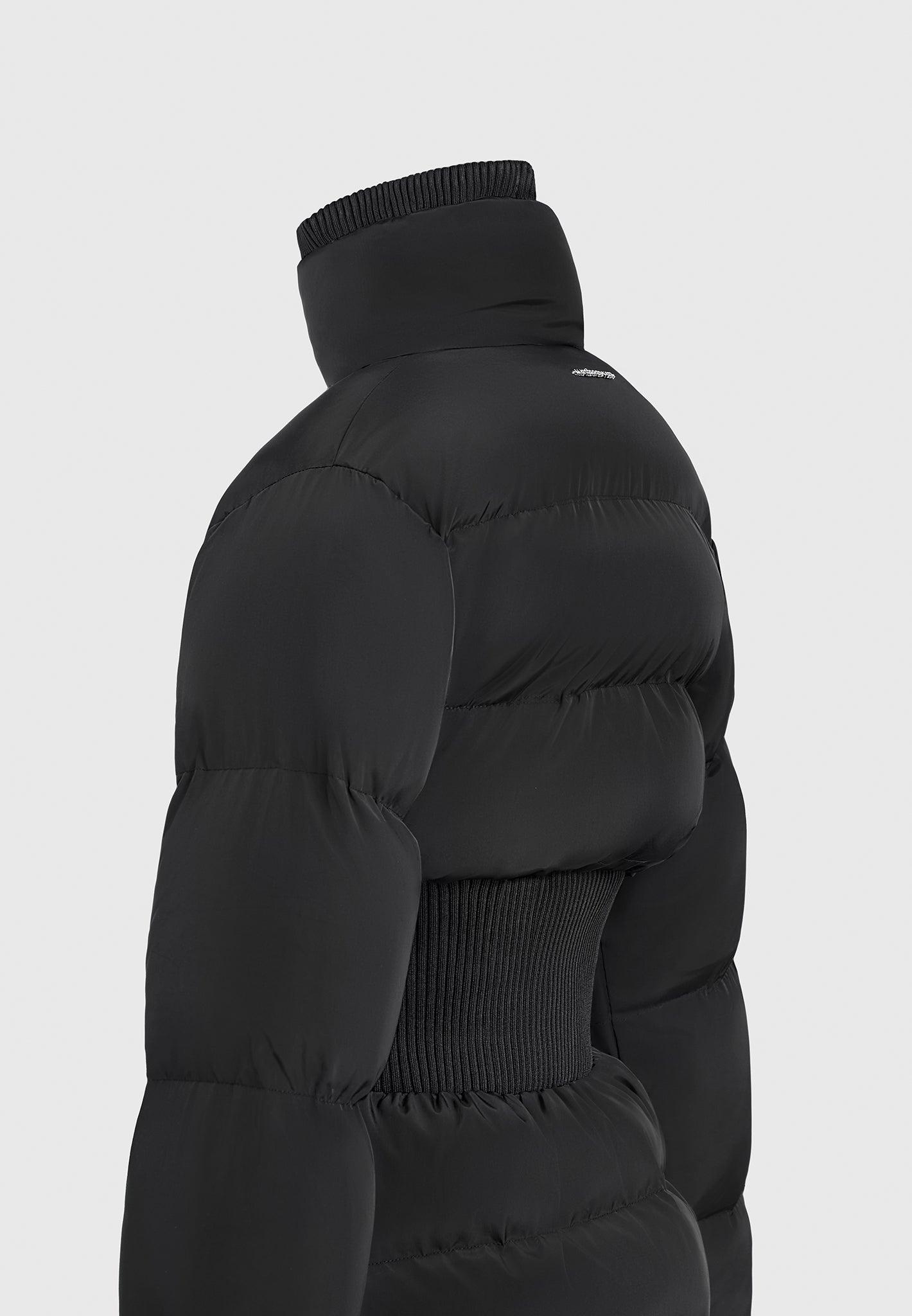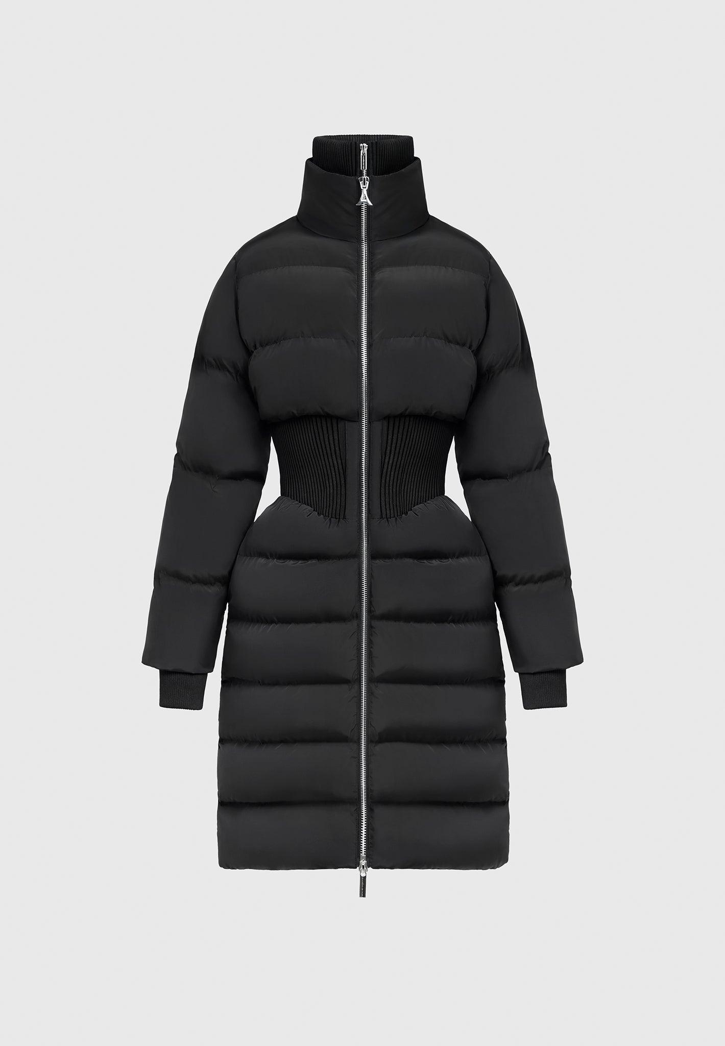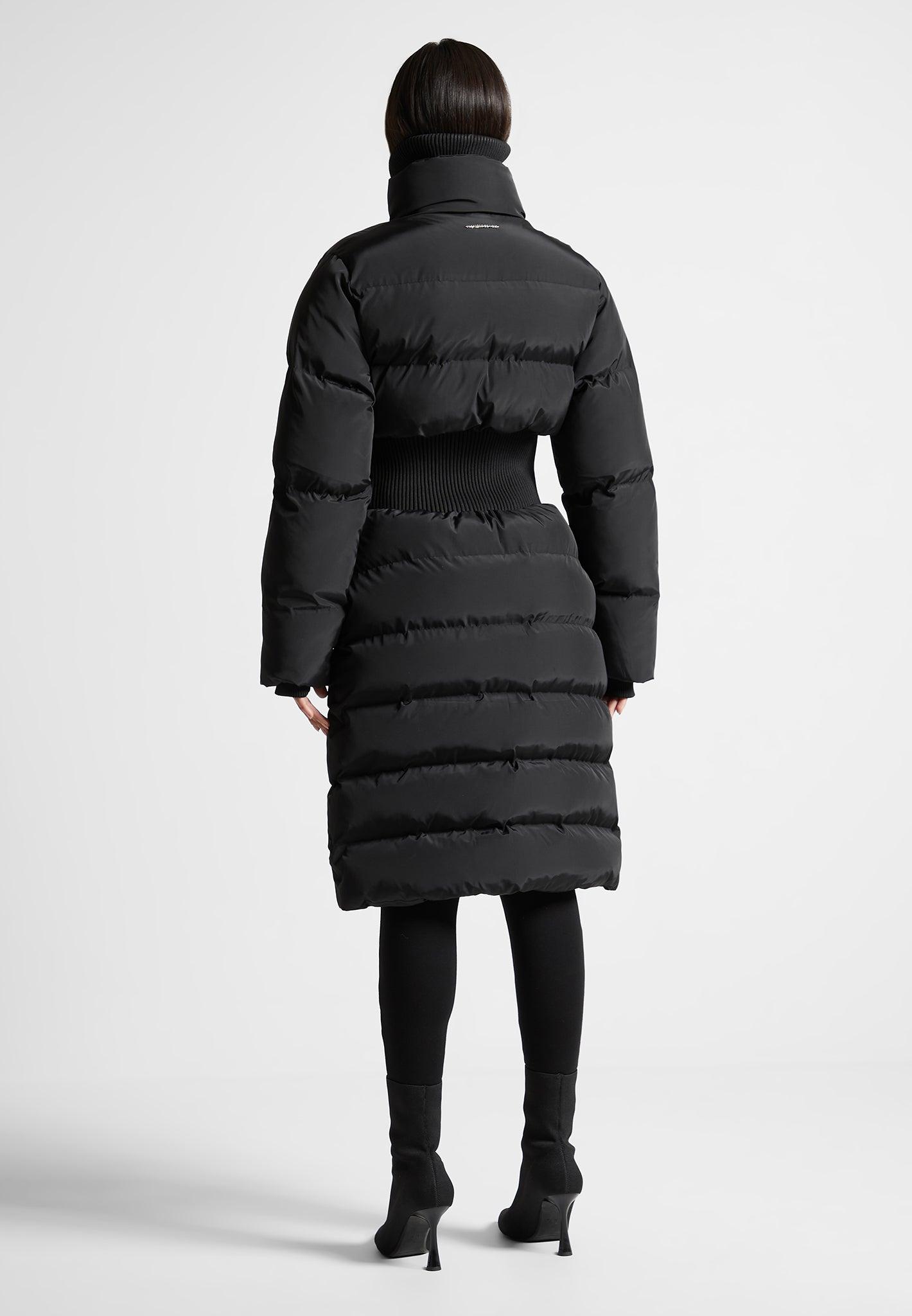 Keep warm and look chic with this black ribbed corset longline puffer coat. Its tailored silhouette and figure-flattering ribbed fabric will ensure you look stylish in any cold weather while its insulation will keep you cosy and comfortable. Longline Puffer Coat Silhouette Elasticated Cinch Waist Detail Warm Insulating fit High Neck Collar with Zip Side Slip Pockets Silver Manière De Voir Text Plaque Silver Manière De Voir Eiffel Zip