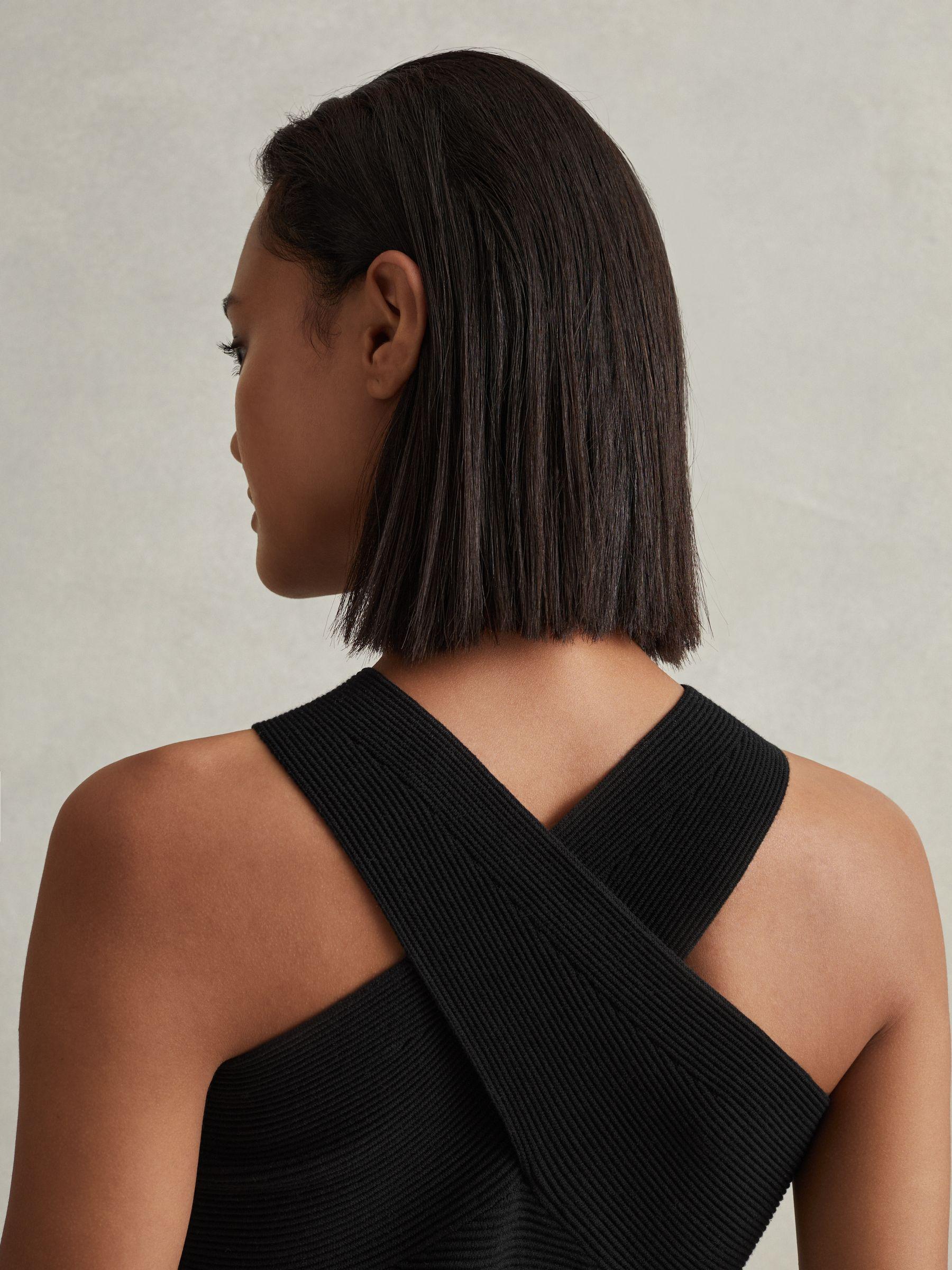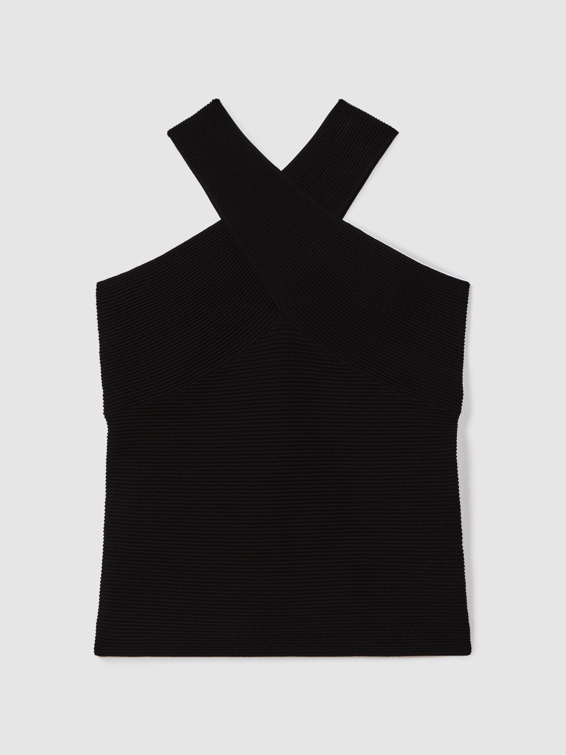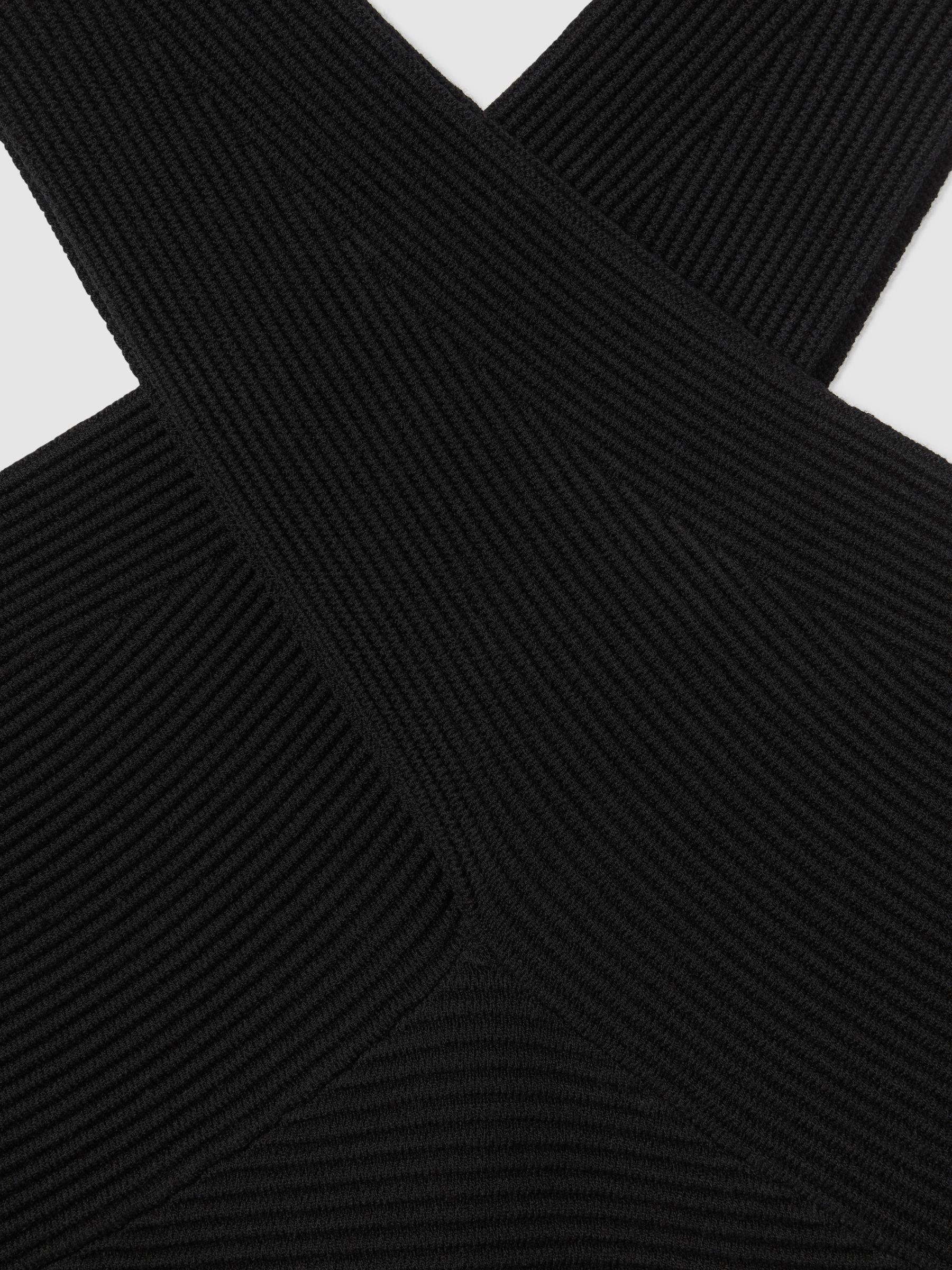 The neutral Darla vest is made from a stretchy ribbed fabric that hugs the body, and it’s arranged in a cross-over style at the front and back. Ribbed Cross-over style. The model is wearing a size S Measurements of model: Height 5 10" / 177.8cm.