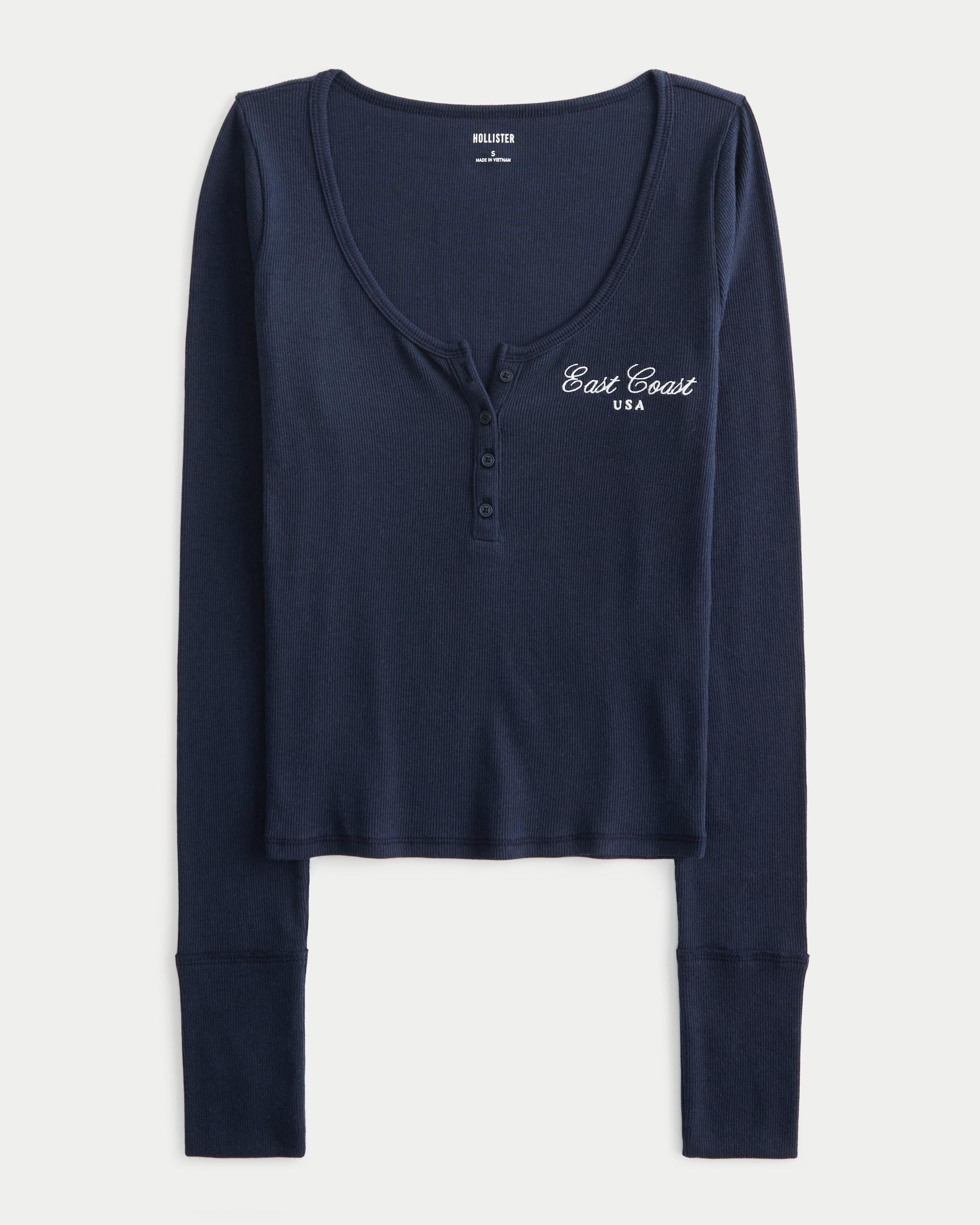 Made with super soft ribbed fabric, this henley features a button placket and embroidered East Coast USA graphic at the left chest. Long sleeves. Slim Fit.