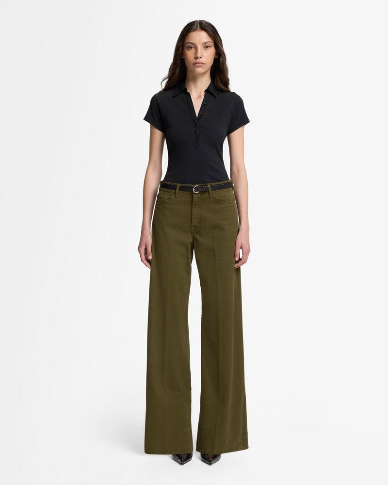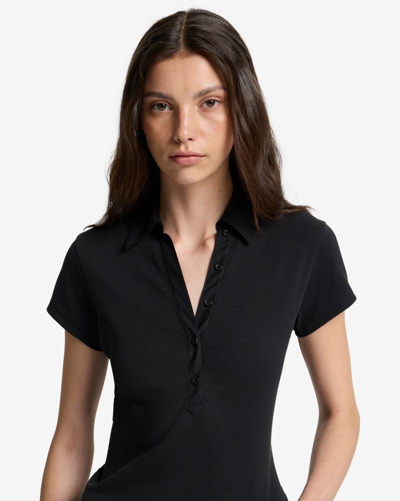 Fits like: This polo gently contours to your shape, offering a polished look with a relaxed vibe.Feels like: A soft, smooth fabric that stretches comfortably, molding to your body for a second-skin feel. The Details: Deep black shade Polo neck collar Rib detail