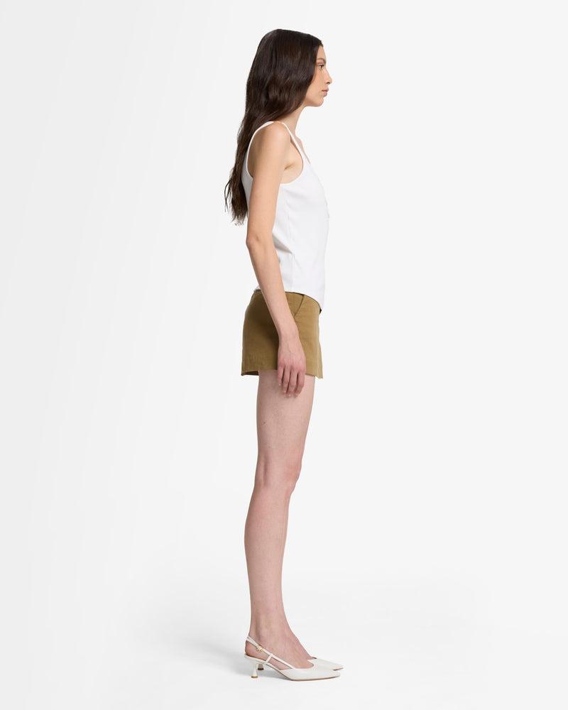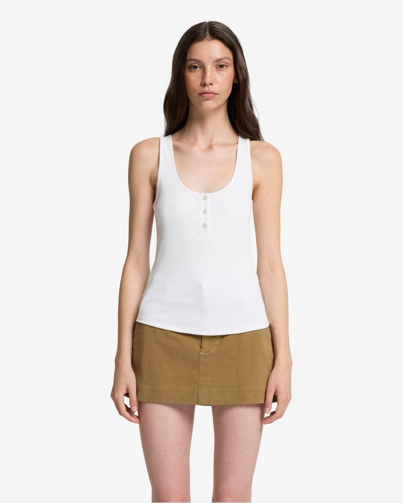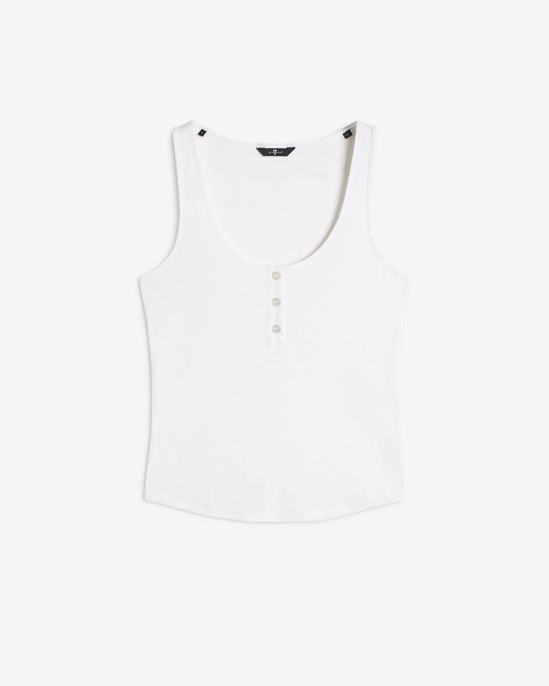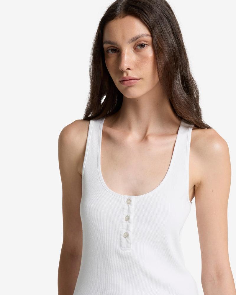 Fits like: A fitted, ribbed design that gently hugs your body, offering a flattering silhouette with a touch of stretch.Feels like: Silky-smooth with just the right amount of stretch, giving you a sleek and comfortable fit The Details: Bright white Ribbed fabric Scoop Neck Henley button up detail Racerback