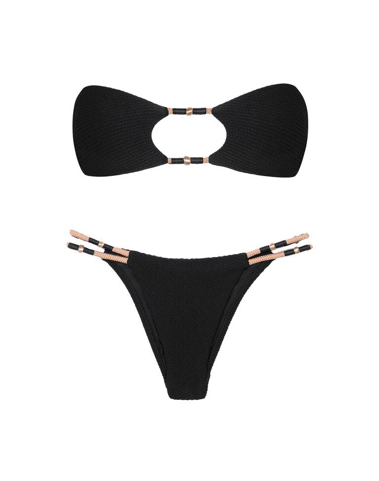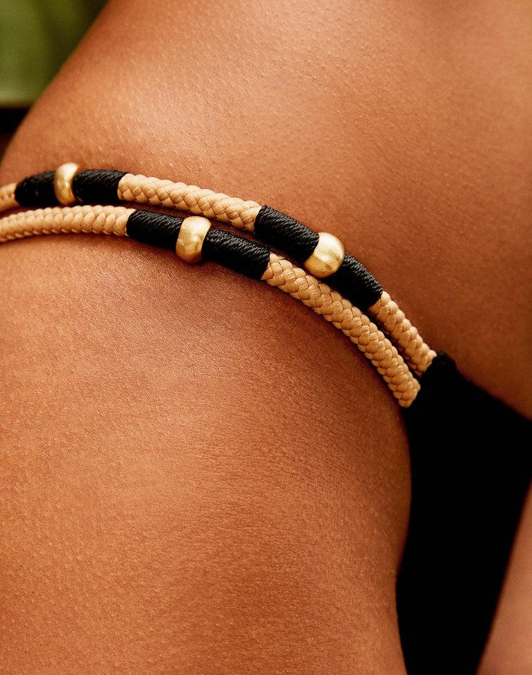 The ViX Layla Bottom is a unique bikini bottom featuring beige elastic cords embroidered with black waxed thread and accented by delicate golden beads. This exquisite design has a ribbed fabric that adds a touch of sophistication and luxury to your swimwear collection. Style the Layla Bottom with a matching top and lon