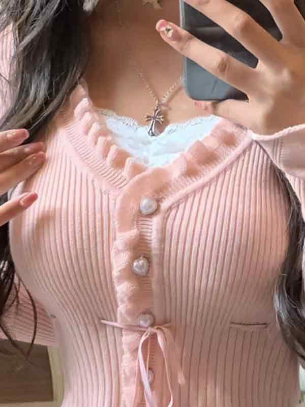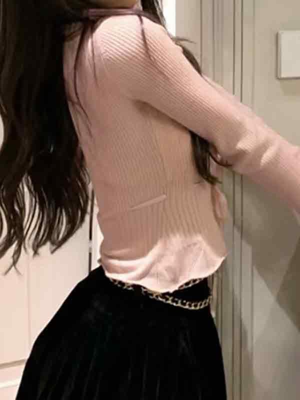 Ribbed Pearl Button Lace Up Long Sleeve Knit