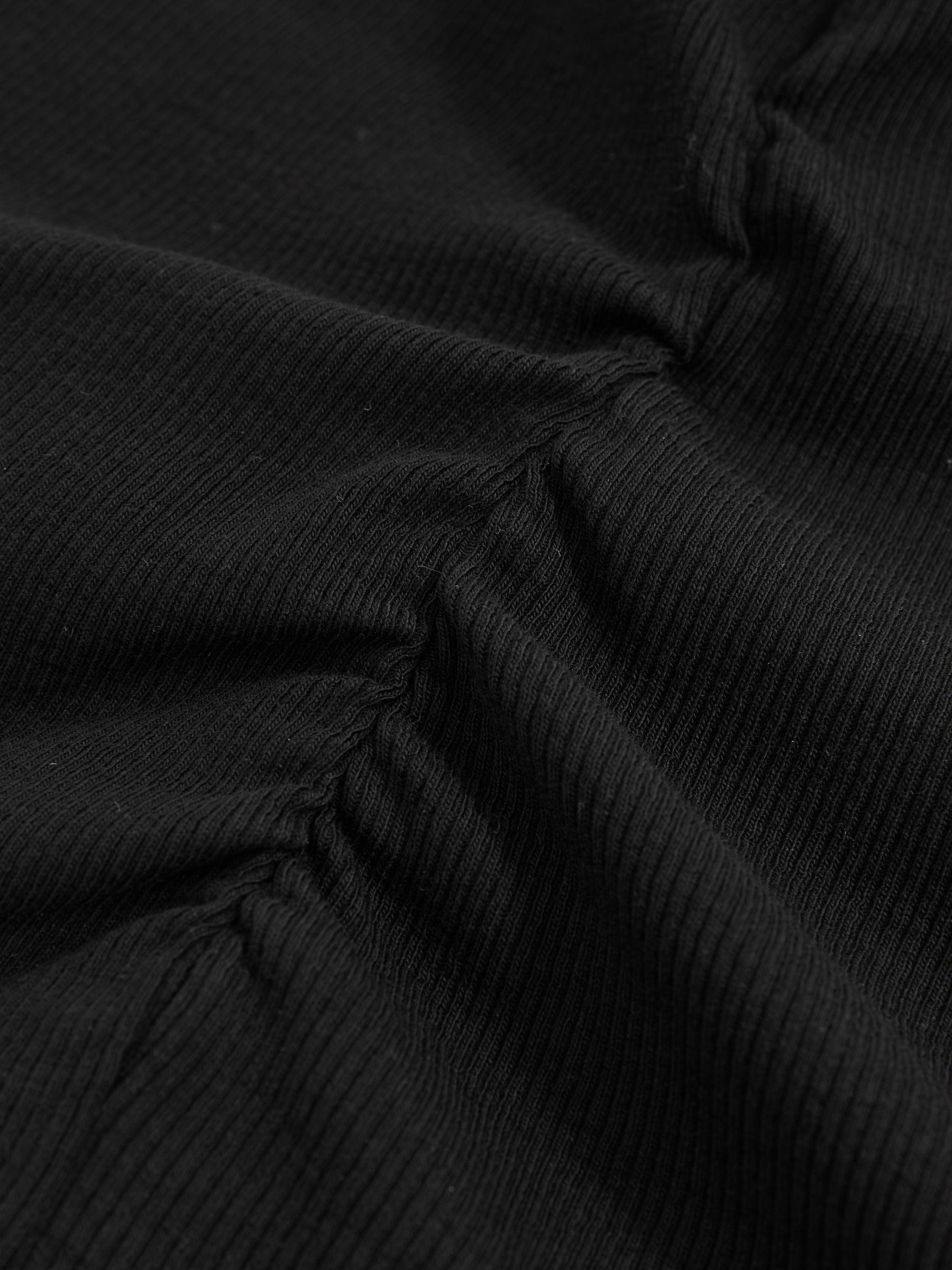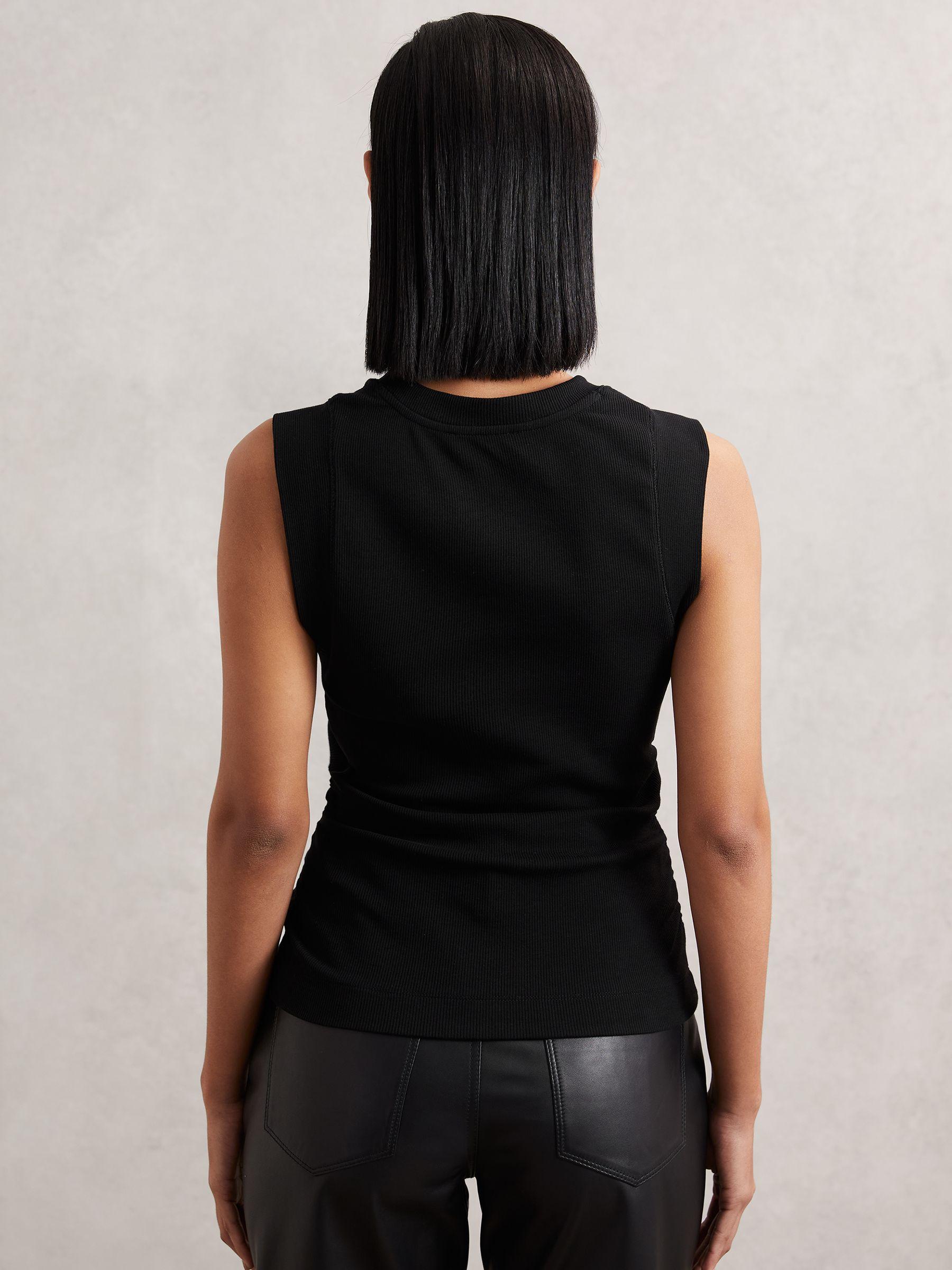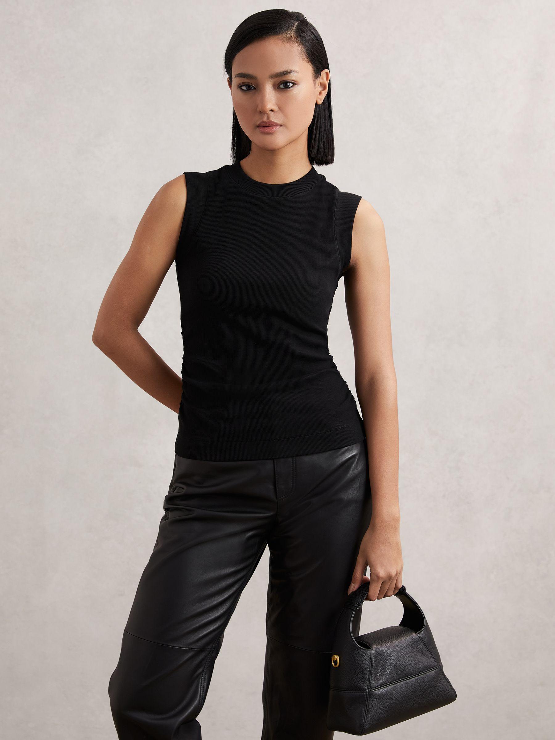 The Trudy updates a classic vest shape with flattering ruching to the waist and refined capped sleeves. Its ribbed cotton composition is blended with stretch to comfortably hug the body. Cotton blend. Ribbed. Capped sleeves. Ruched detailing to sides.