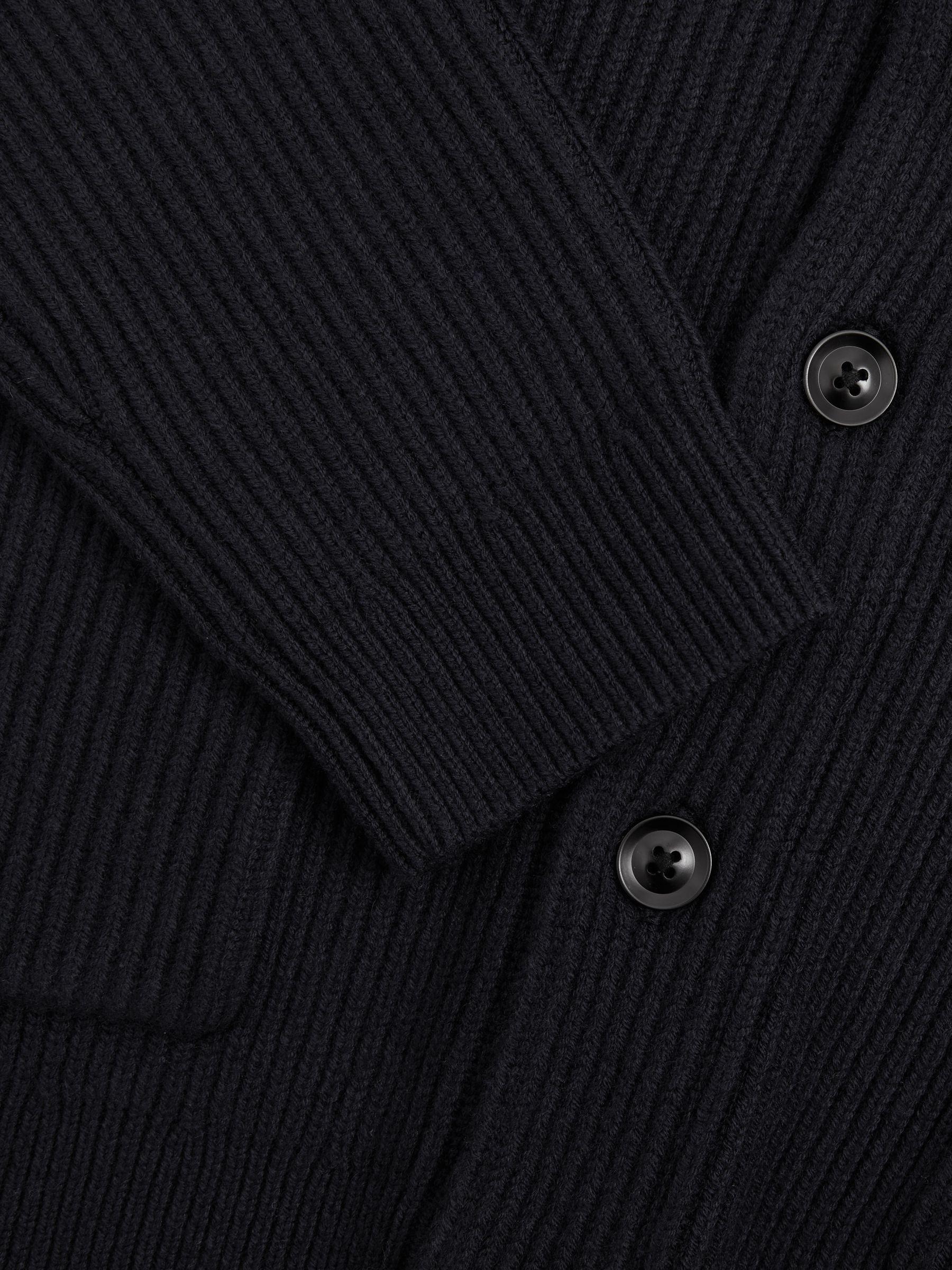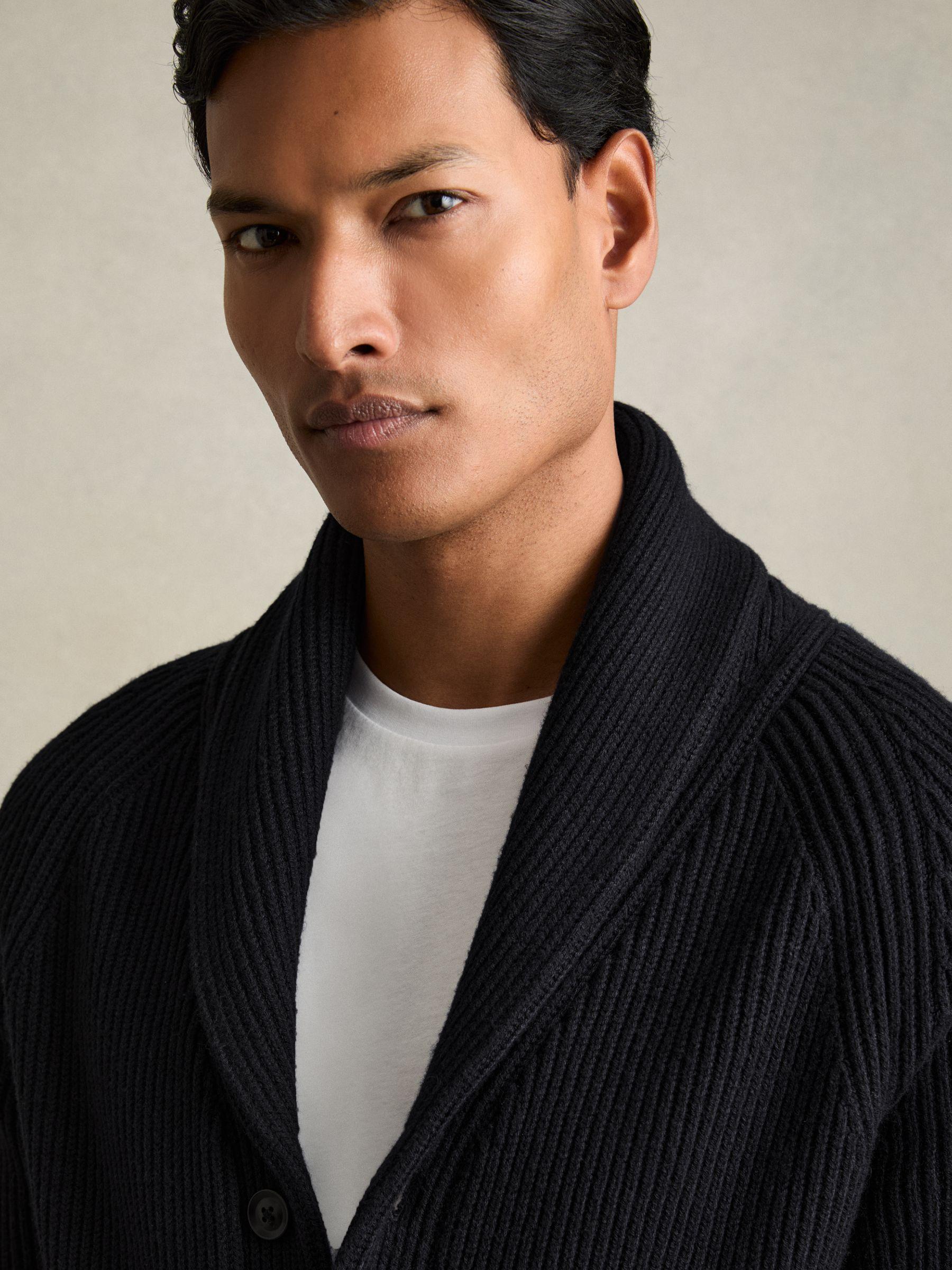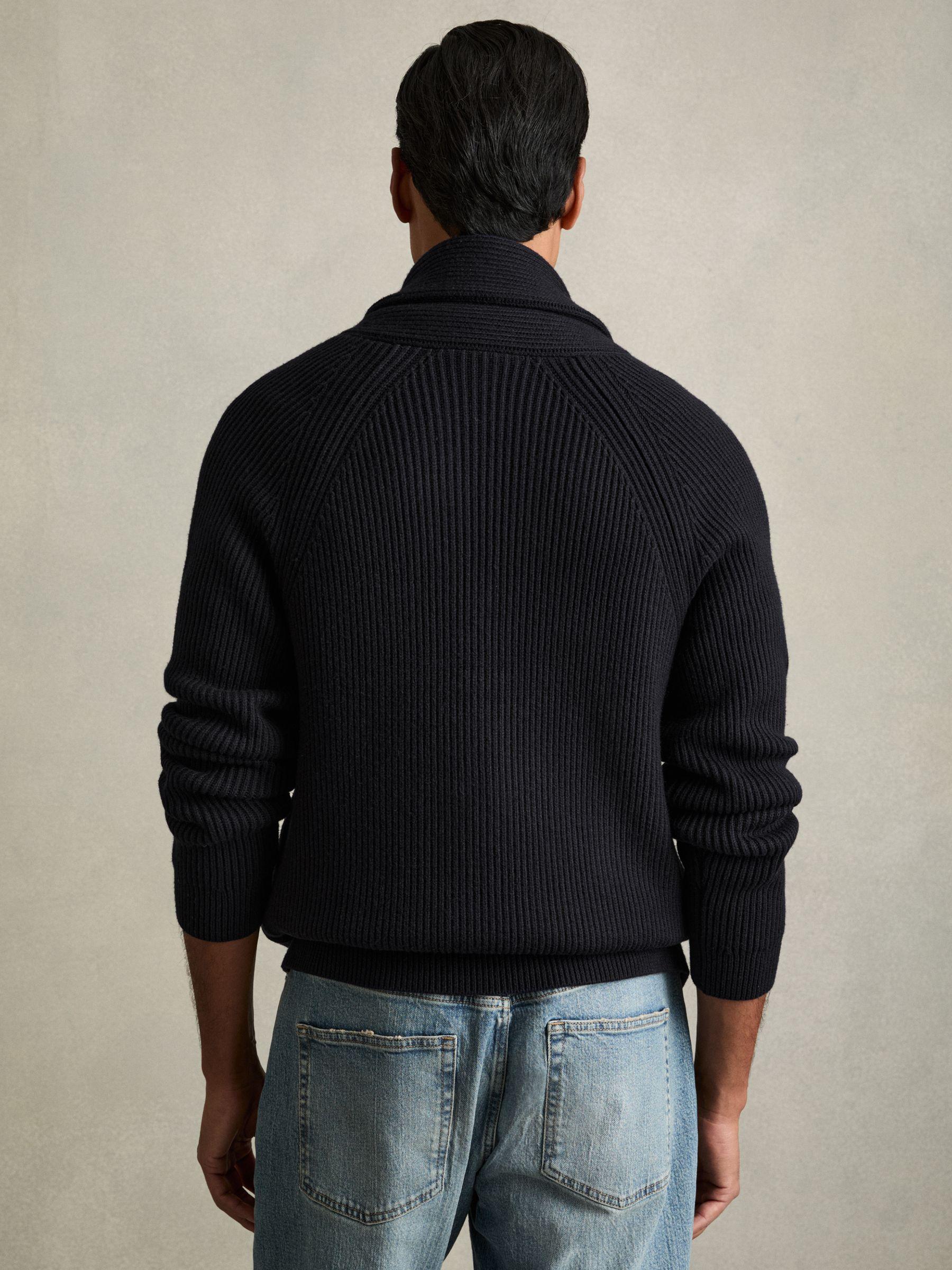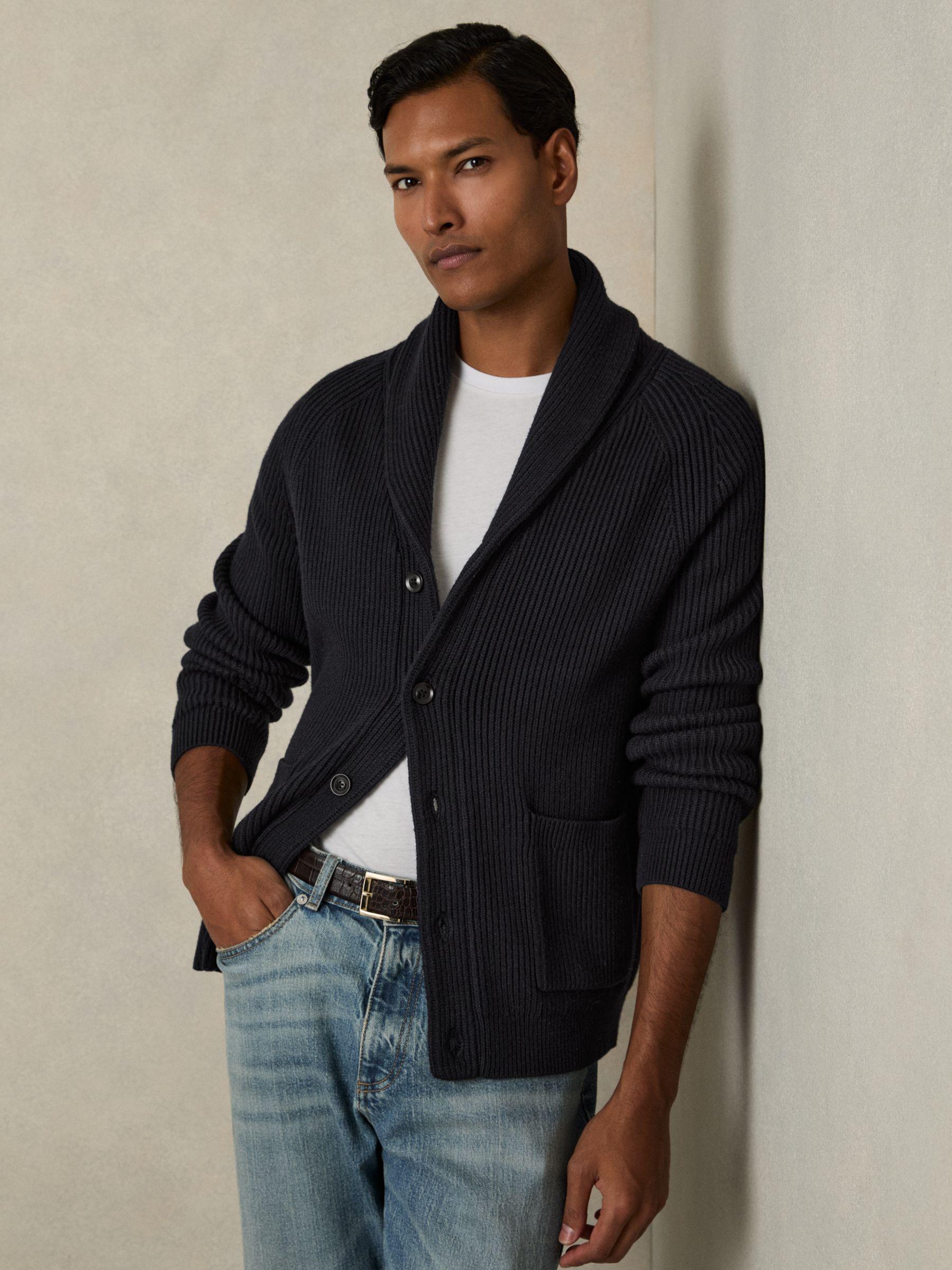 Ribbed Shawl-Collar Cardigan with Cotton and Wool in Navy