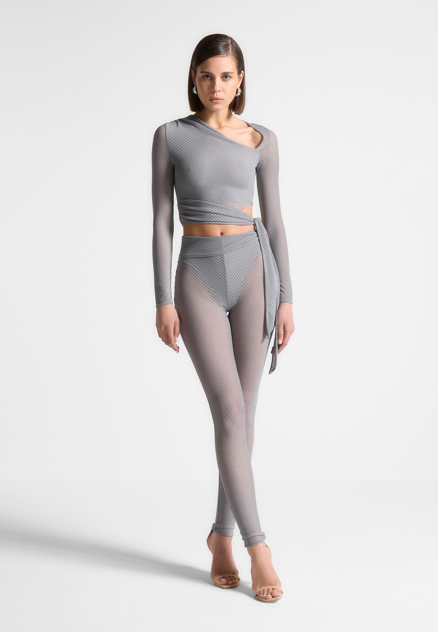 Expertly crafted with a lightweight double layer, this Ribbed Sheer Top with Tie in Grey boasts a unique asymmetric neckline for a modern touch. Perfect for any occasion, this top offers both style and comfort. Fabric: Always check the care label for wash instructions. Model is 5'8", 32.5" Bust, 24" Waist, 32" High Hip, 37.5" Low Hip and Wears UK Size 6 Based on UK Size 6 - Front Length cm/in, Chest cm/in, Sleeve Length cm/in Stretch Factor - /3