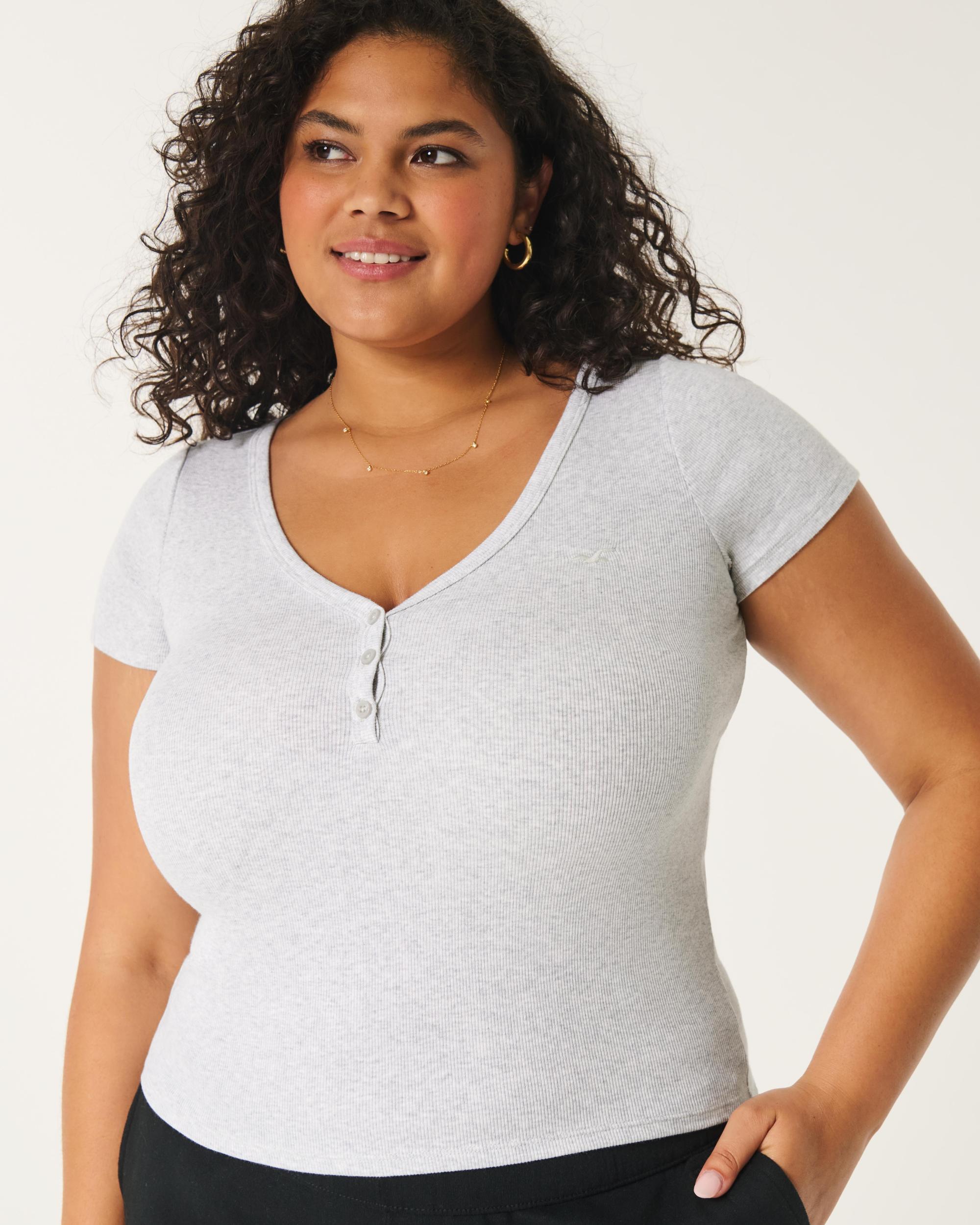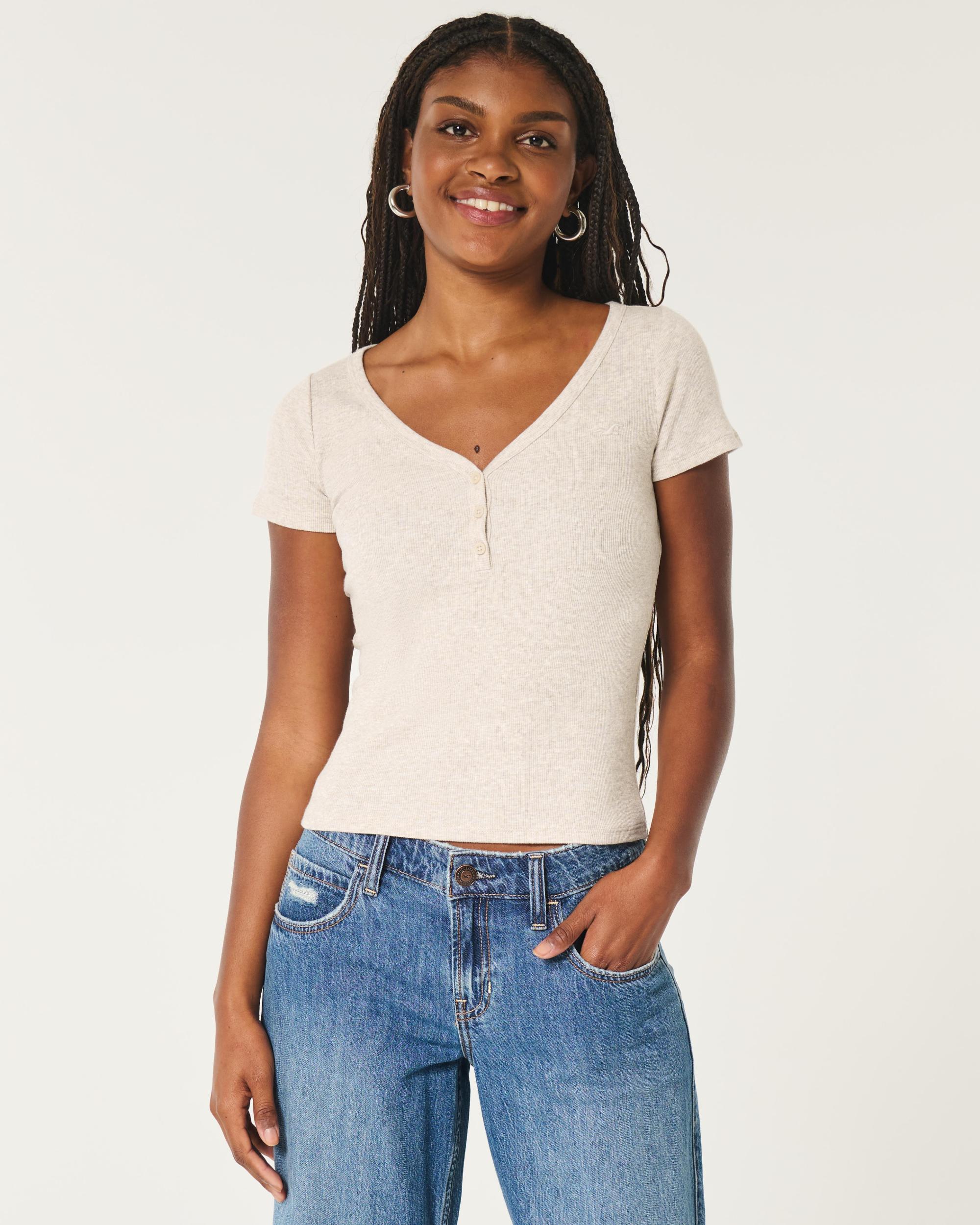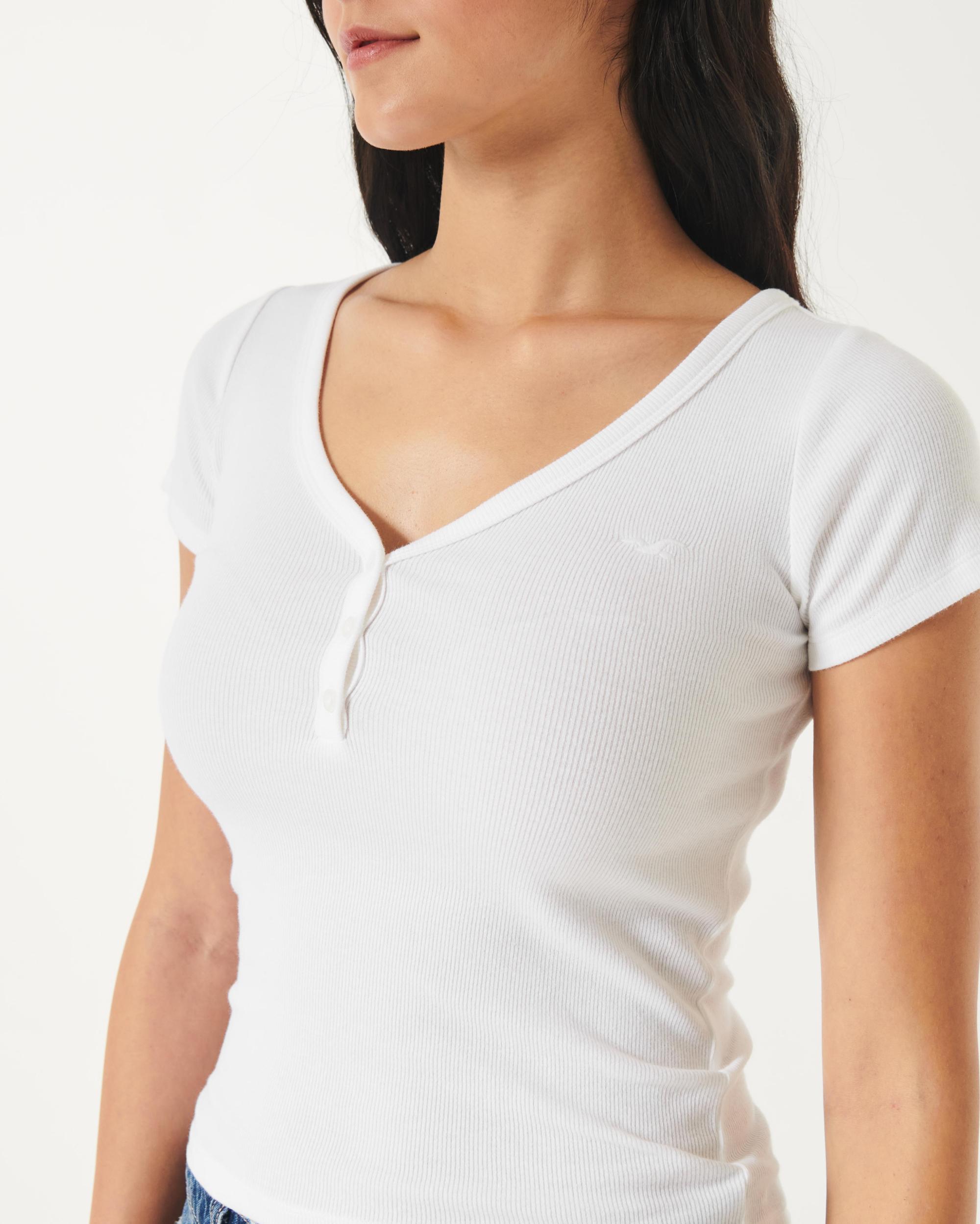 A cute and comfy short-sleeve henley made with super soft ribbed fabric. V-neckline, button placket, embroidered left chest logo icon. Slim Fit.