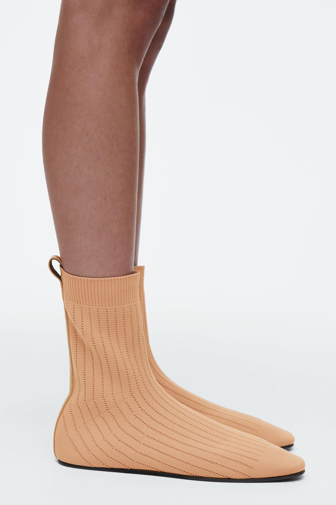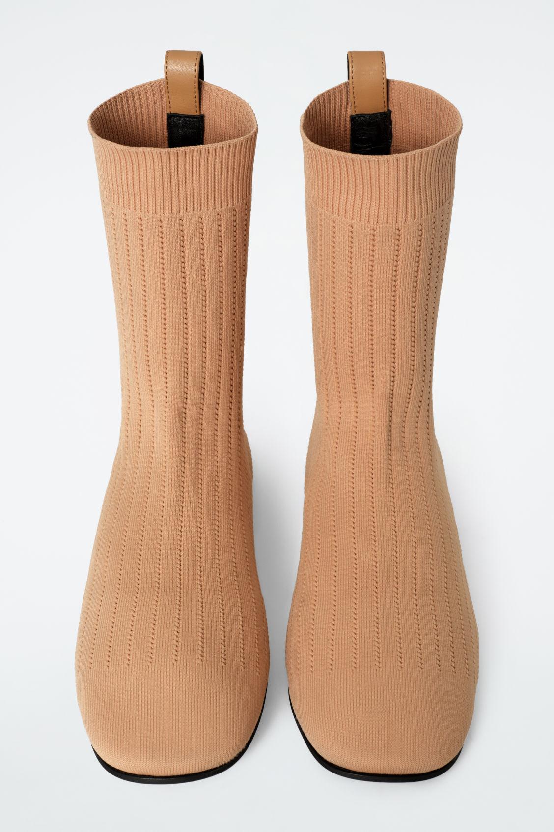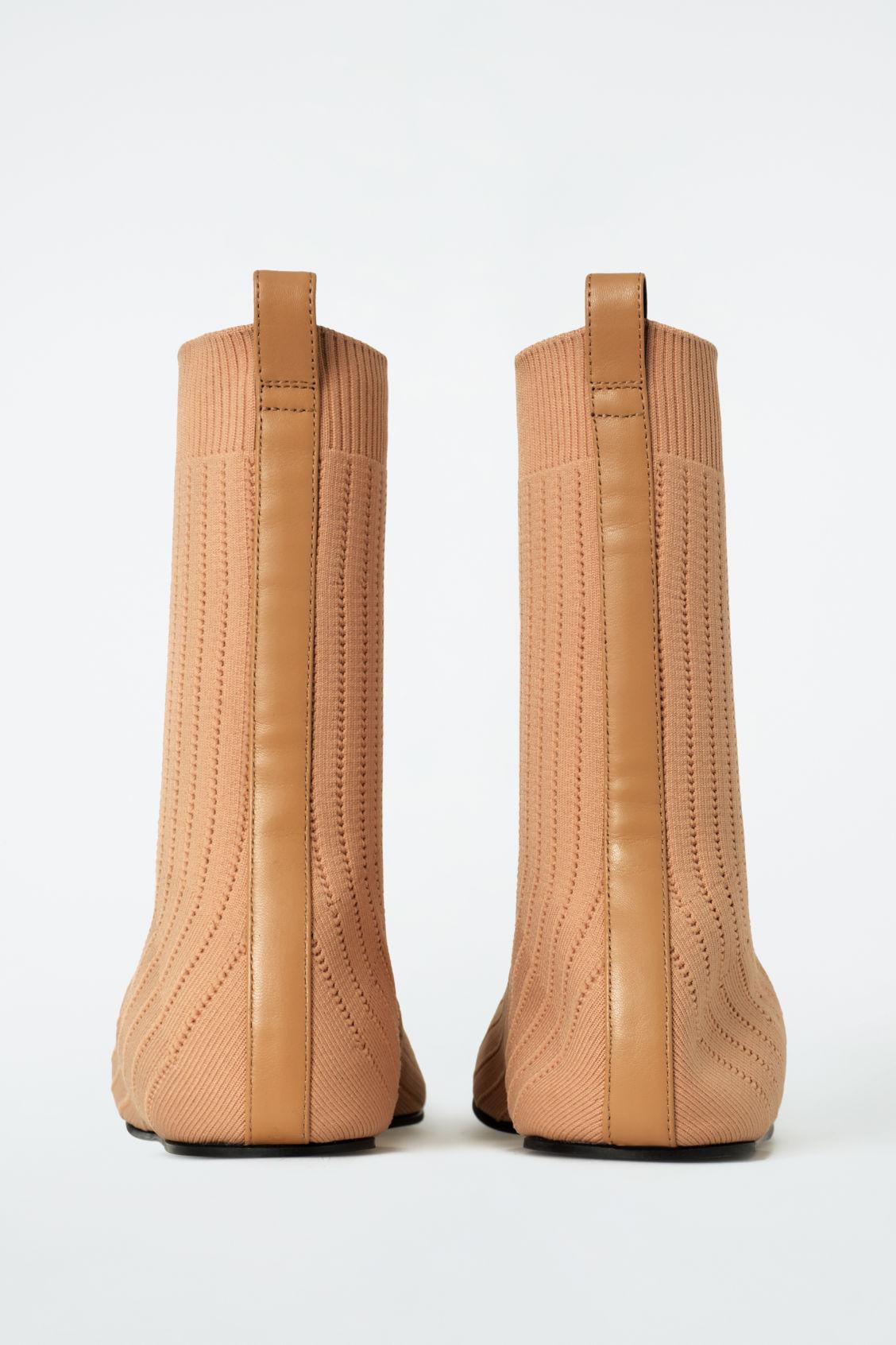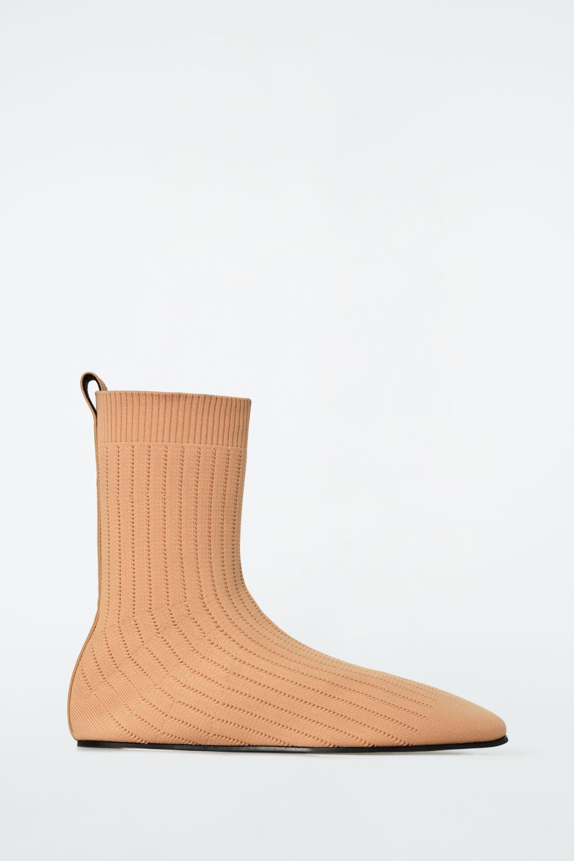 The COS SS25 runway collection builds on the house codes of lasting design and exceptional craftsmanship. These modern sock boots are sculpted from rib-knitted fabric in a soft terracotta tone and designed with elongated leather pull tabs that run along the back of the shoe. Style them with the micro shorts from the capsule. Inner sock with structural supportCOS supports responsible manufacturing via the Leather Working Group Upper: 85% Polyamide (Nylon), 15% LYCRA® Elastane. Lining: 100% Leather. Sole: 80% Leather, 20% Rubber. Excluding trims