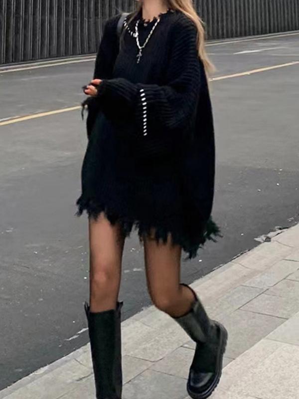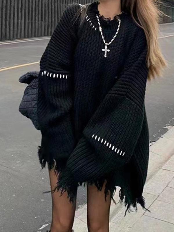 Ribbed Tattered Fringed Loose Sweater