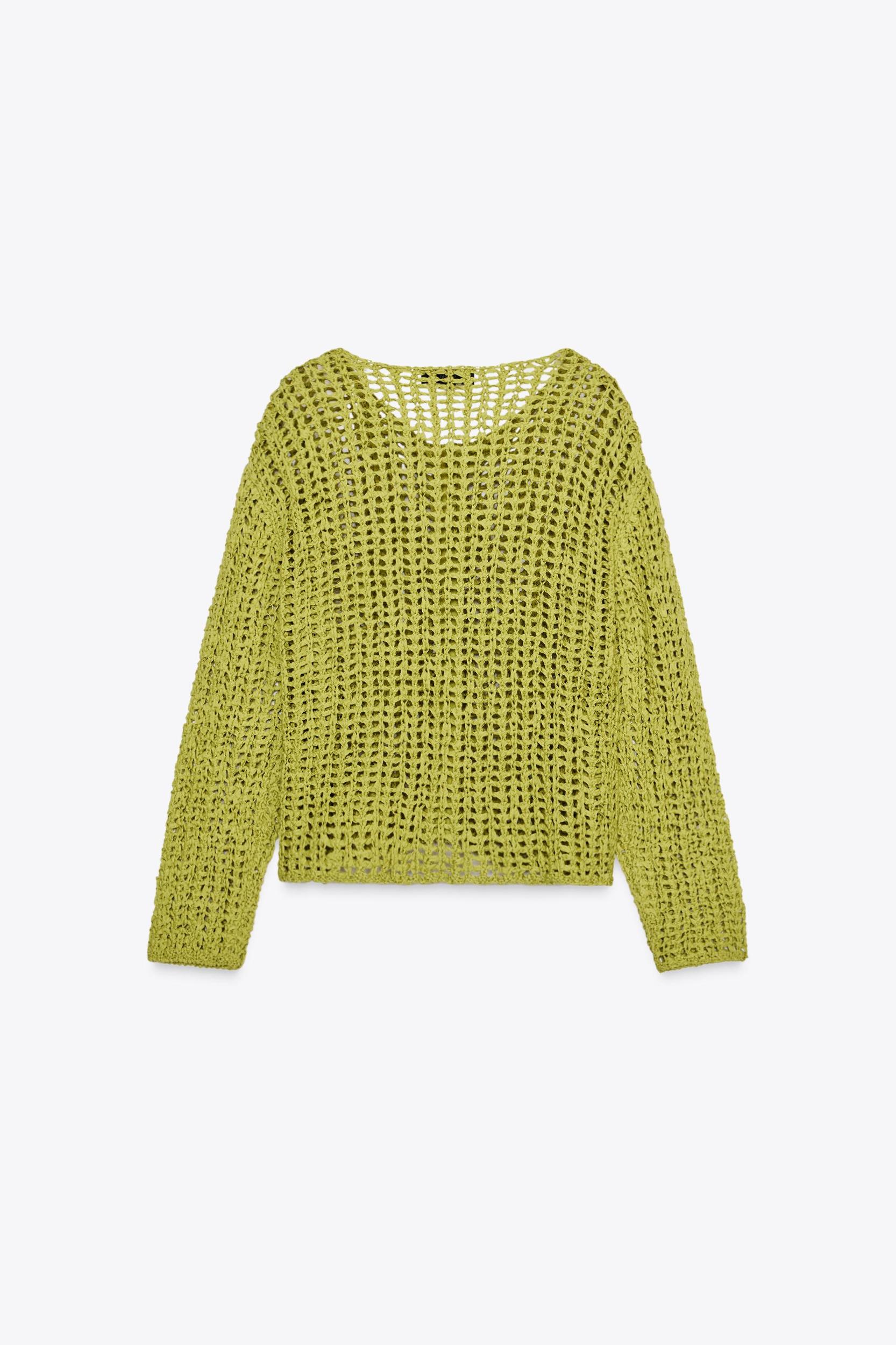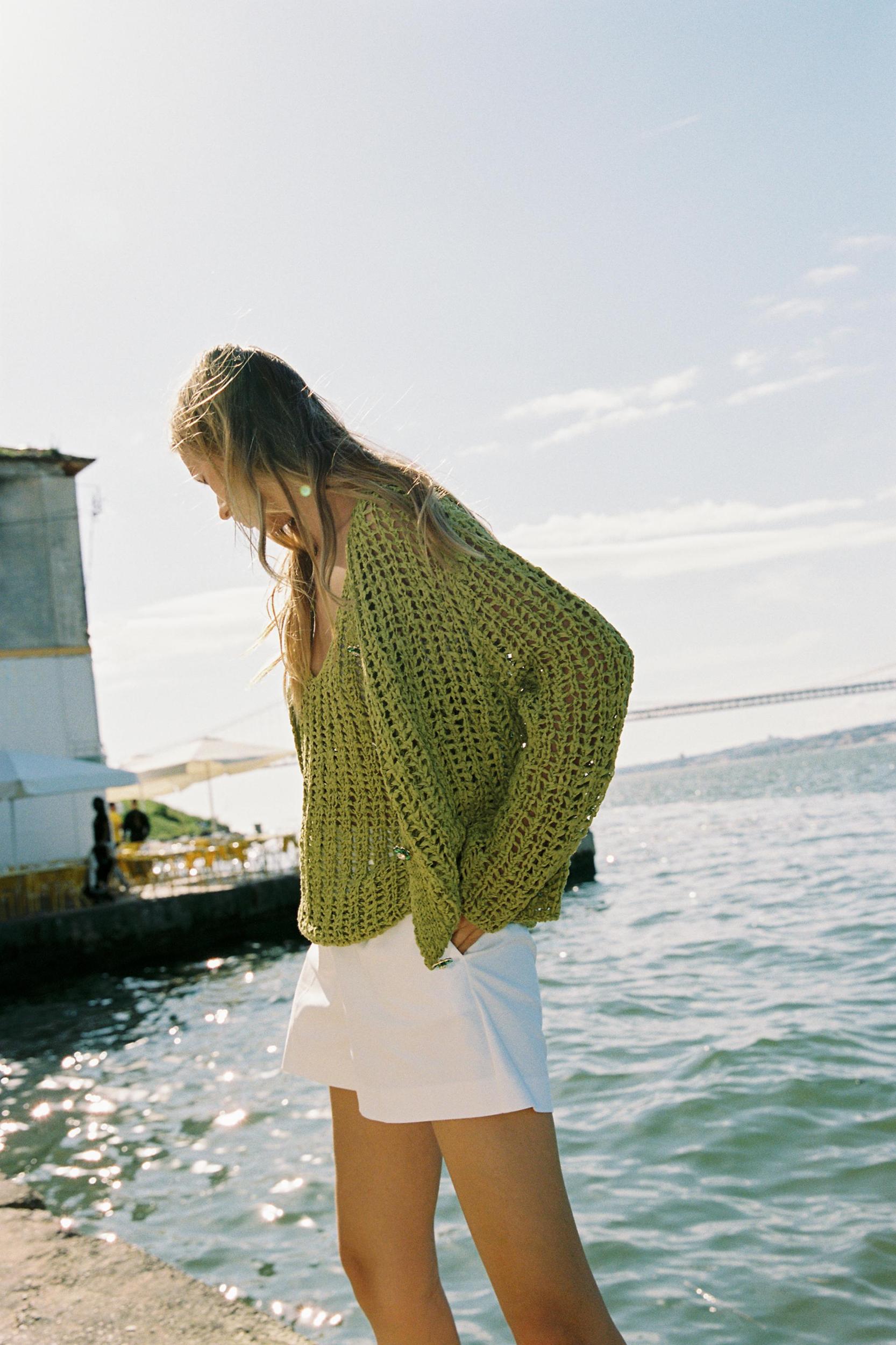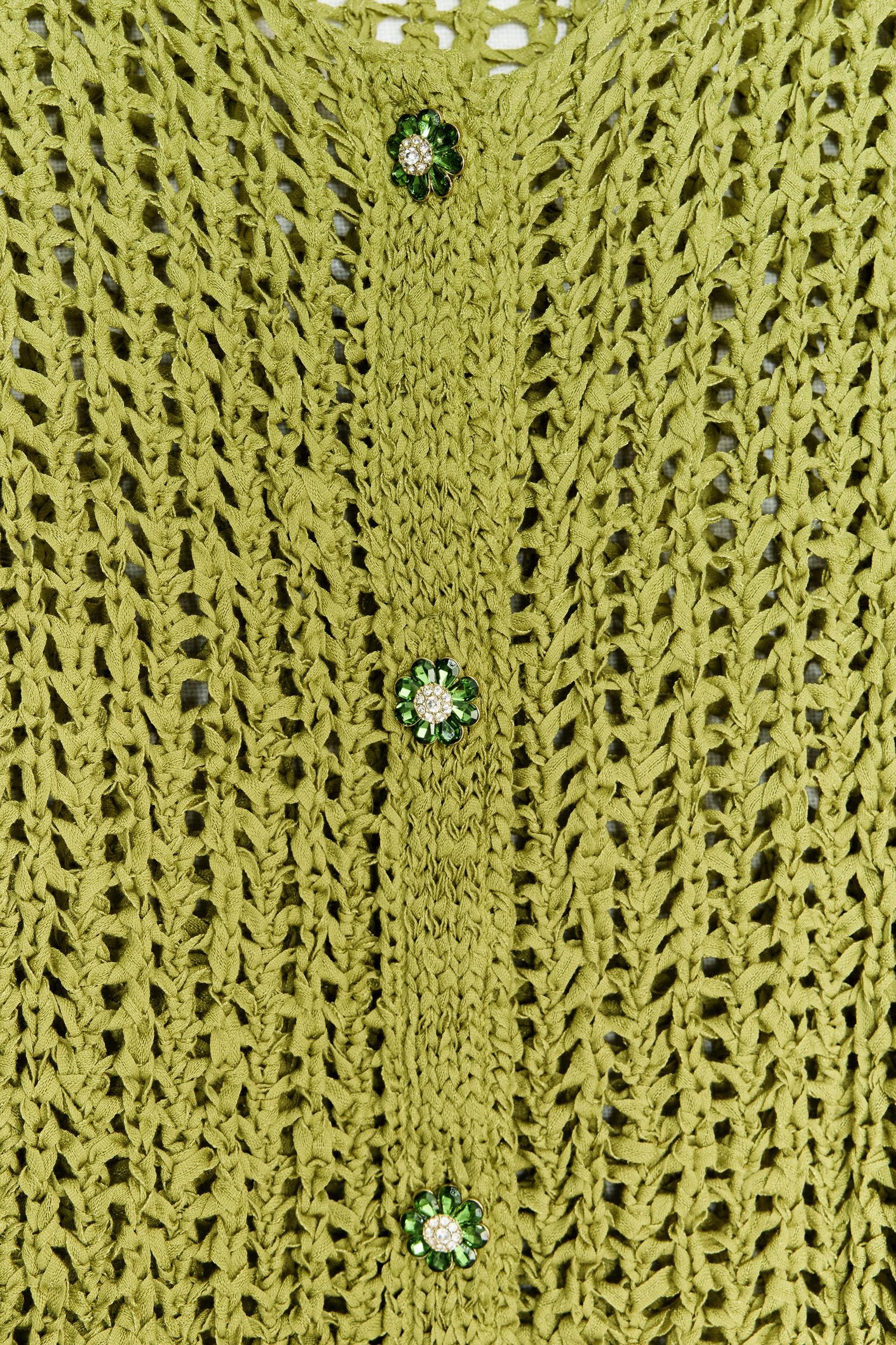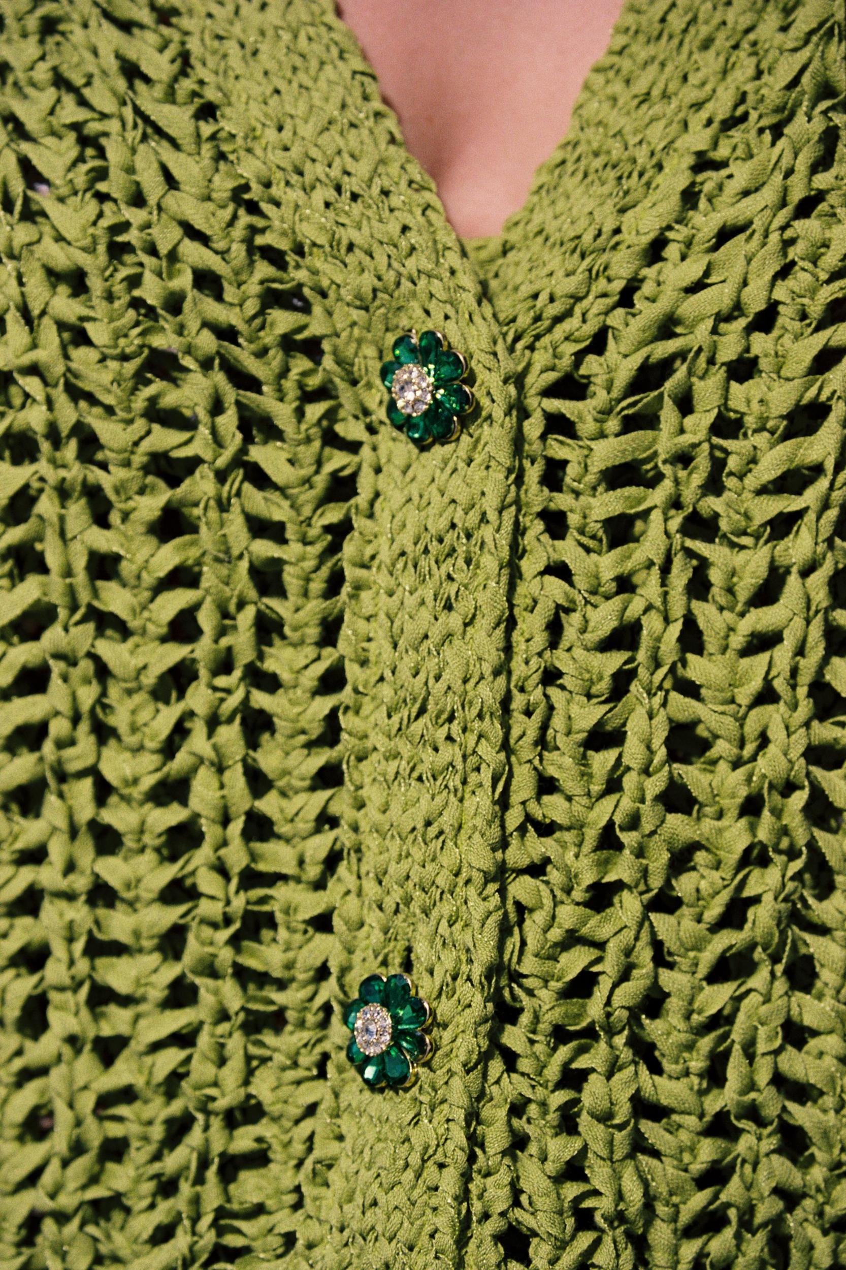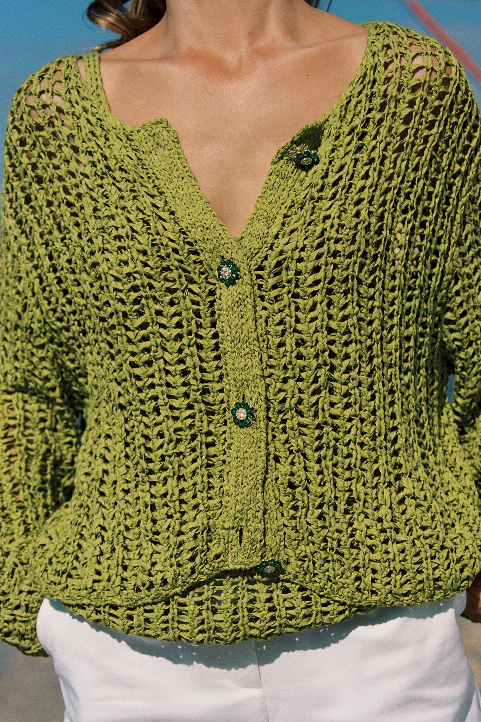 Round neck, long sleeve jacket. Front closure with jewel buttons.