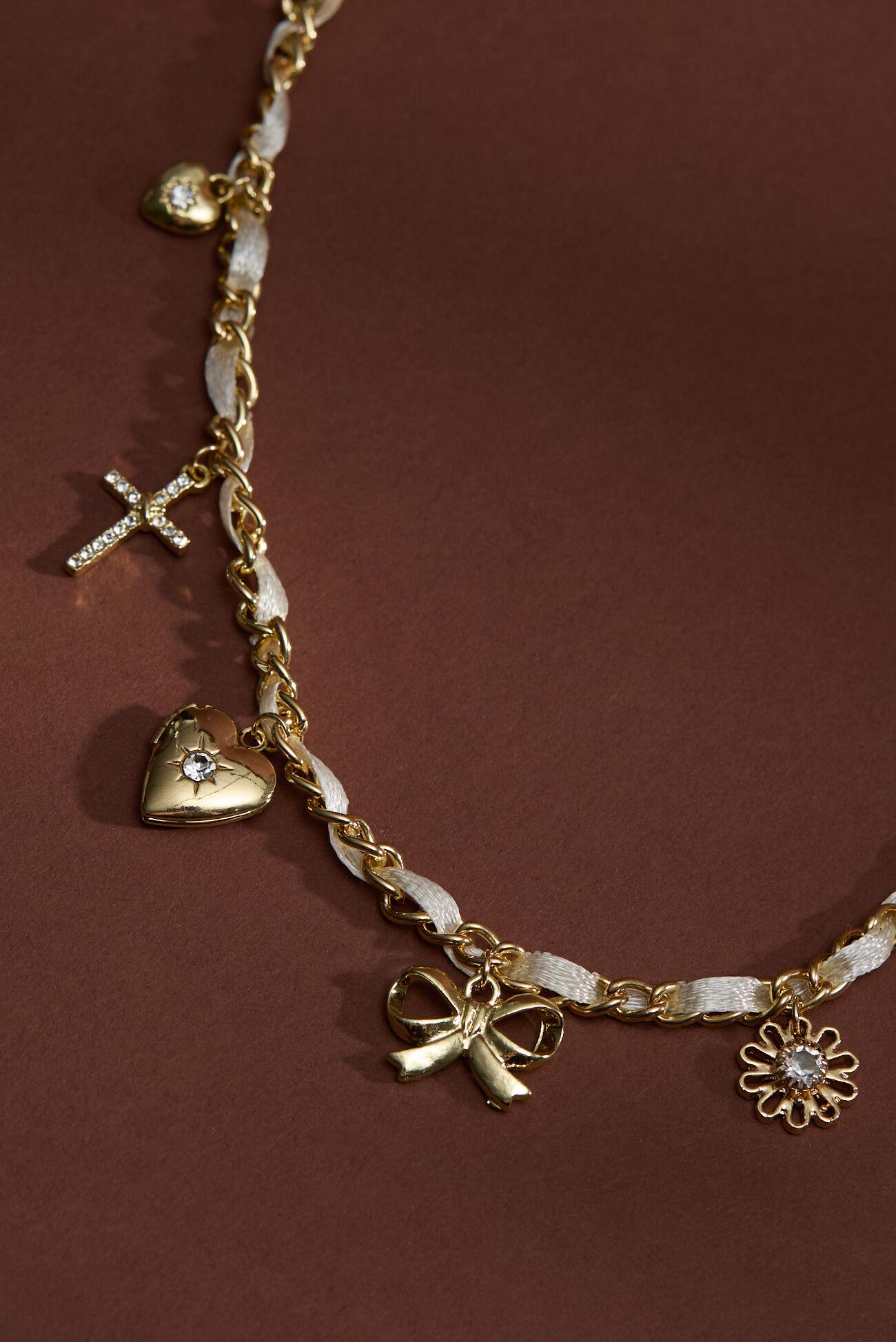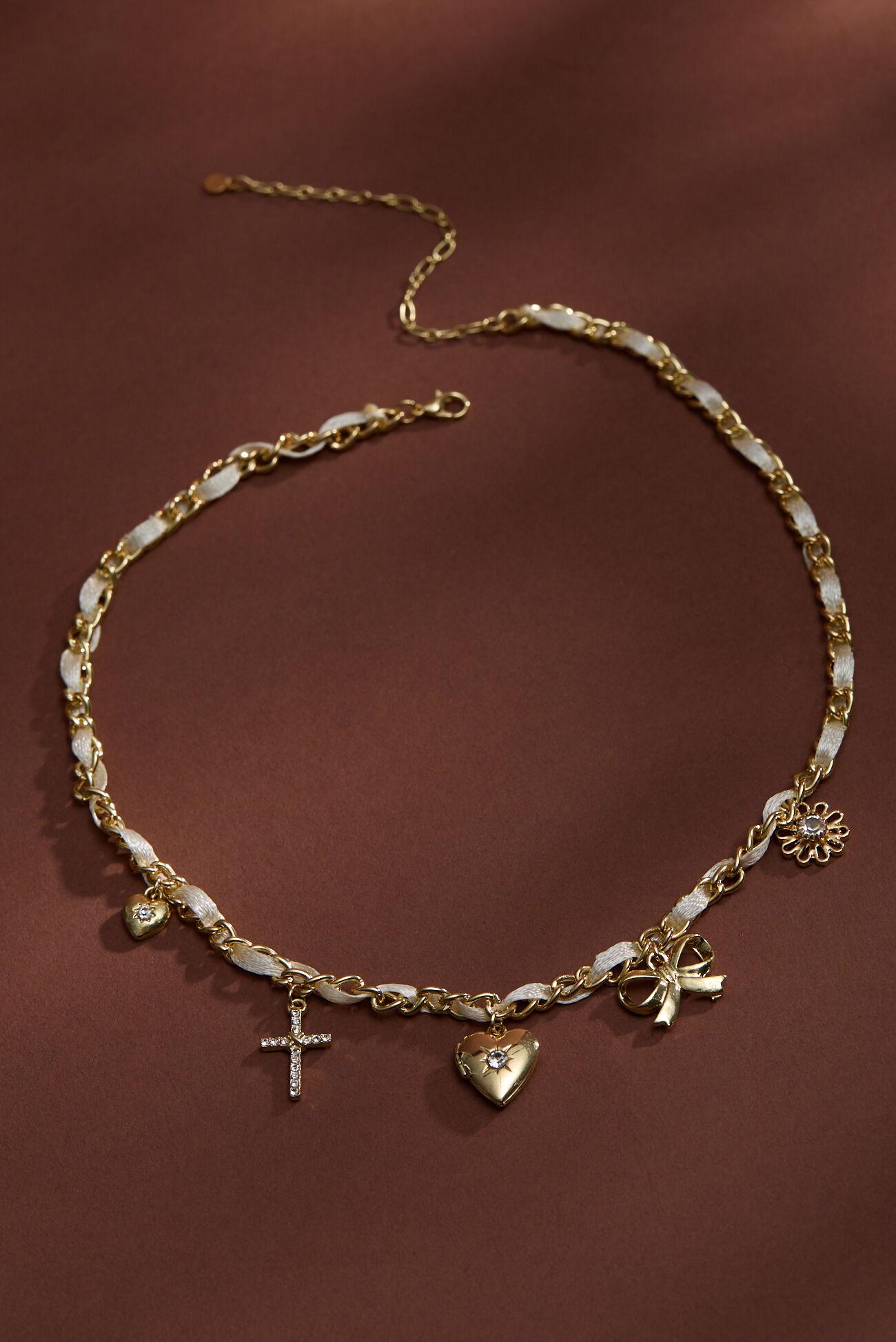 This statement piece is where soft meets bold. A luxe ribbon weaves through golden chain links, finished with playful charm dangles that sway with every step. Whether you're dressing up denim or layering over a sundress, this necklace brings effortless charm to your everyday style.