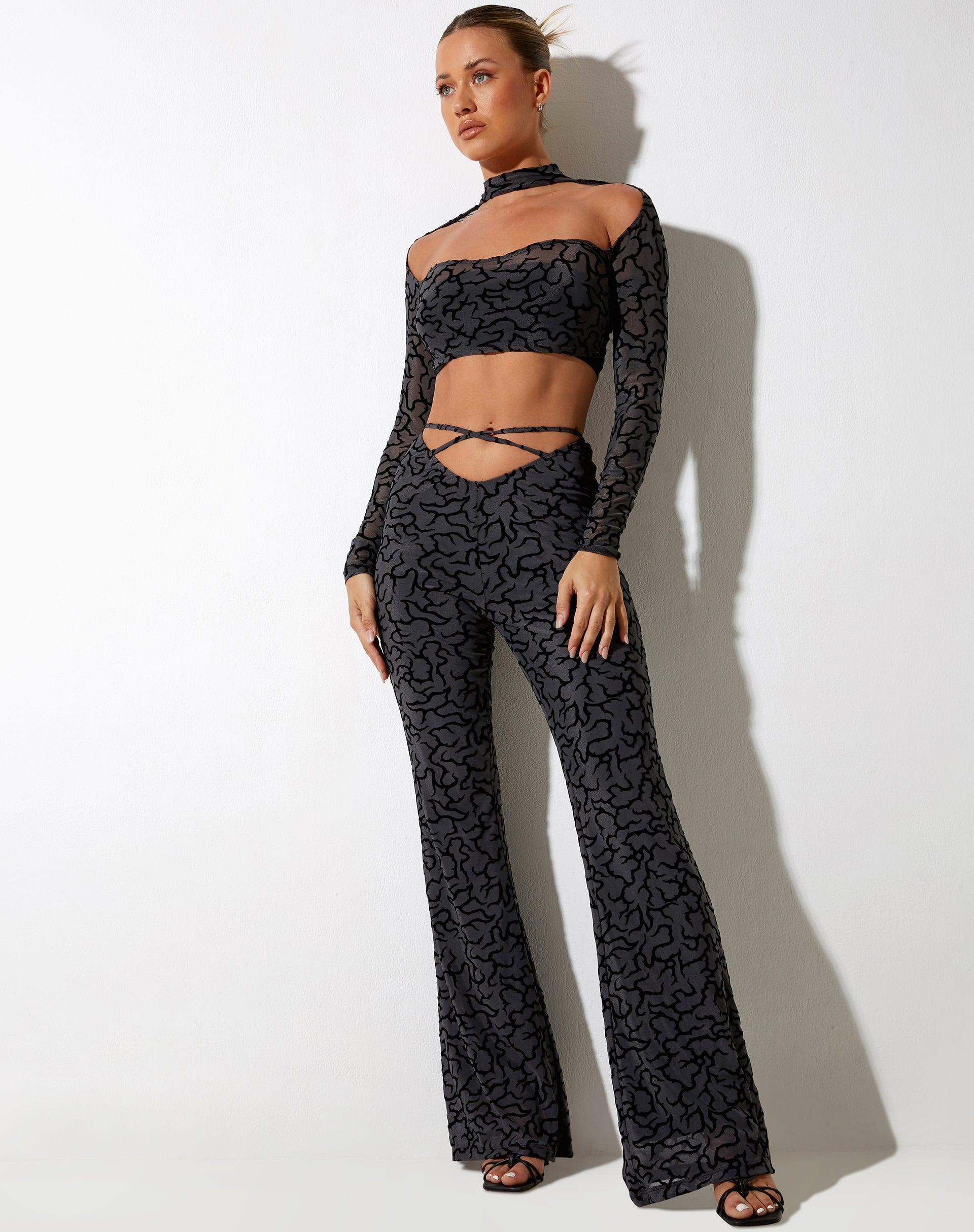 Hit refresh on your weekend wardrobe with our Ribus top. Featuring a cropped fit with long sleeves and cut out detailing in a grey tribal flock print. Style with the Nancha trousers for the perfect co-ord. MODEL WEARS:S - MODEL HEIGHT:5'8 - FABRIC CONTENT:100% POLYESTER