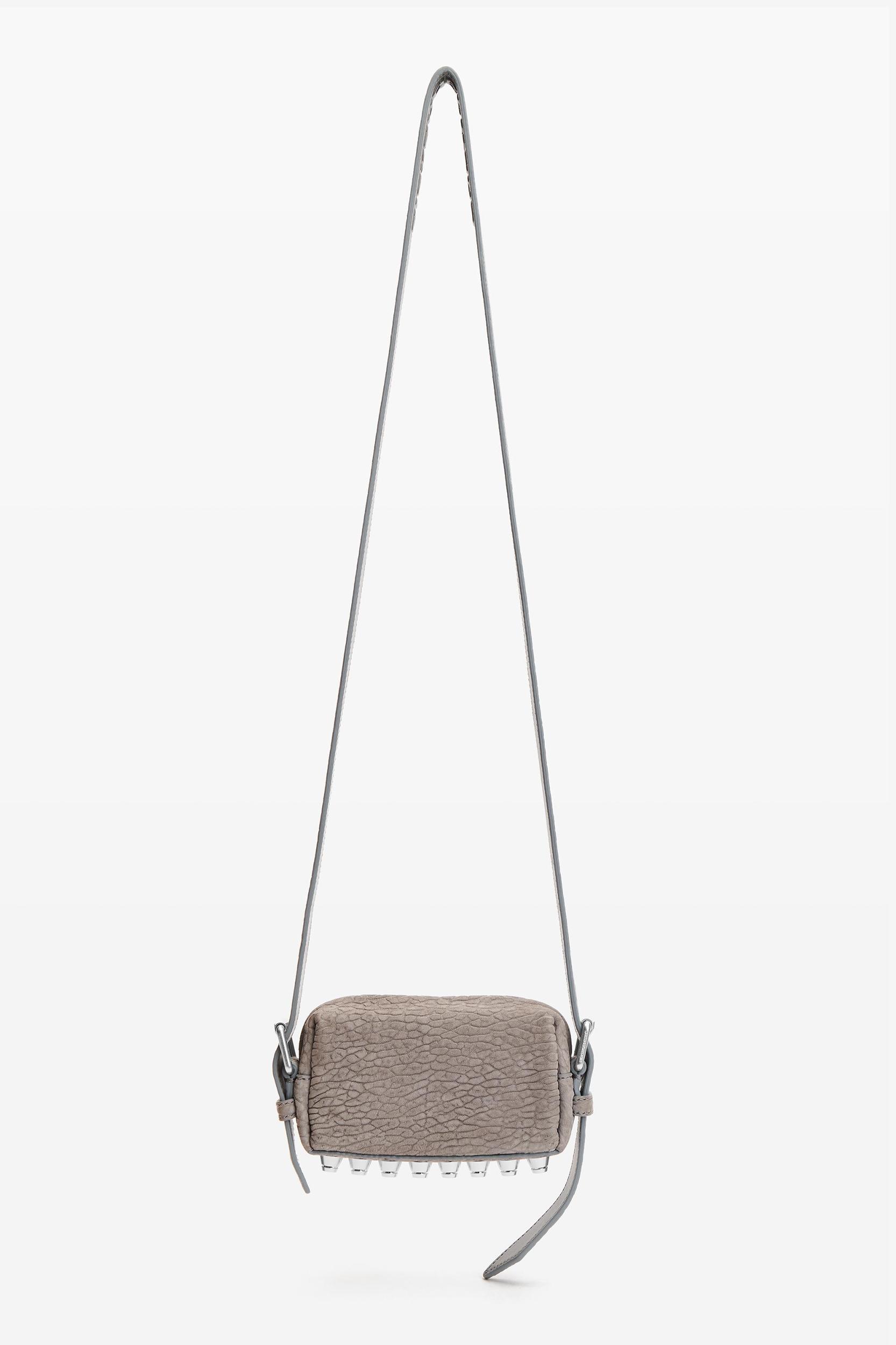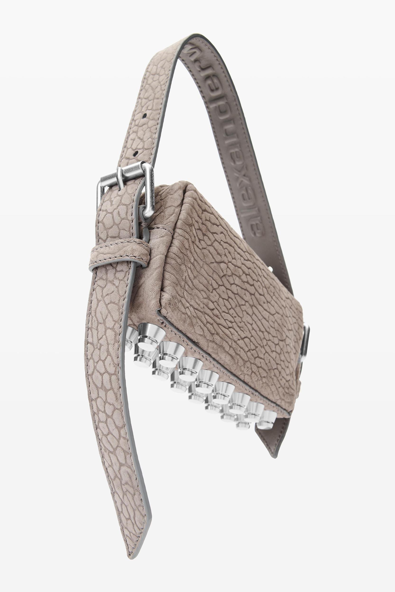 signature trap studs amplify the bottom panel of this grey ricco mini crossbody bag, crafted of primal lambskin leather.
